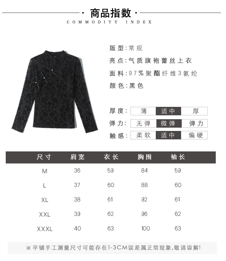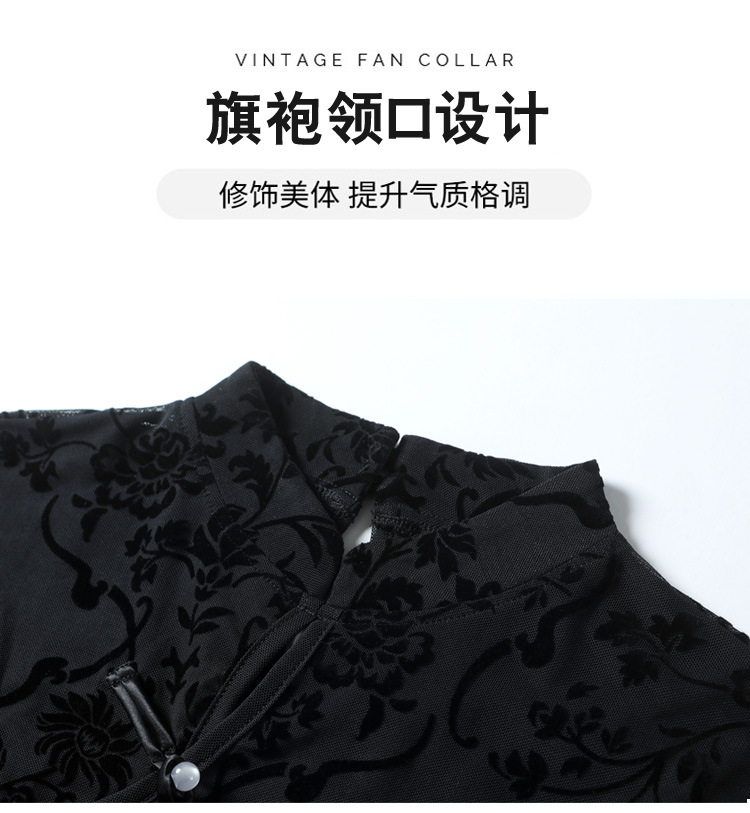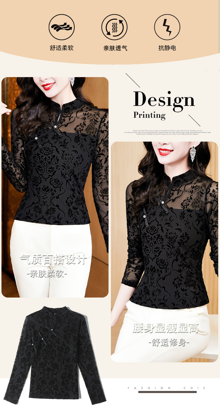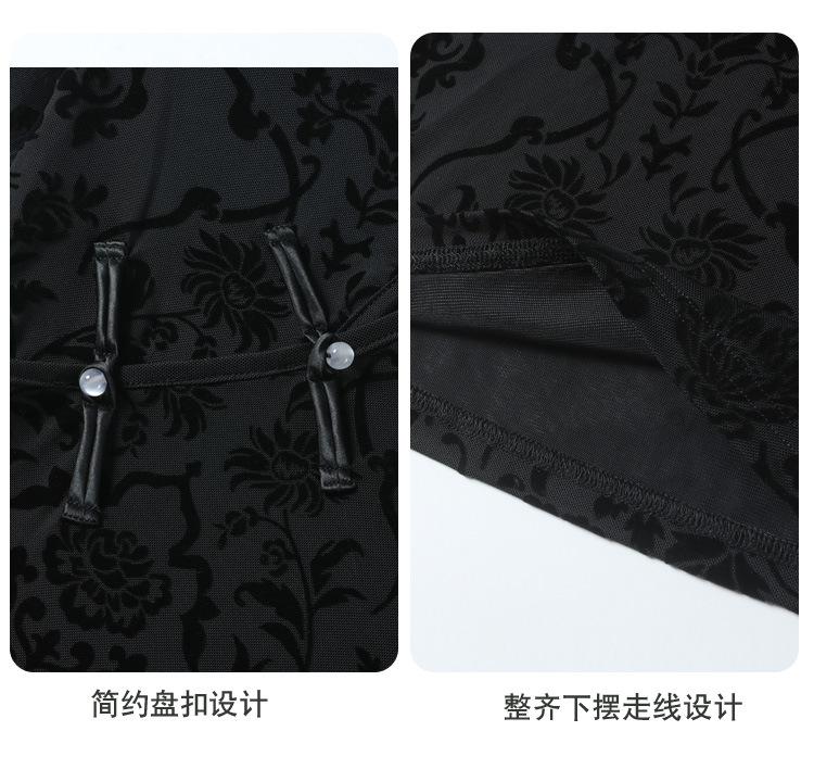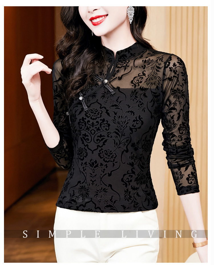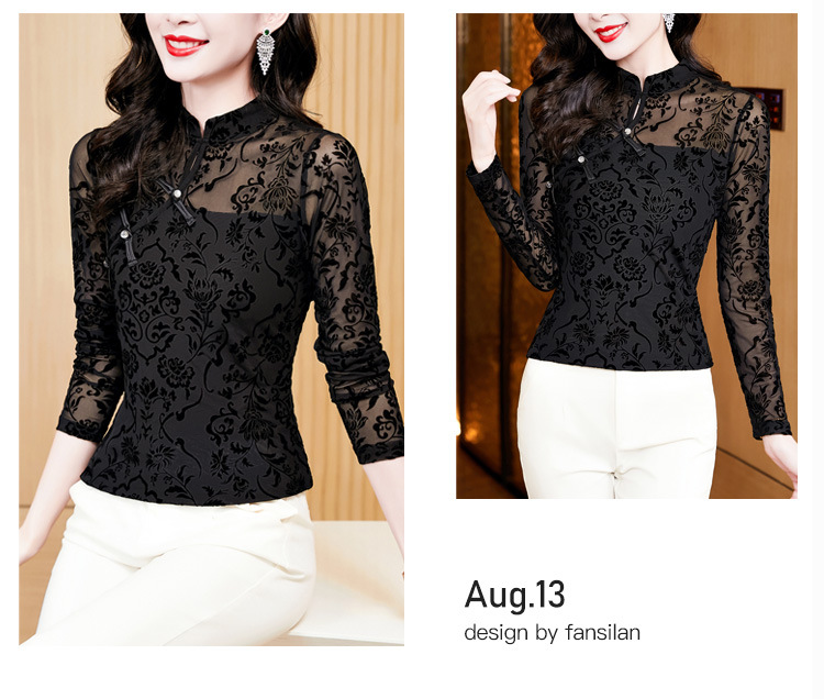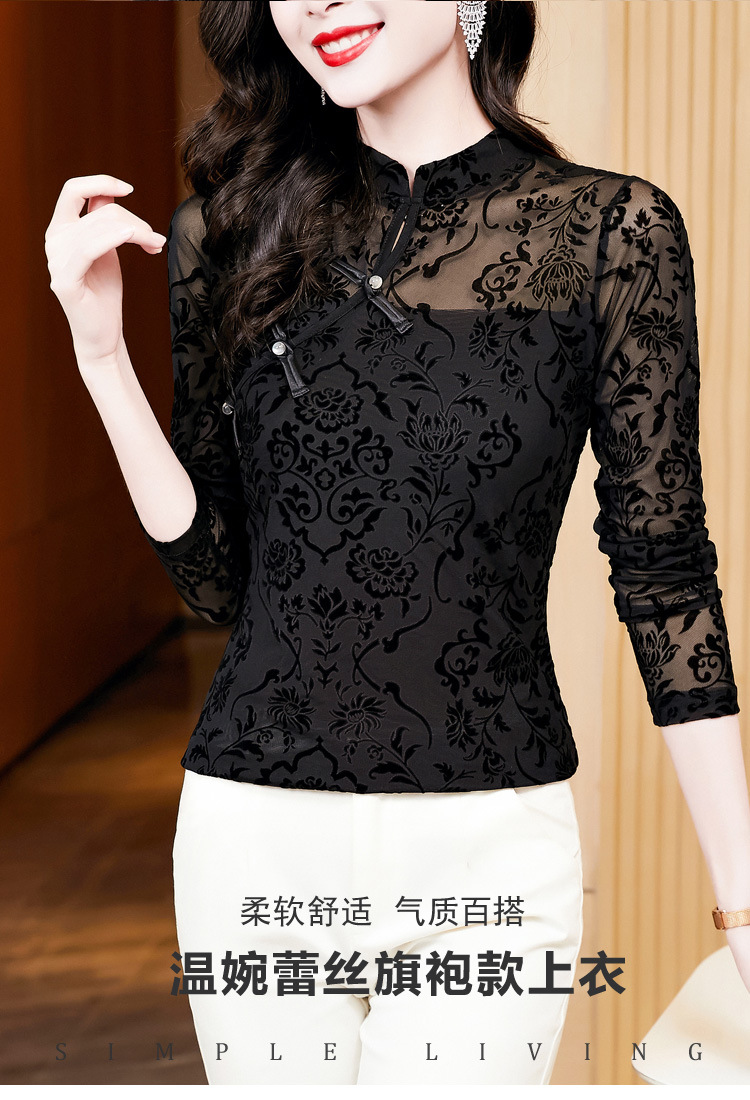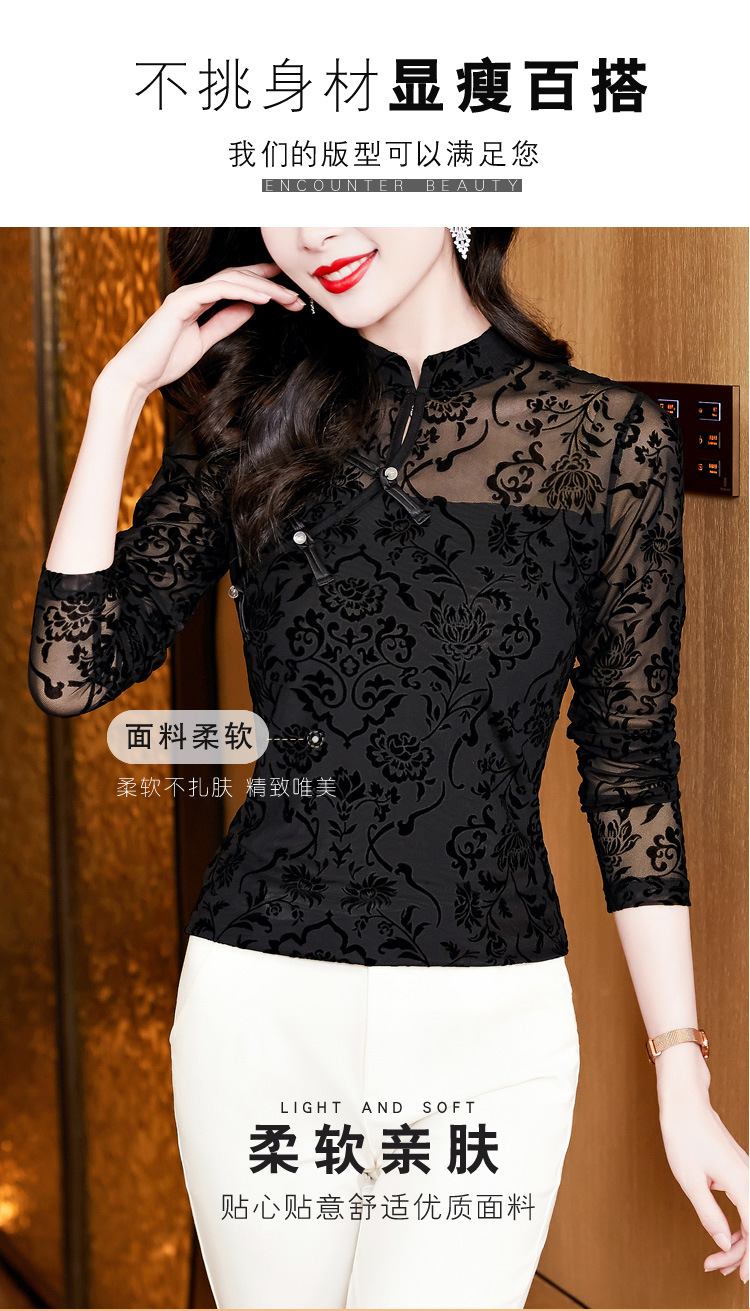 秋季新款,中式百搭黑色镂空植绒网纱盘扣长袖打底衫女t恤KQL-E37M2662