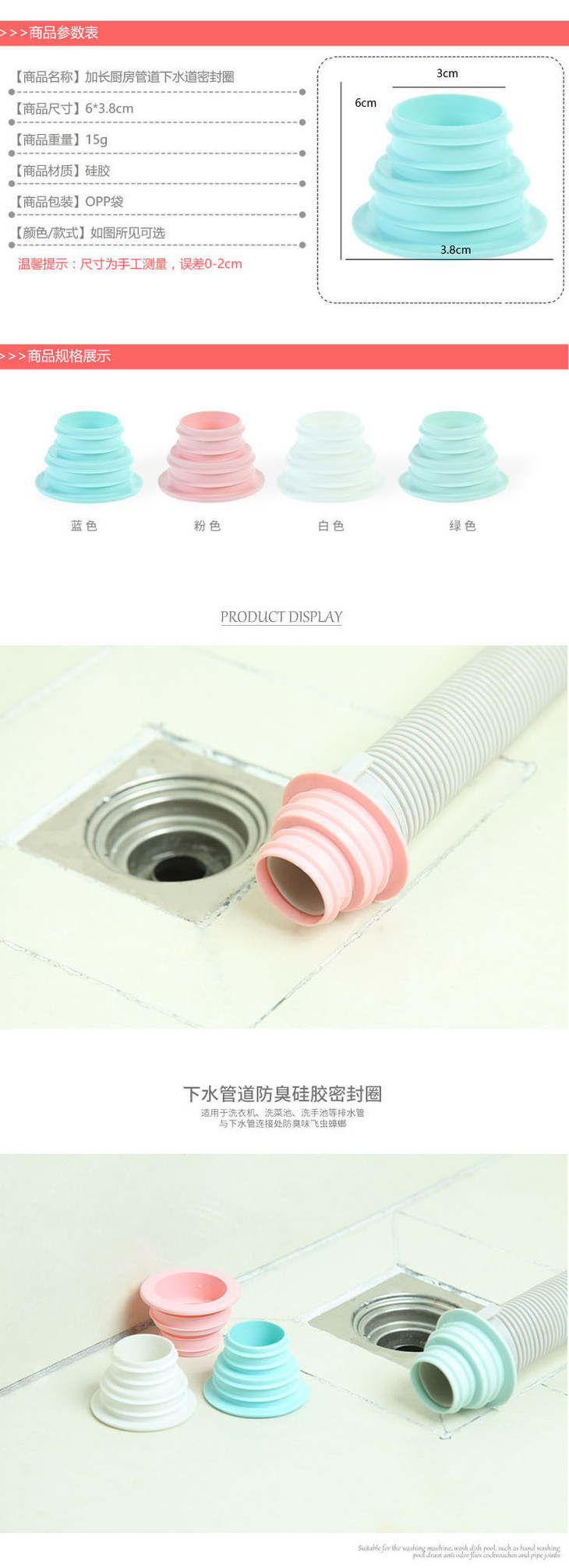 熊诺 加长厨房下水道密封圈管道防臭密封塞洗衣4支装 (颜色随机)ZMXLFCMFS4