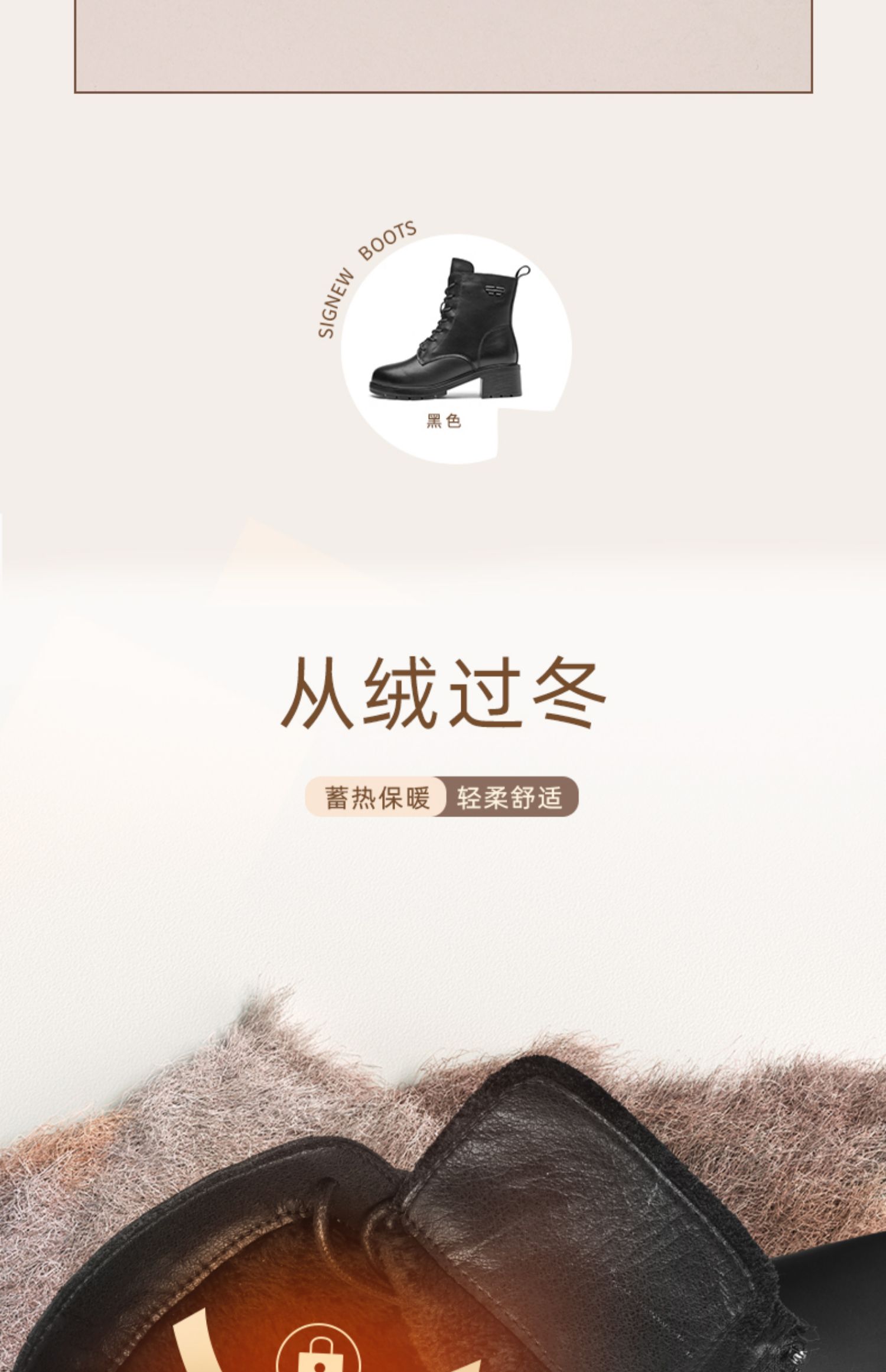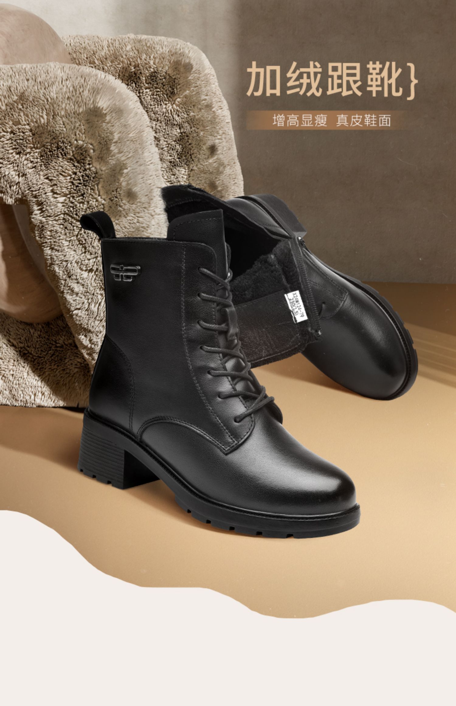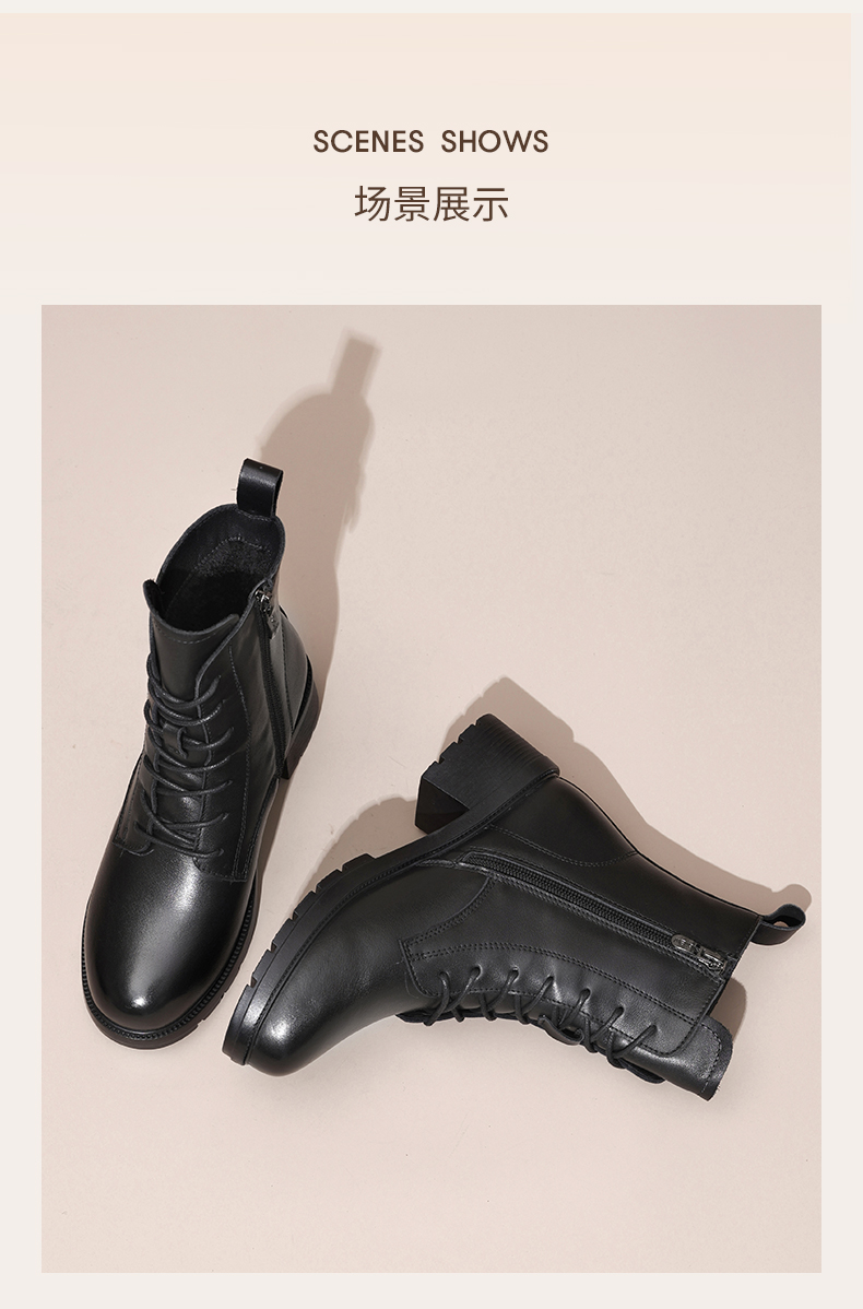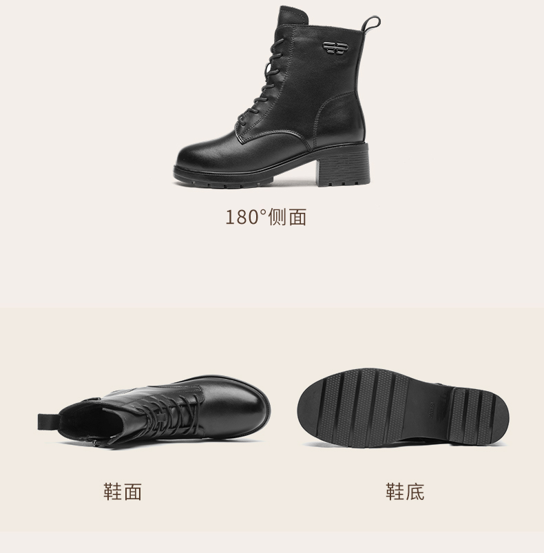 信诺舒适真皮女鞋2024新款冬季加绒时装靴粗跟系带短靴妈妈棉鞋女X24M124-79