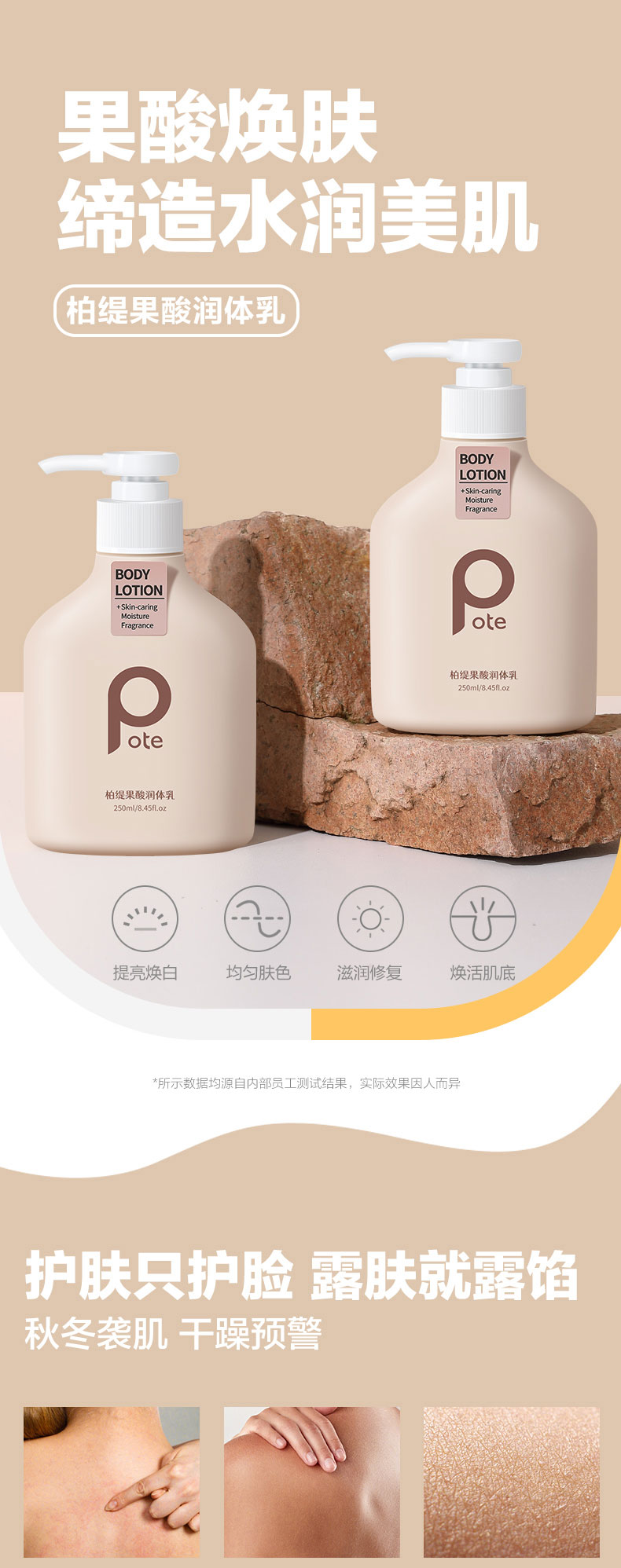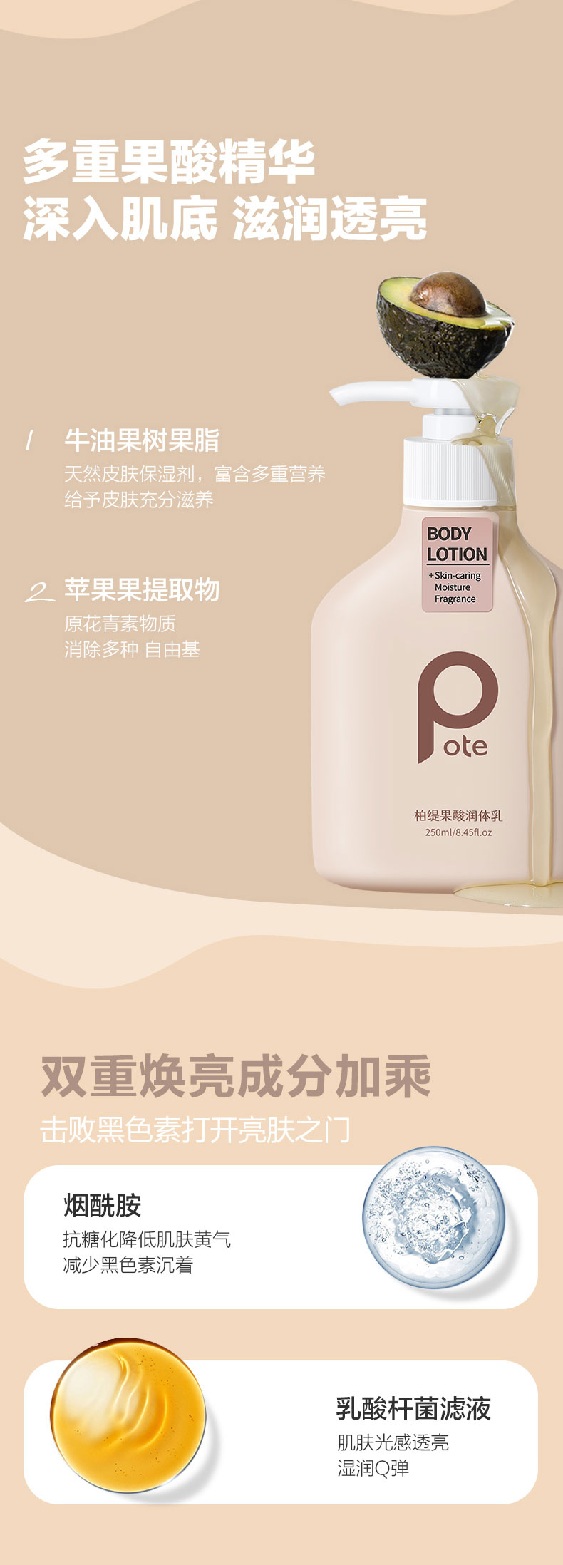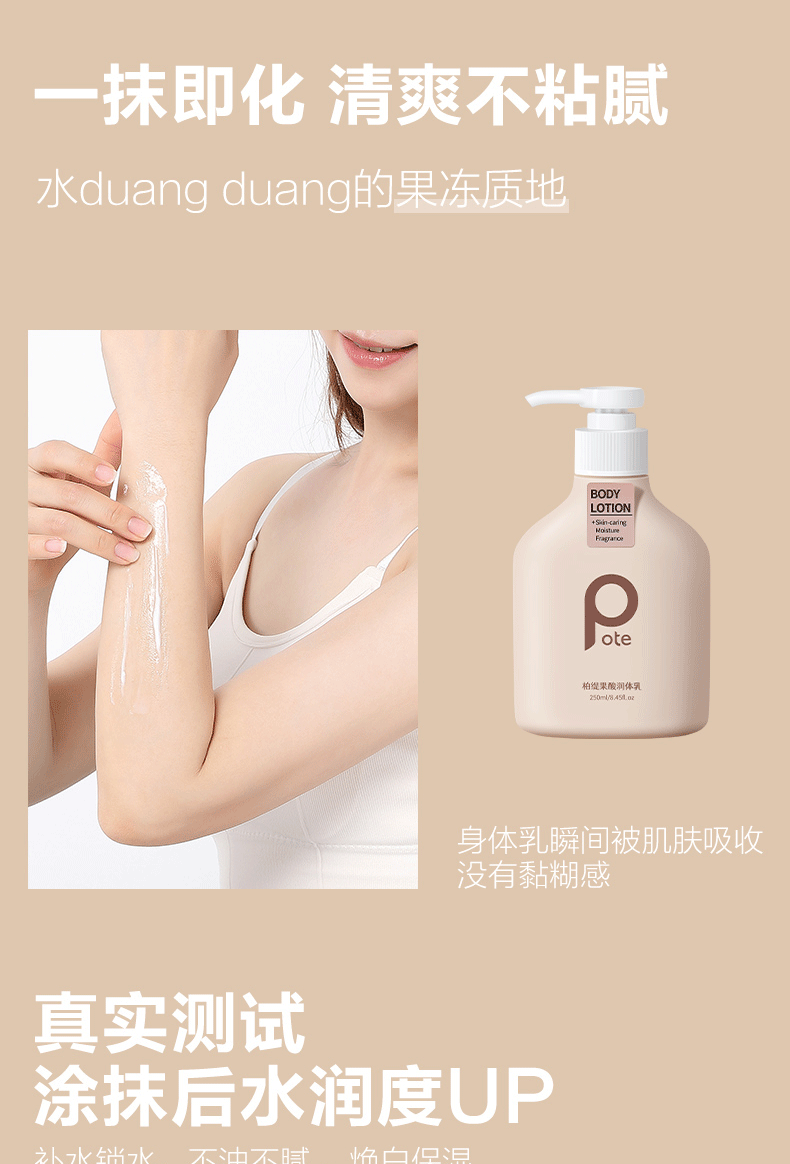 【抹出亮白光滑肌肤】pote柏缇果酸润身体乳 保湿滋润 持久留香 润肤乳250ml