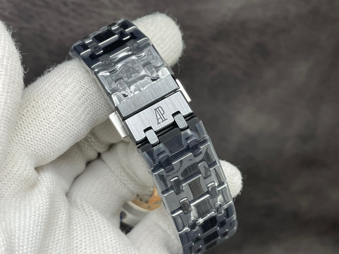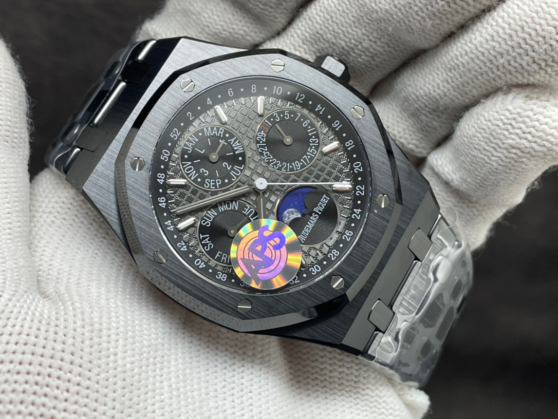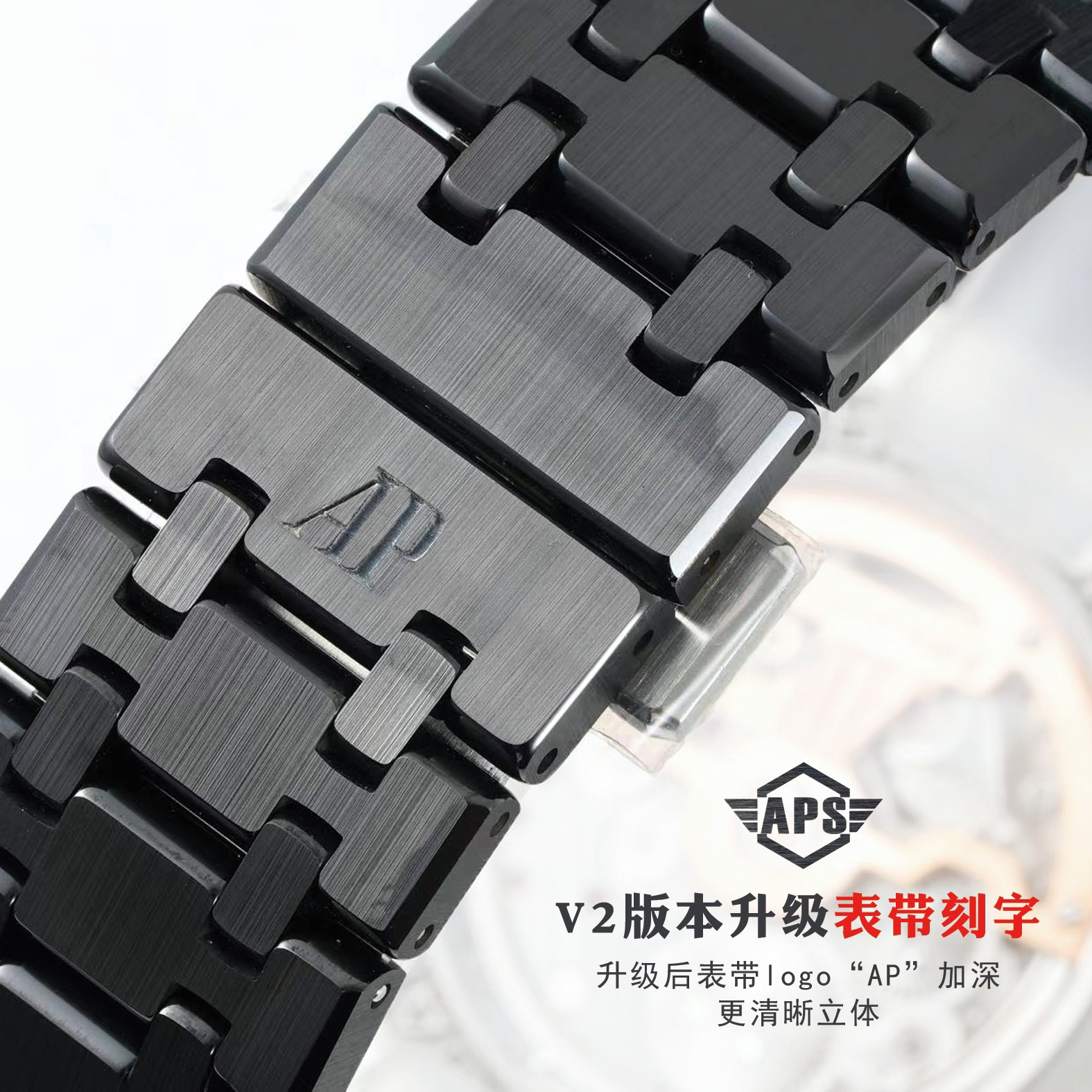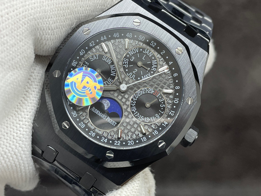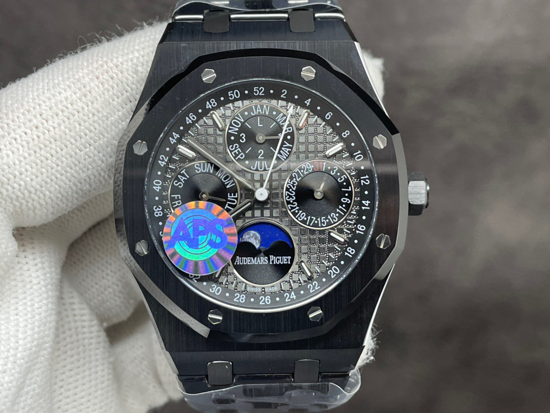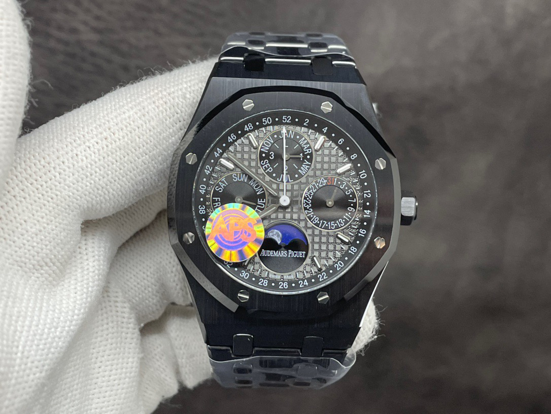 APS 爱彼 黑陶瓷26579 真月相 皇家橡树系列在“Grande Tapisserie”大格纹装饰表盘上,日期、星期、月份、月相,和四个眼睛的位置与原装同步