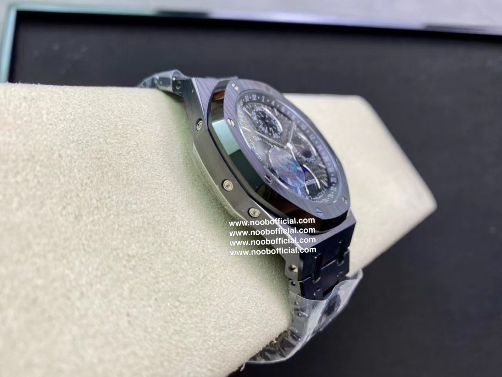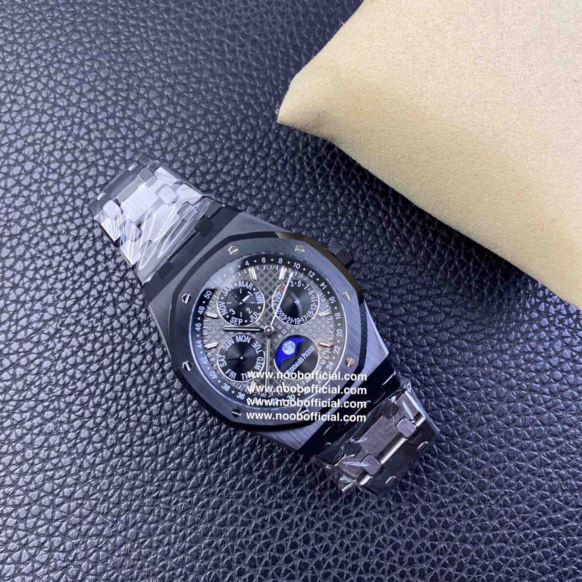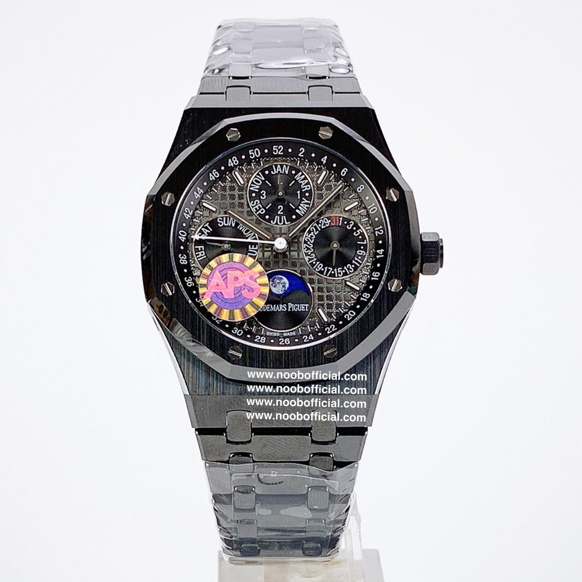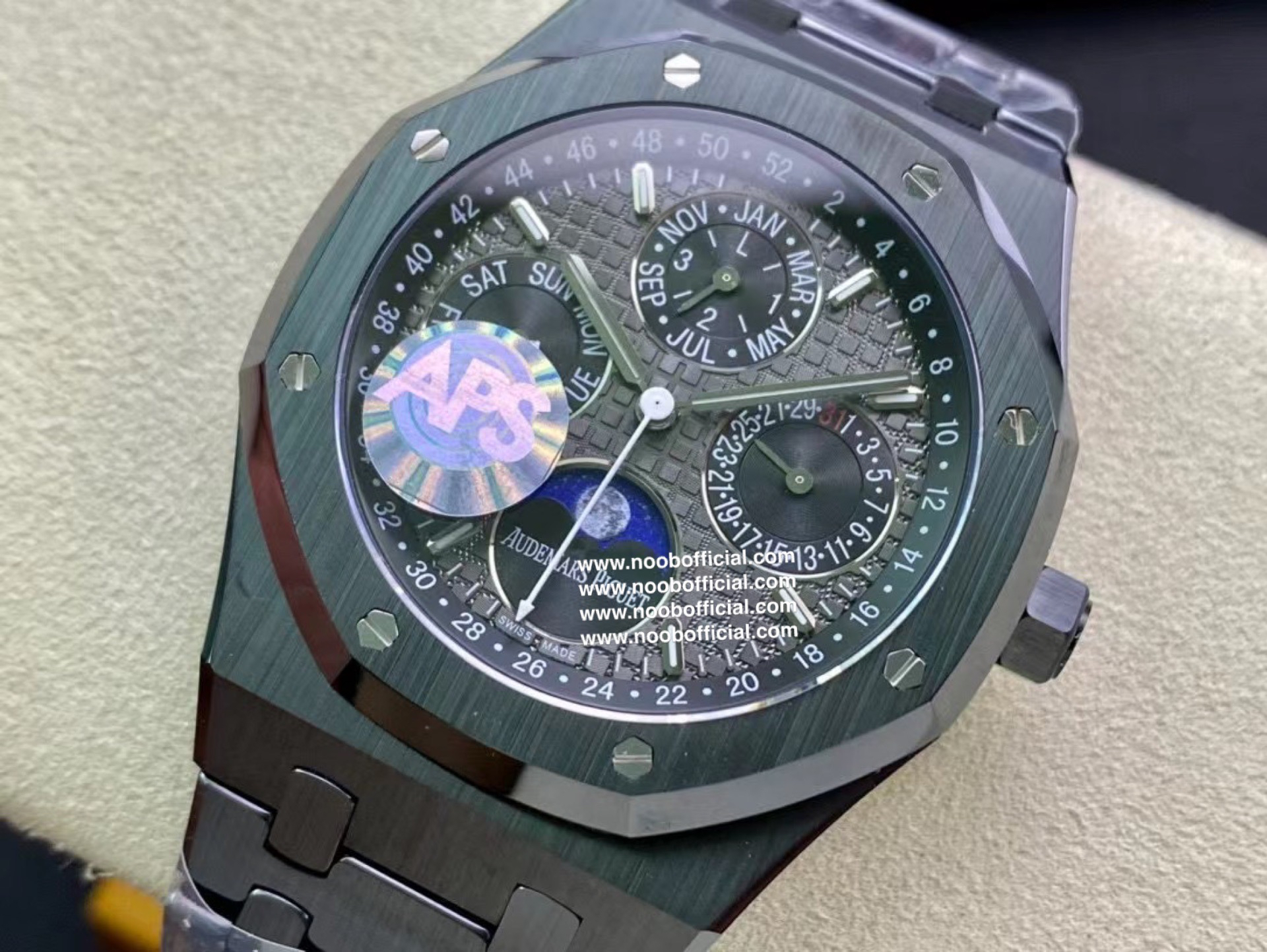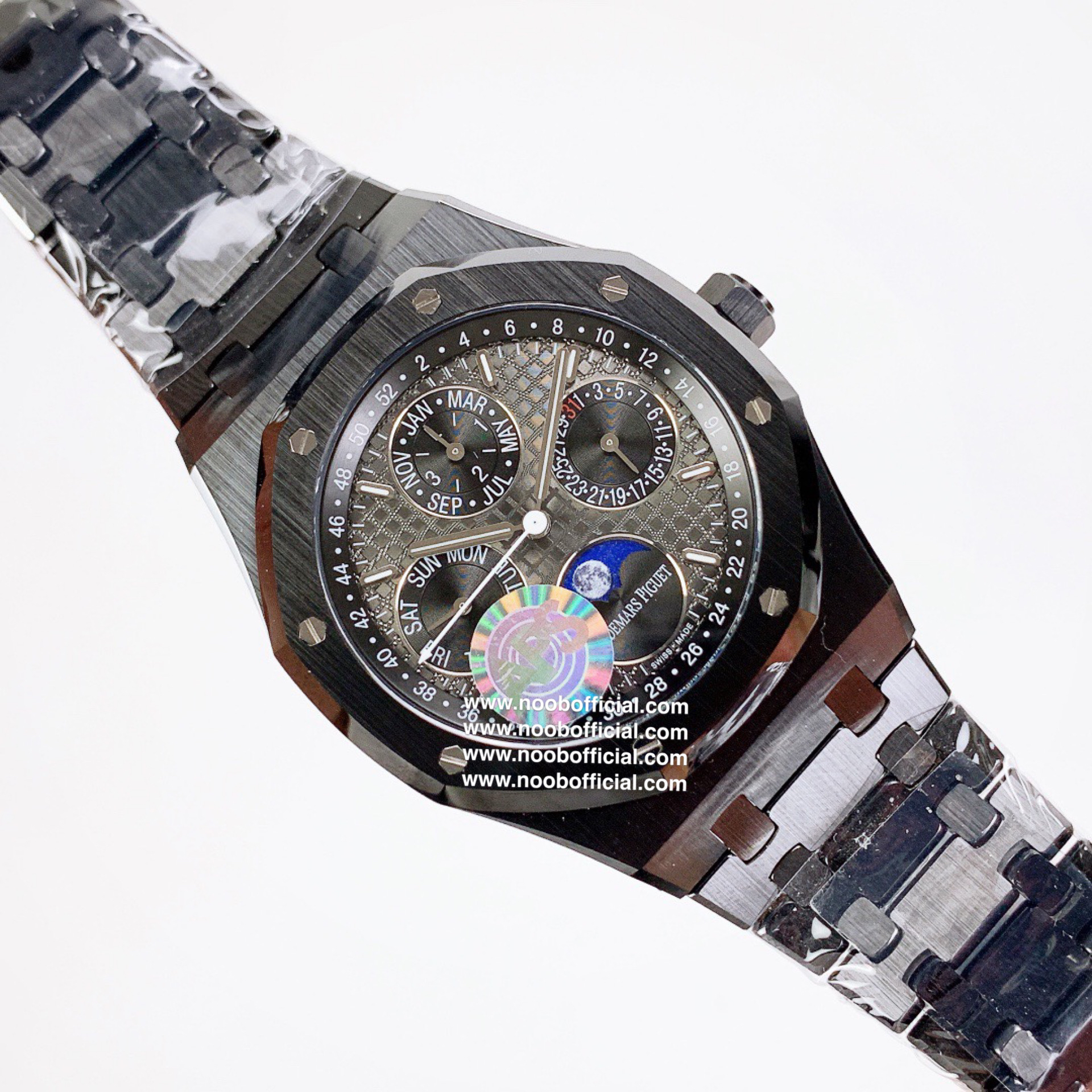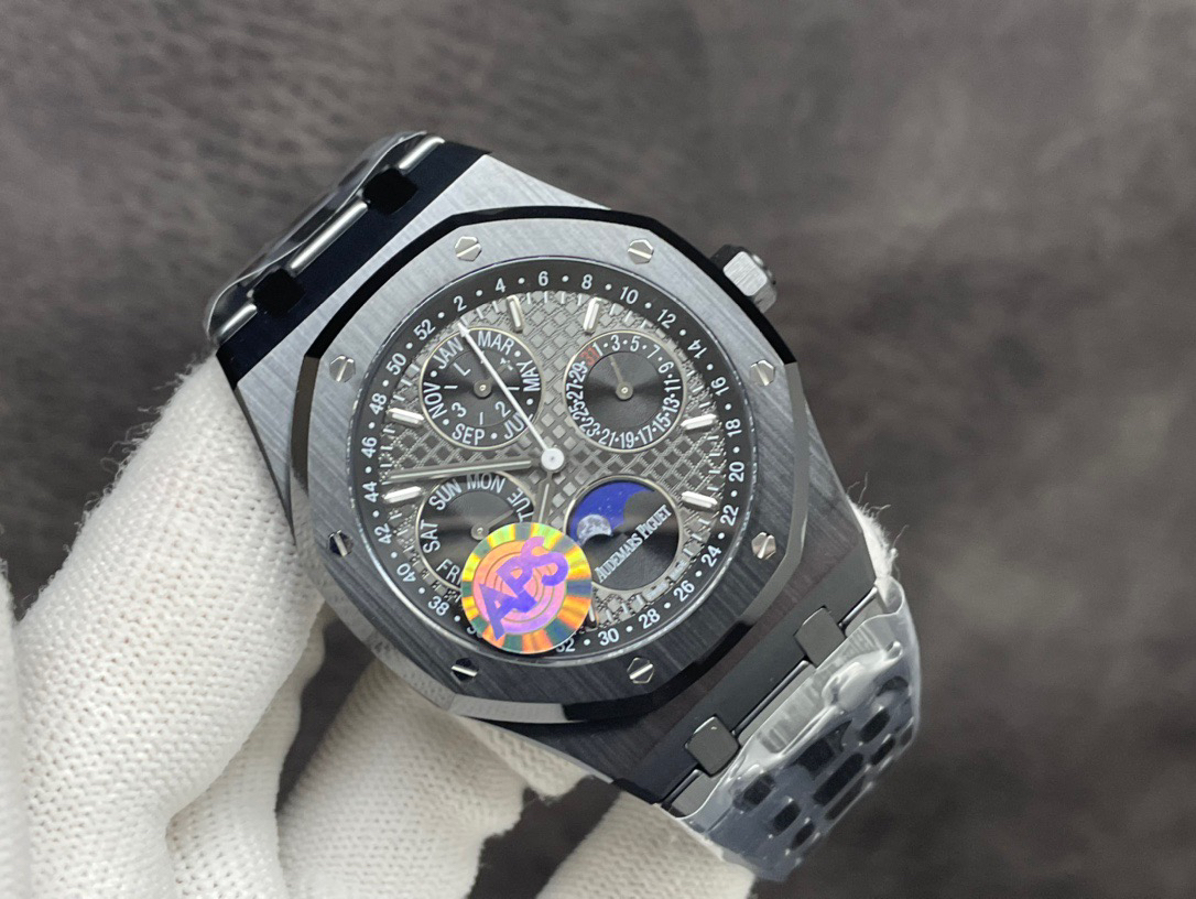 APS 爱彼 黑陶瓷26579 真月相 皇家橡树系列在“Grande Tapisserie”大格纹装饰表盘上,日期、星期、月份、月相,和四个眼睛的位置与原装同步