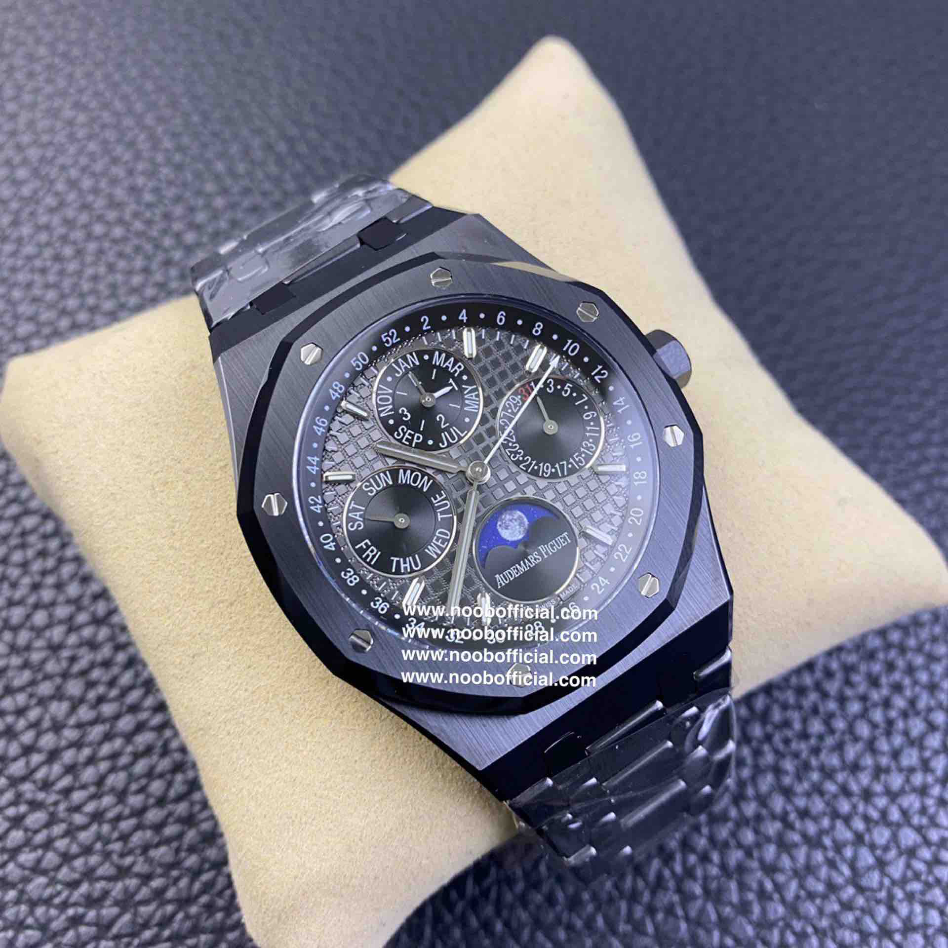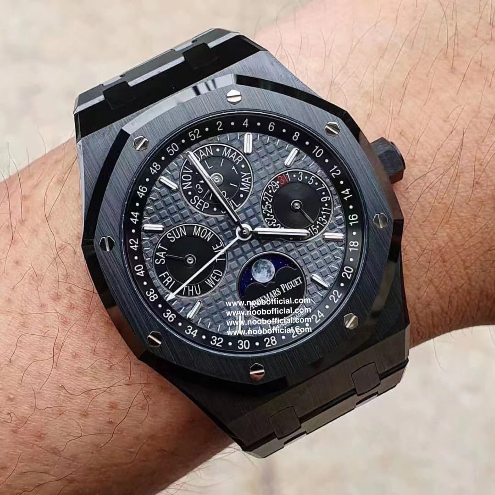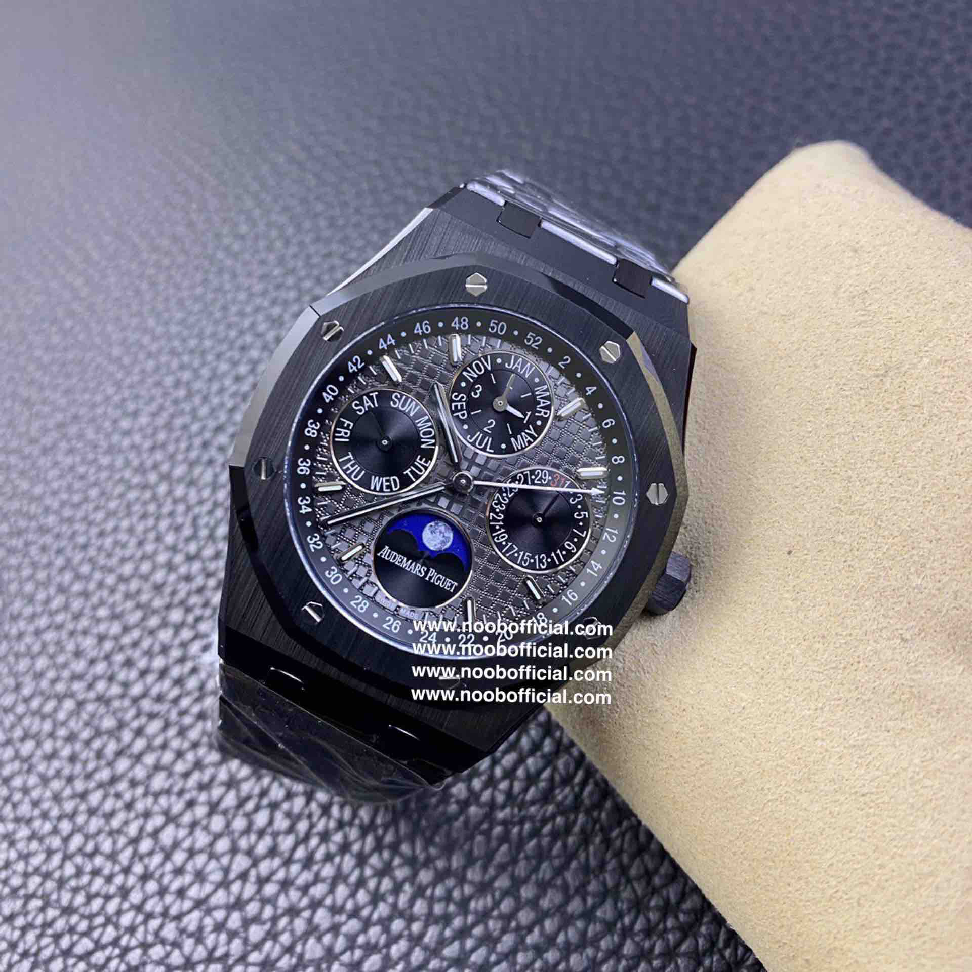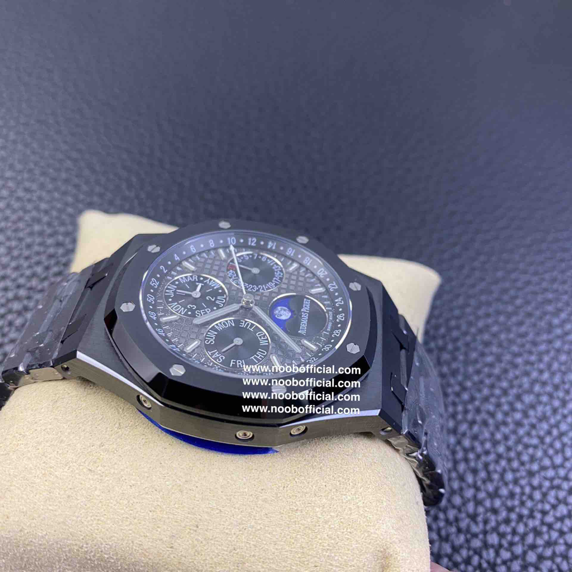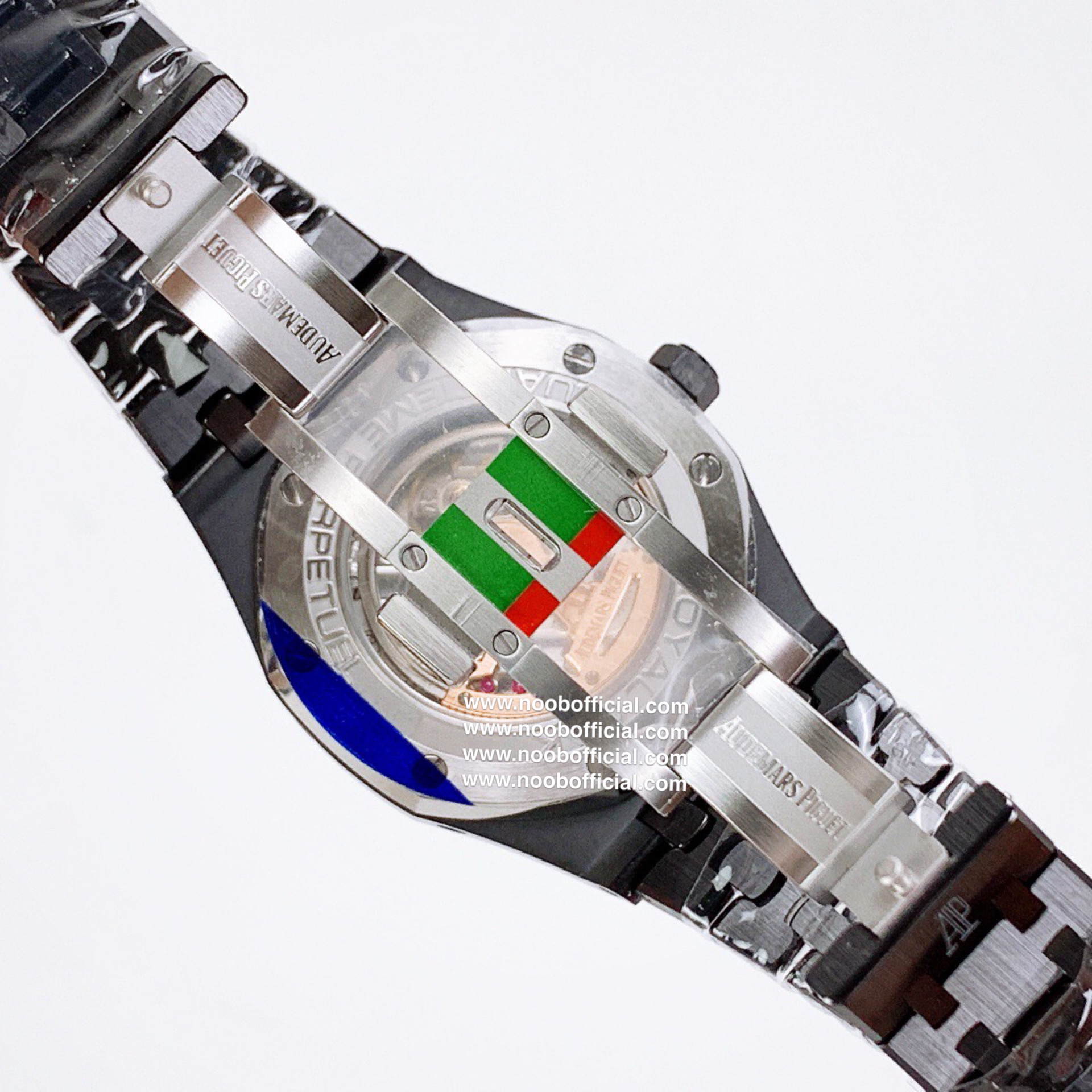 APS 爱彼 黑陶瓷26579 真月相 皇家橡树系列在“Grande Tapisserie”大格纹装饰表盘上,日期、星期、月份、月相,和四个眼睛的位置与原装同步