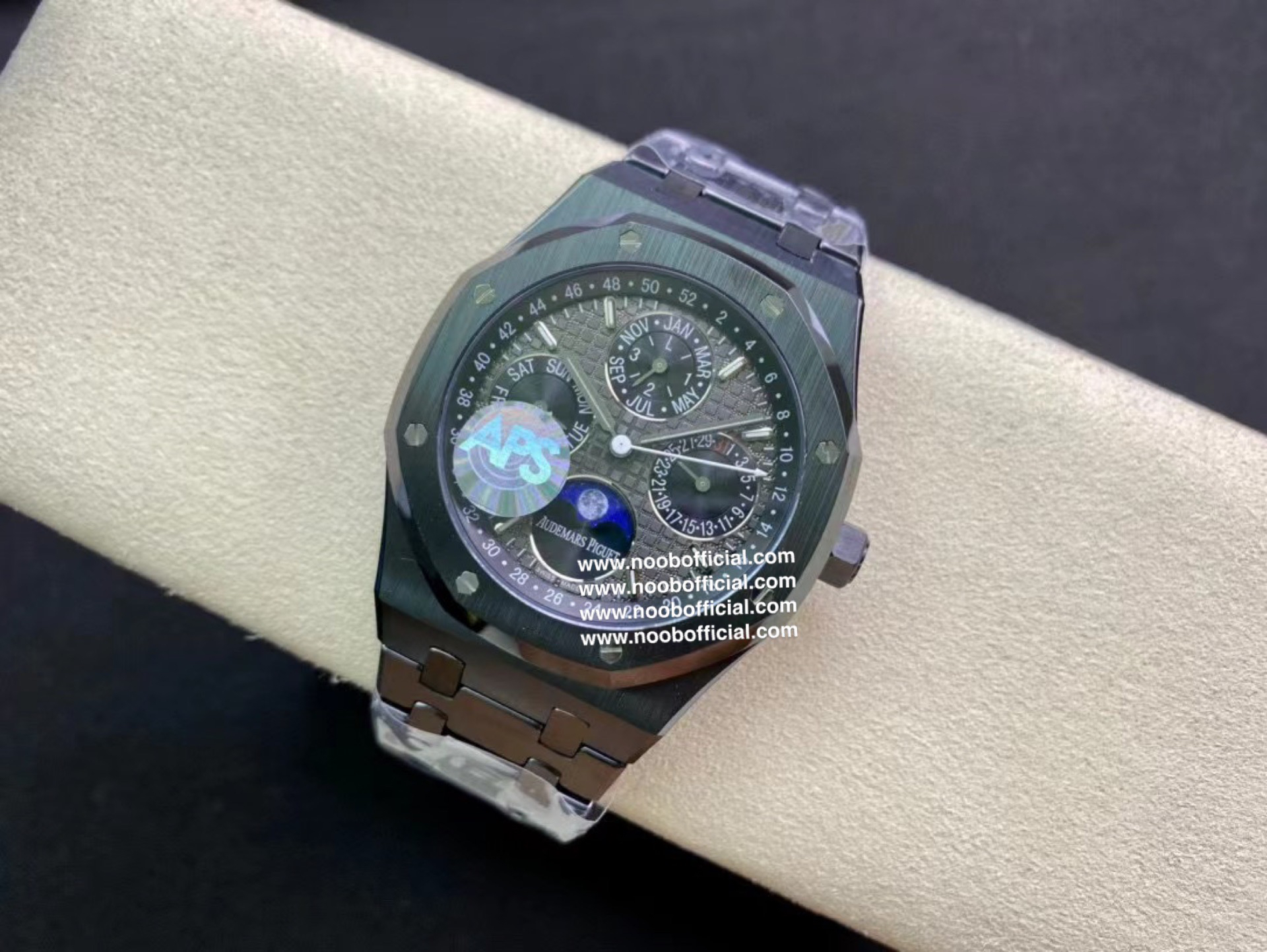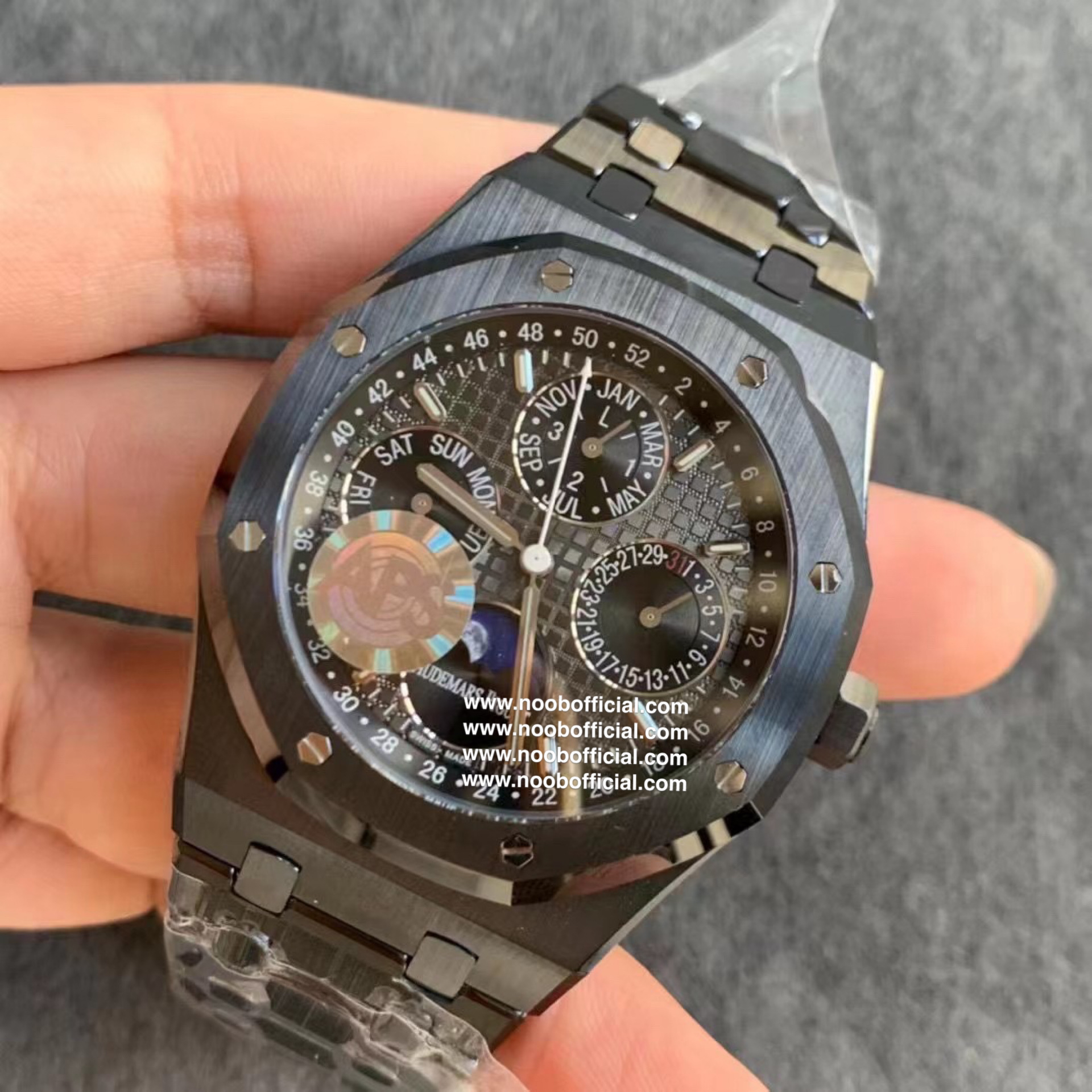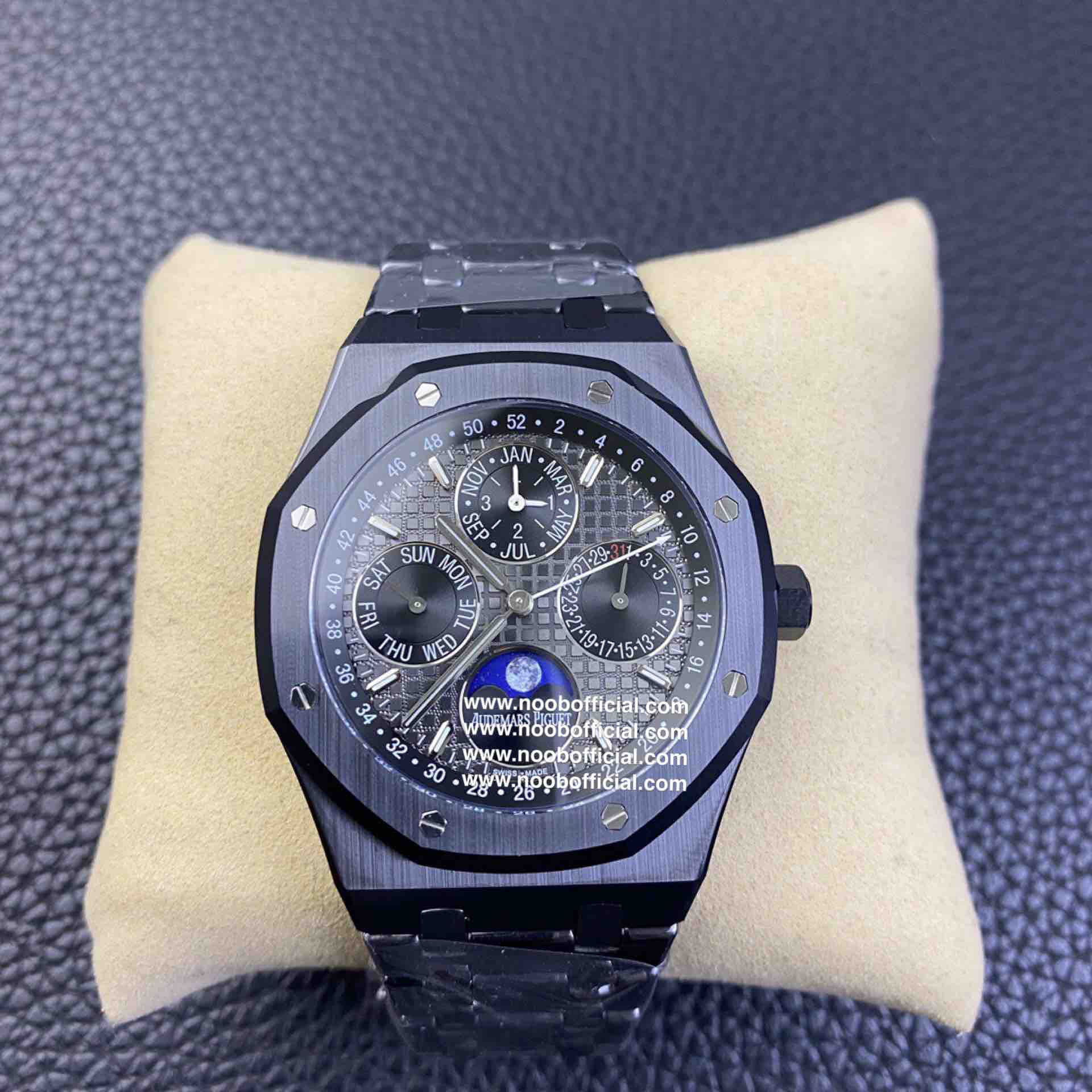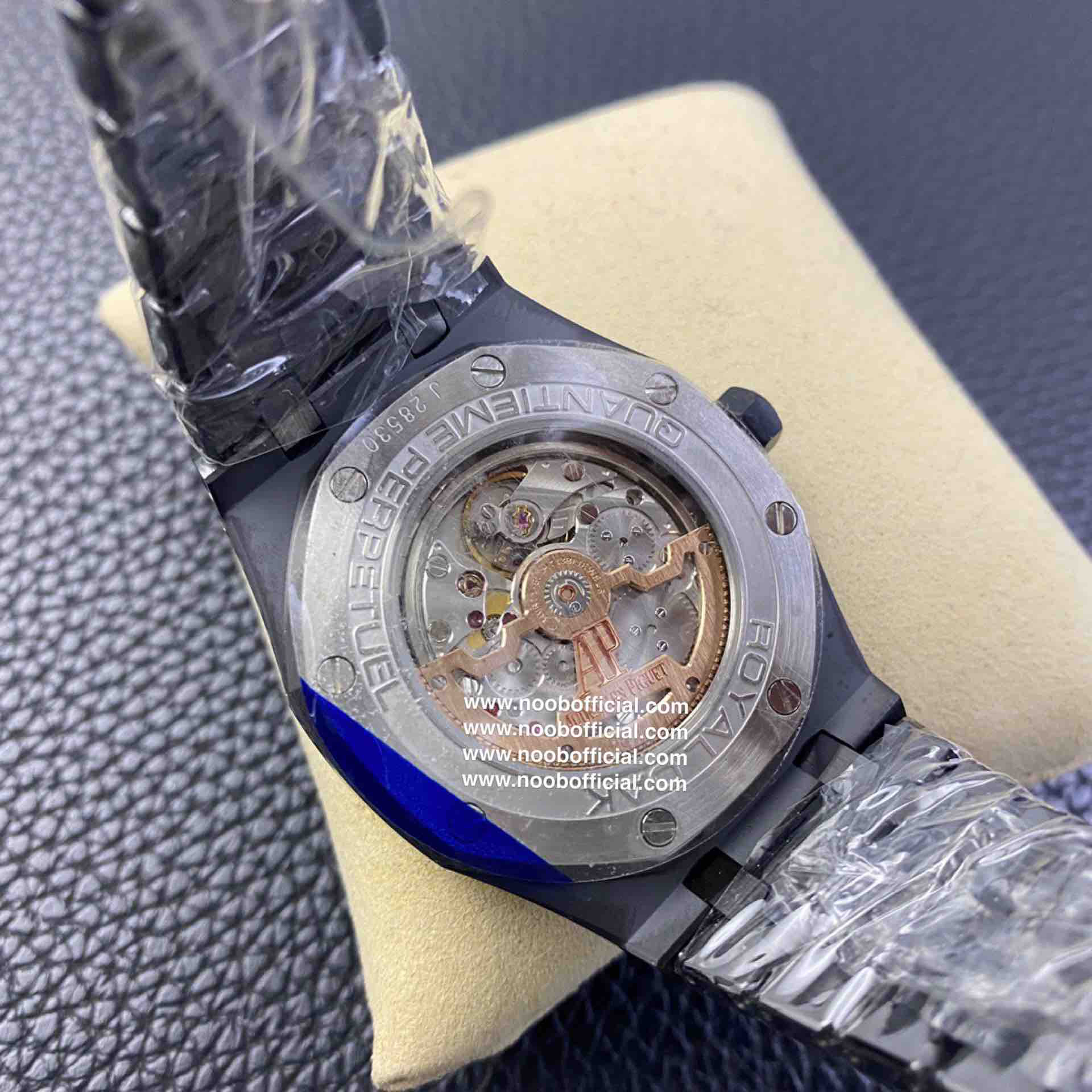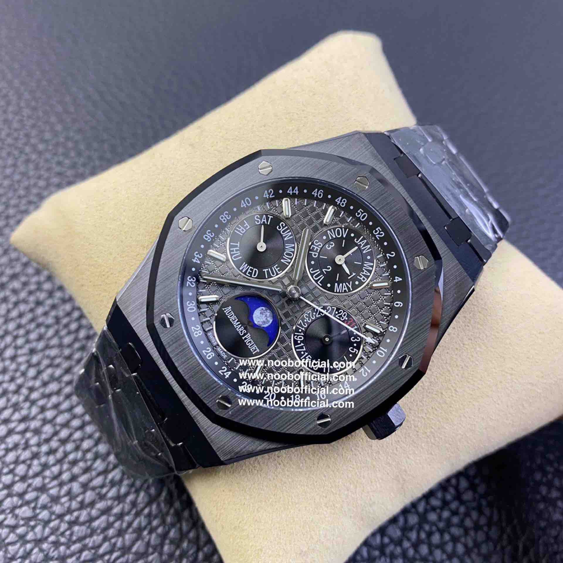 APS 爱彼 黑陶瓷26579 真月相 皇家橡树系列在“Grande Tapisserie”大格纹装饰表盘上,日期、星期、月份、月相,和四个眼睛的位置与原装同步