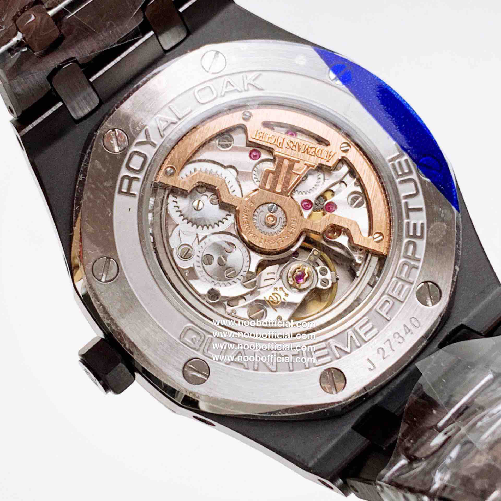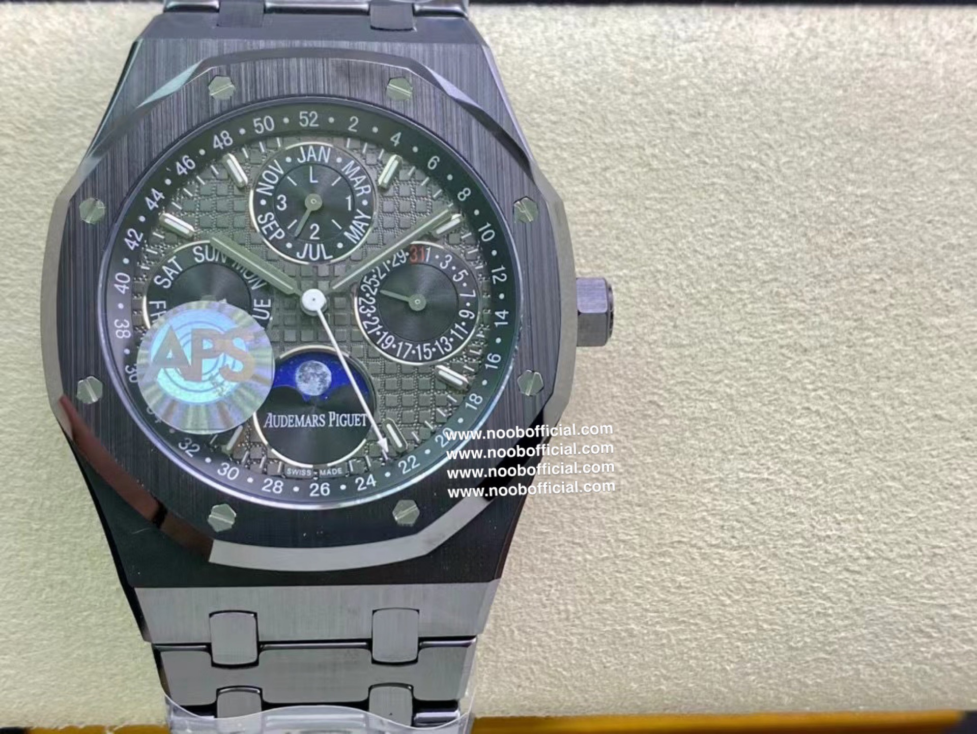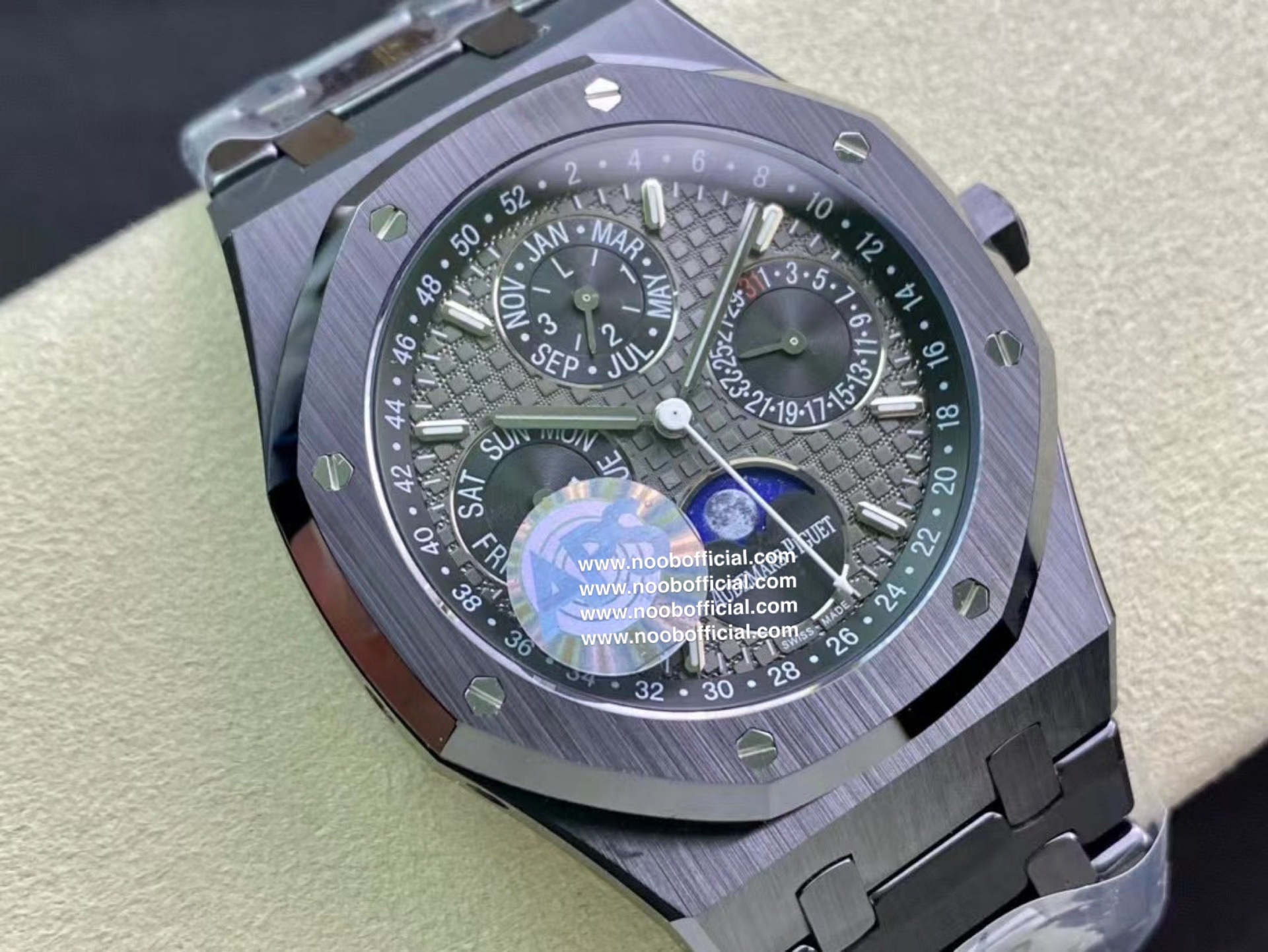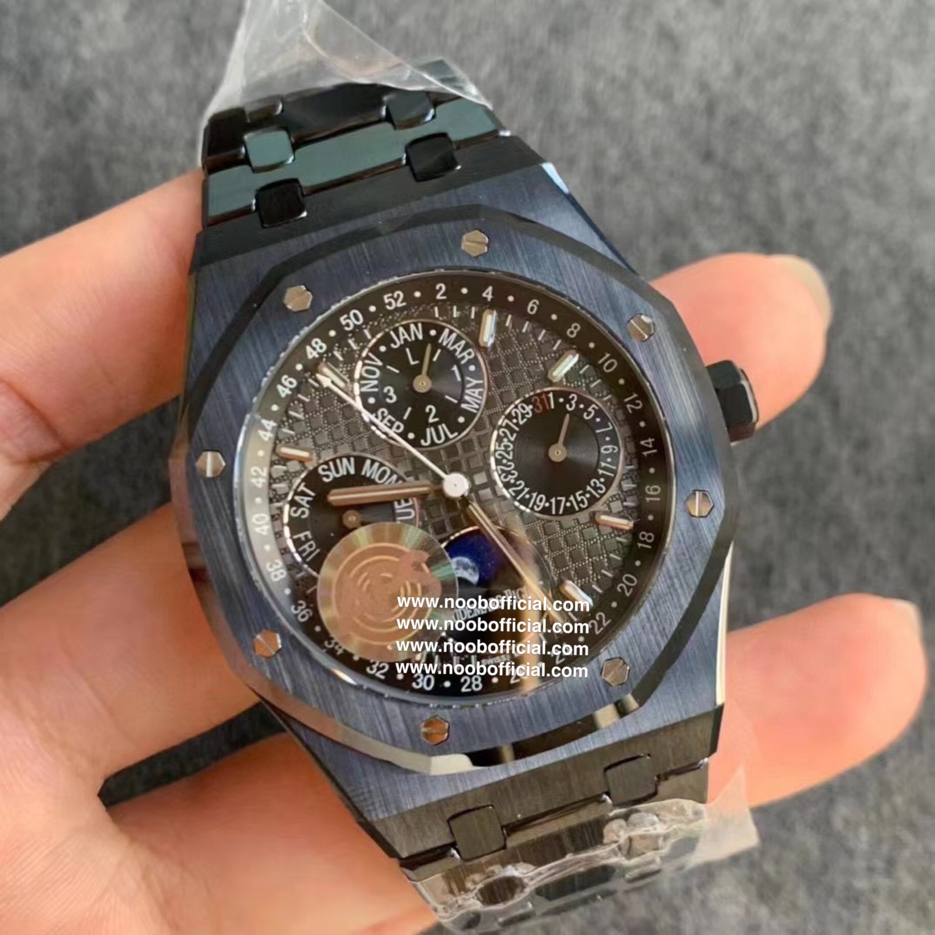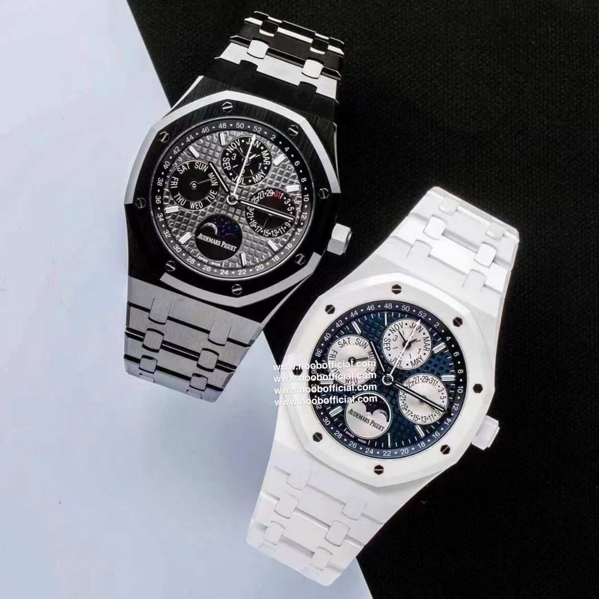 APS 爱彼 黑陶瓷26579 真月相 皇家橡树系列在“Grande Tapisserie”大格纹装饰表盘上,日期、星期、月份、月相,和四个眼睛的位置与原装同步