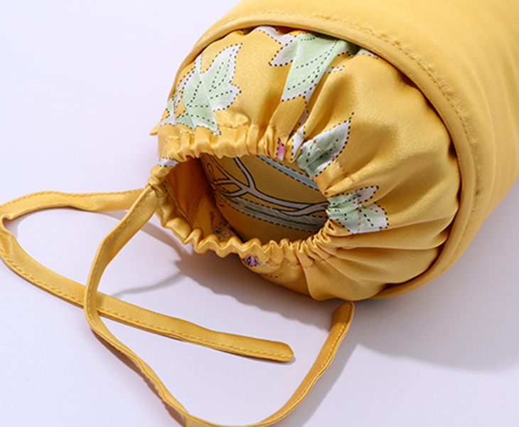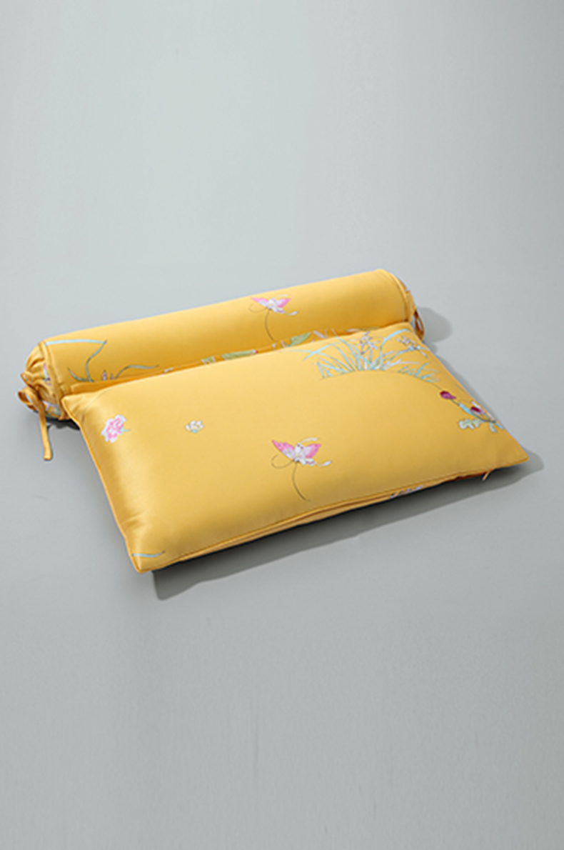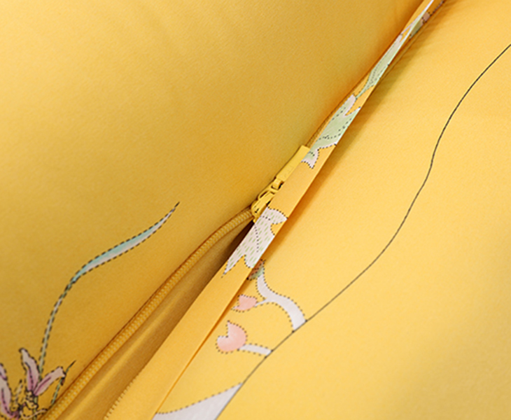 采用柔滑轻盈的桑蚕丝面料,搭配满庭芳的图案,含有幸福美满的寓意,整体布局均衡大气。