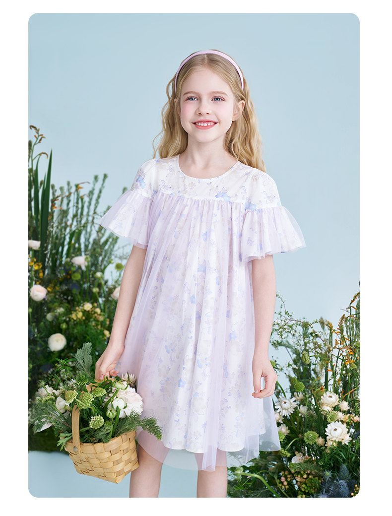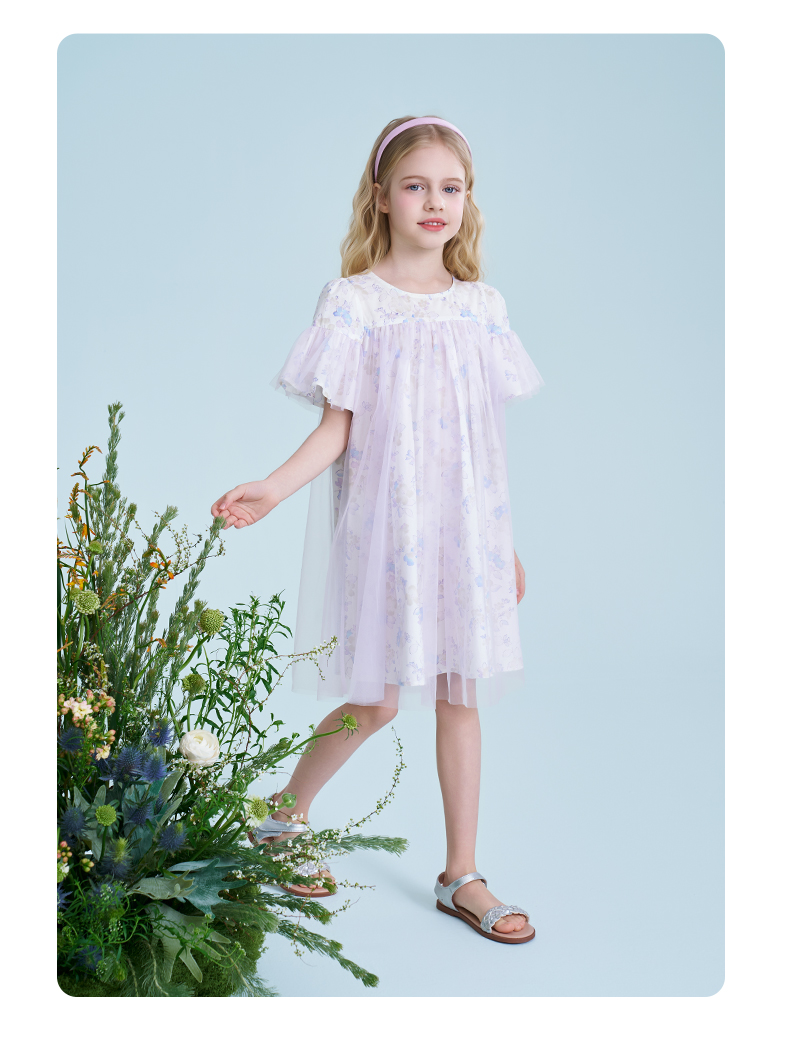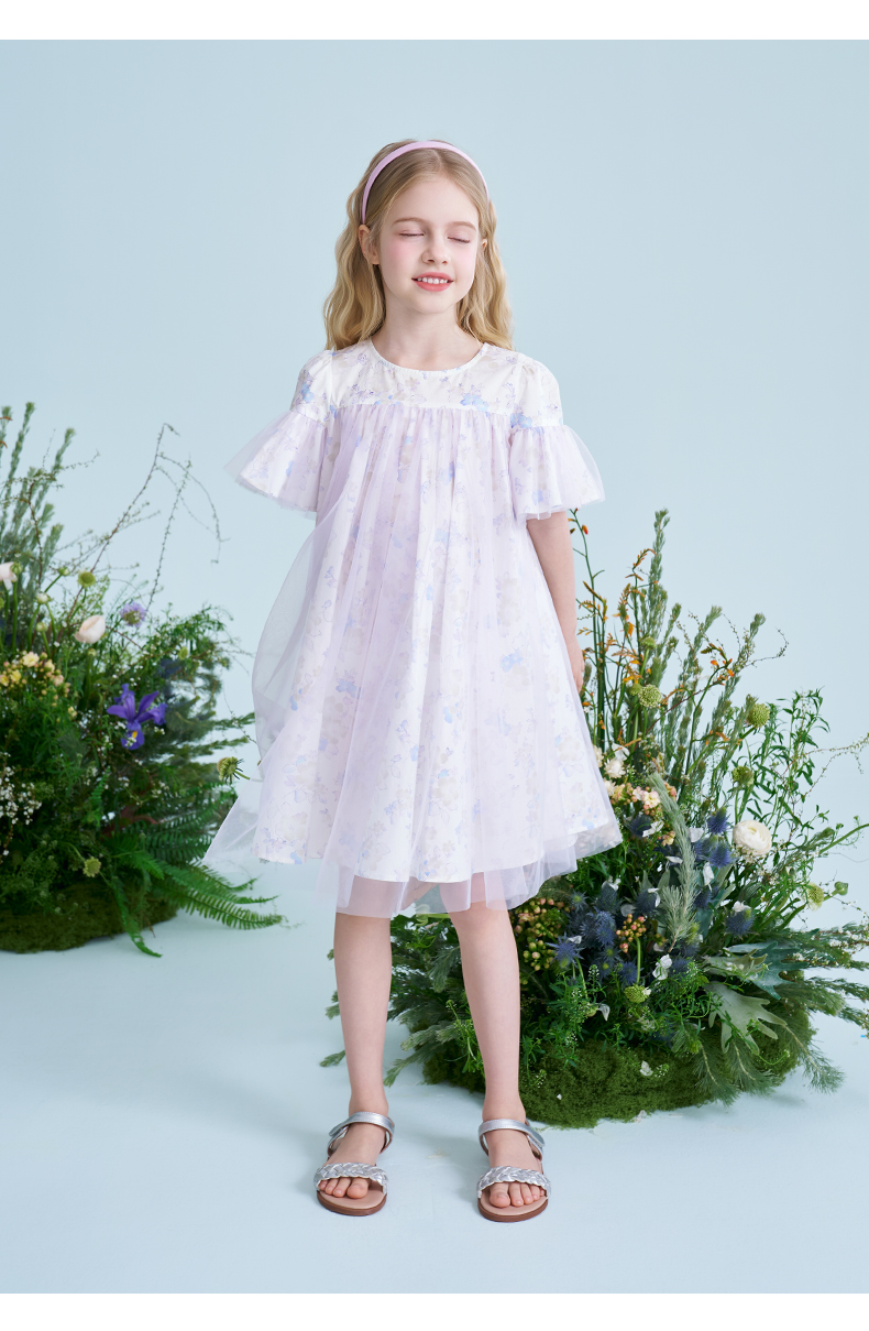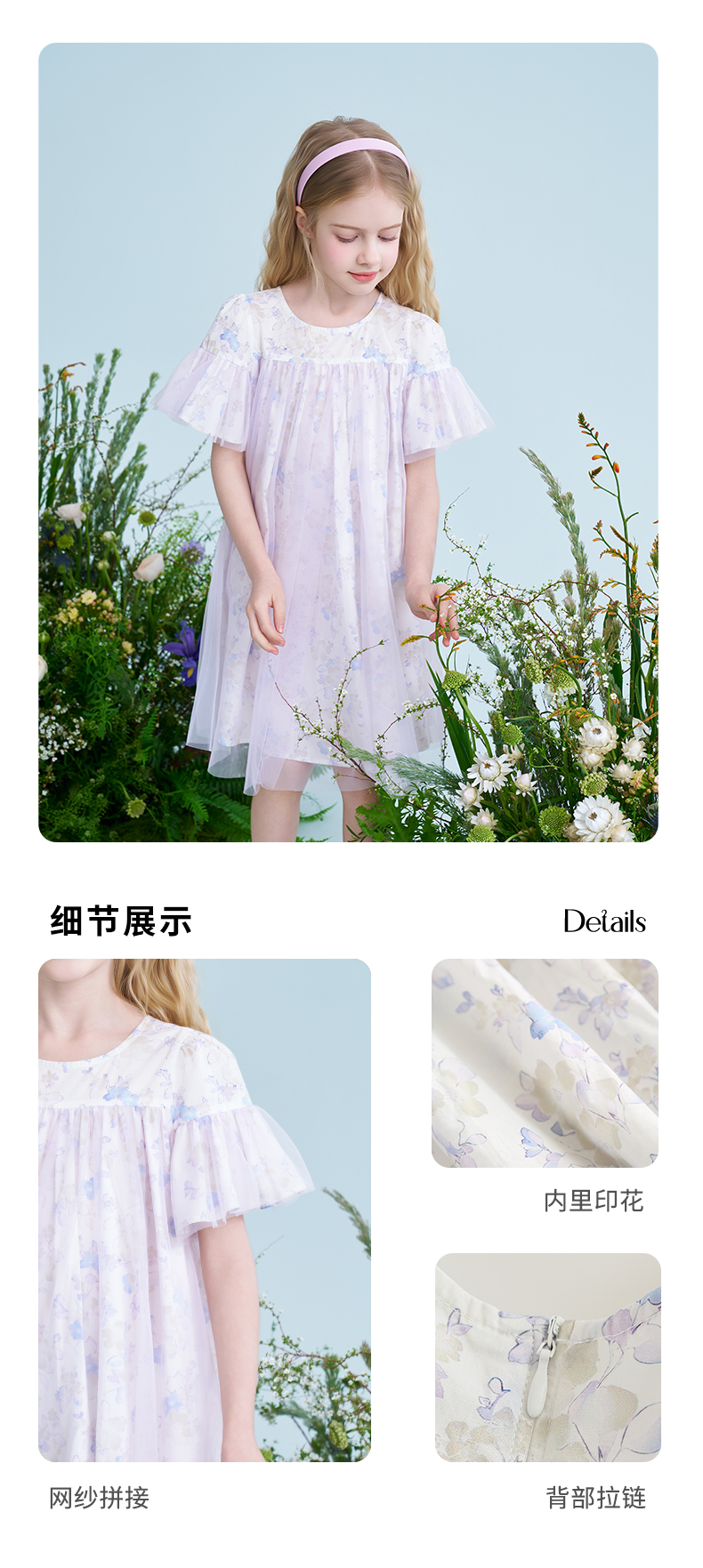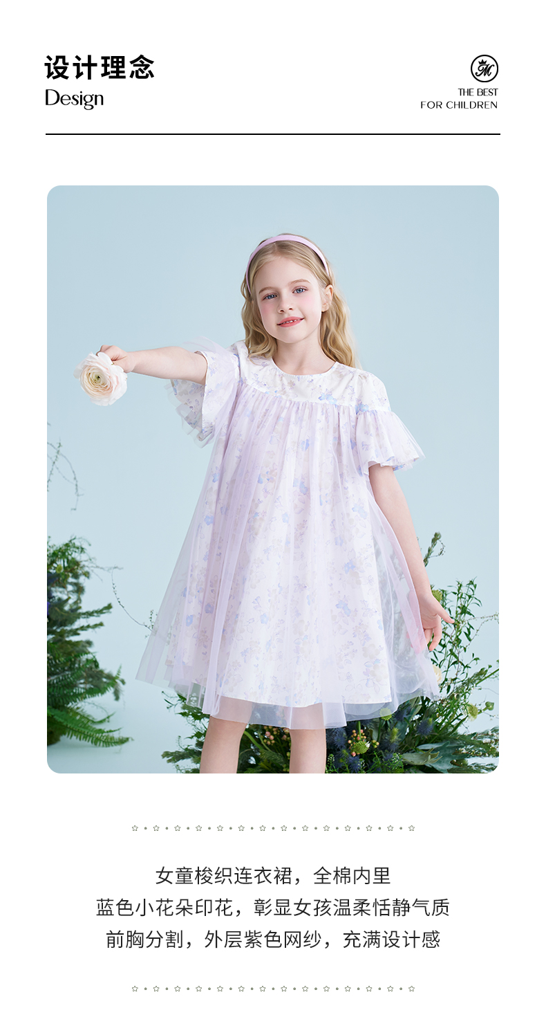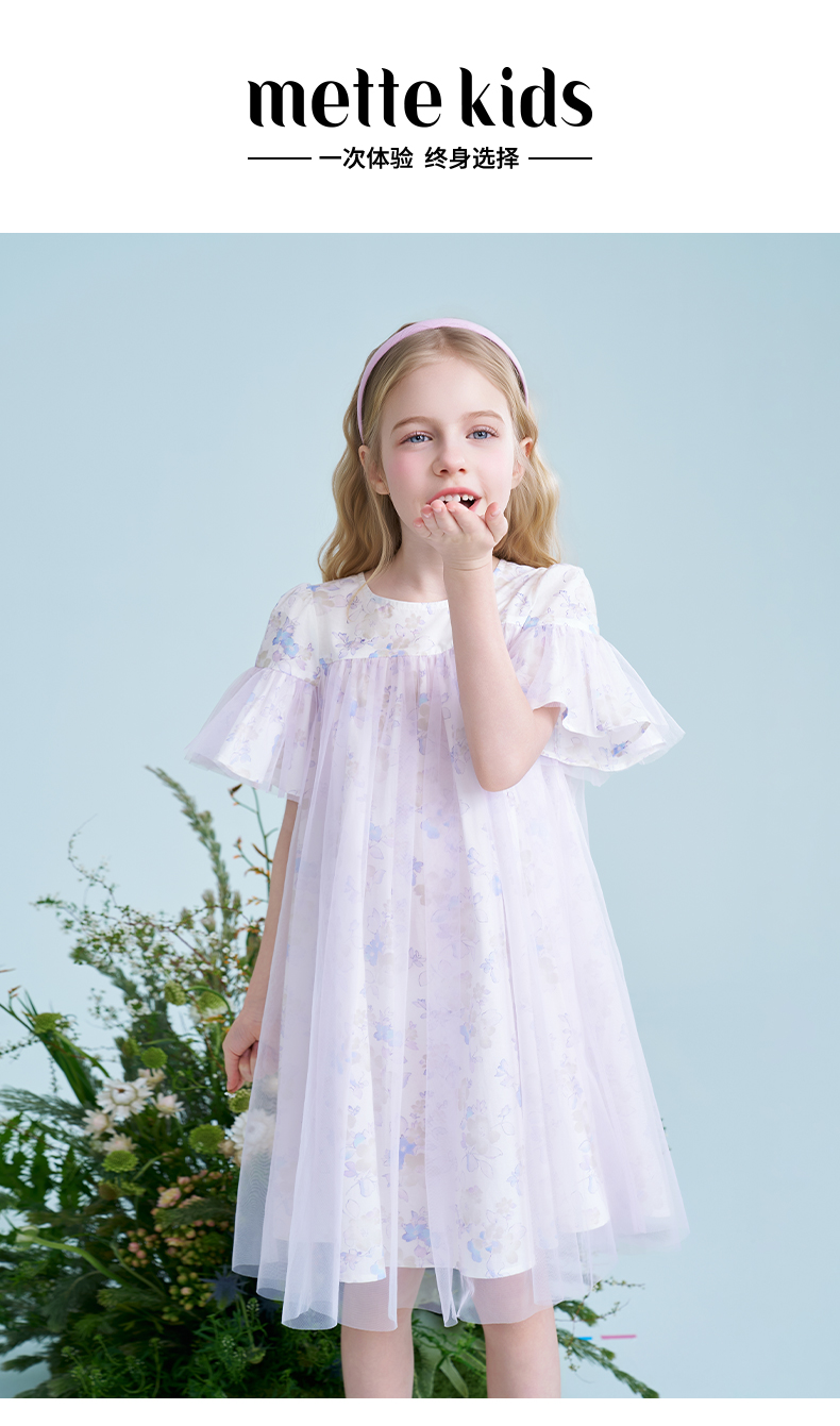 mettekids儿童连衣裙2025夏季新款纱裙女童法式碎花紫色大童裙子