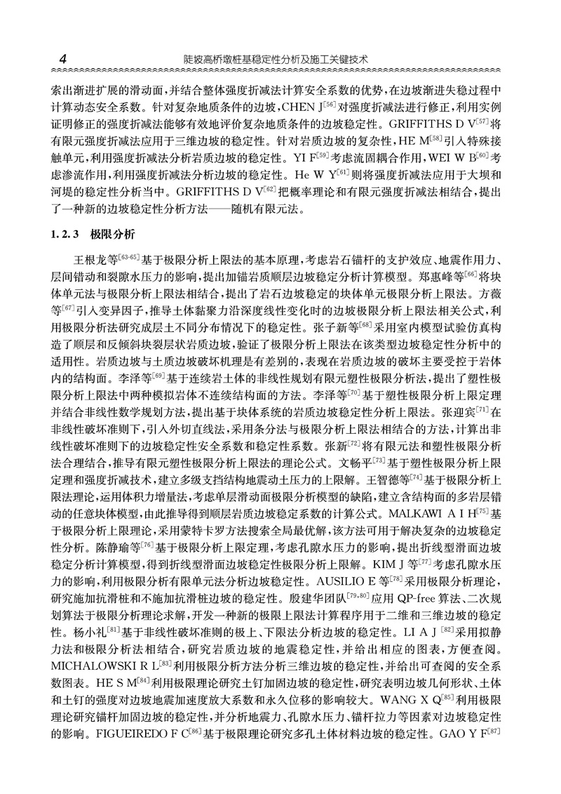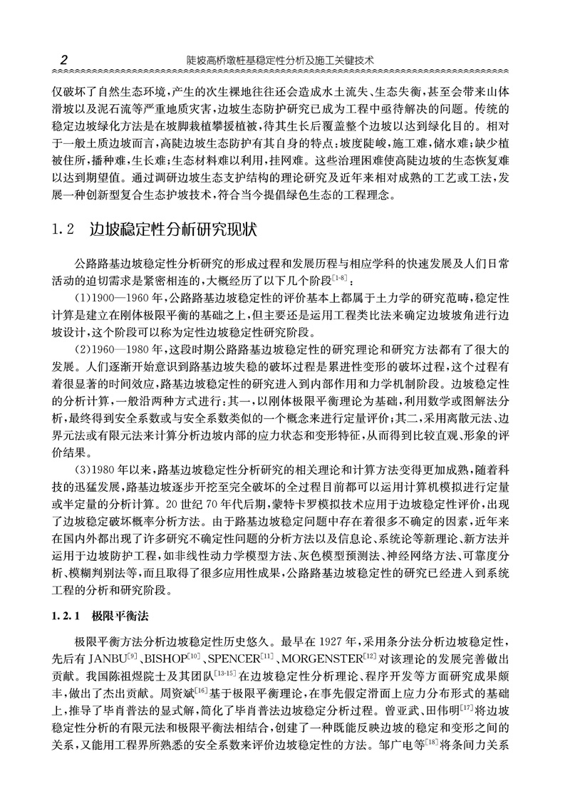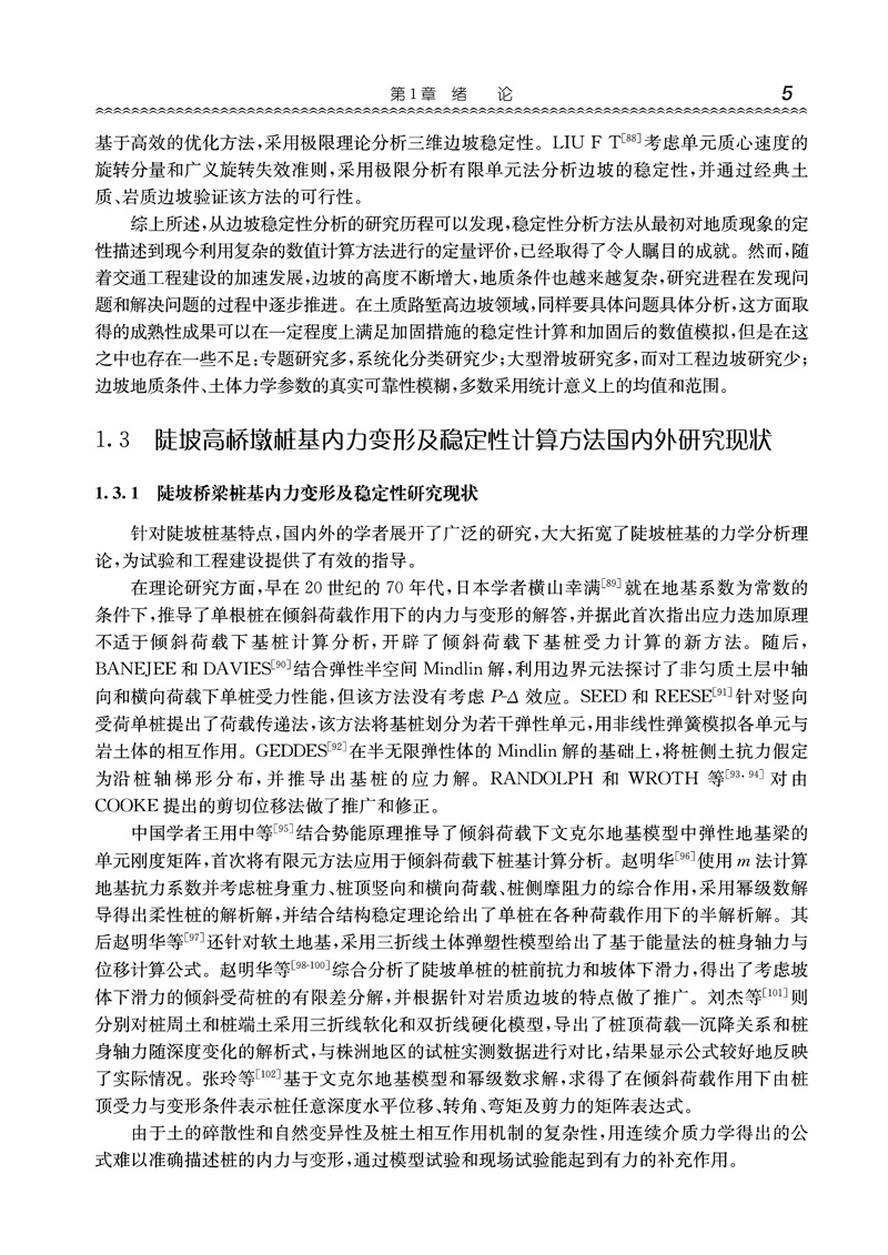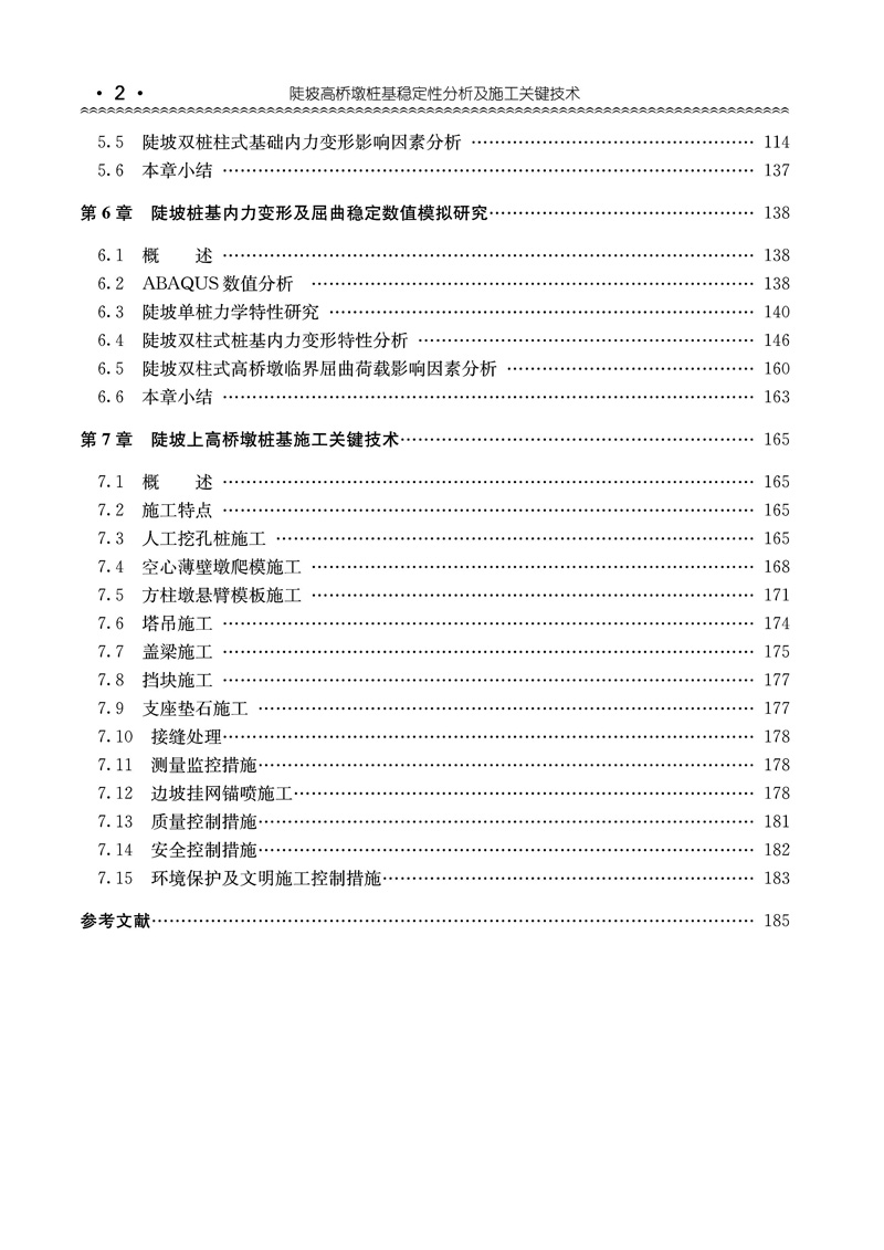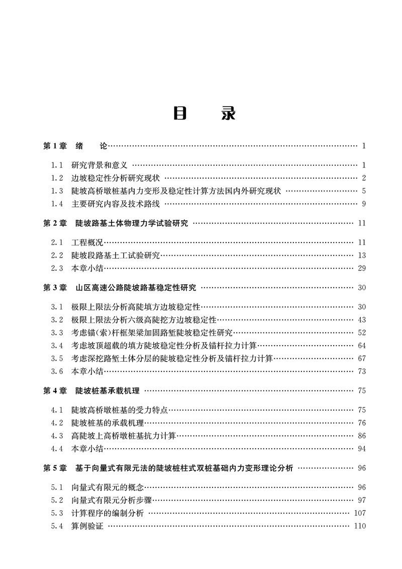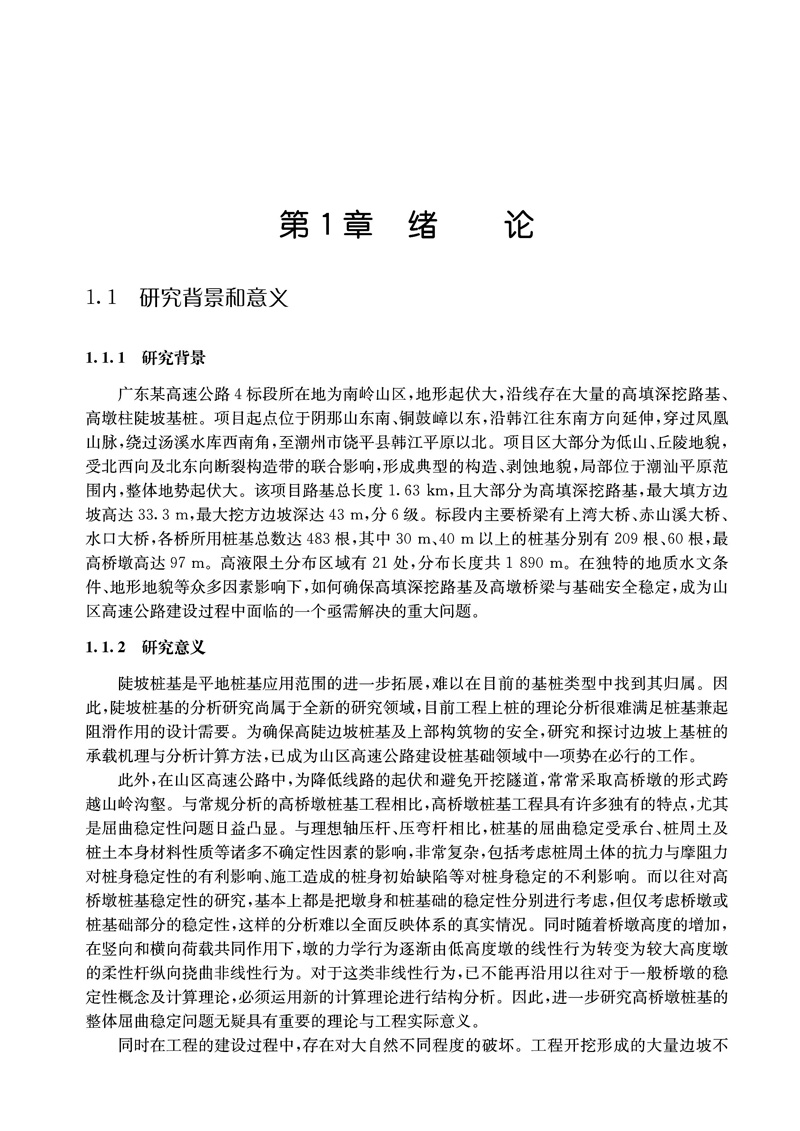 高填方构筑而成的高路堤边坡和由深挖方构筑而成的高路堑边坡。在山区修筑高速公路往往采用桥梁等结构来穿越深山峡谷或河流,由此必将导致一些桥梁桩基将位于陡峭边坡上,从而形成了桥梁高墩柱、基桩以及陡边坡所构成的相对复杂的结构体系。在桥墩达到一定高度后,高桥墩、基桩的屈曲稳定性问题都将凸现出来。本书结合广东大潮高速公路4标段的实际情况,主要通过相关资料调研与依托工程调研相结合、室内模拟试验与室内土工试验相结合、理论分析与计算机仿真模拟相结合、工程试验与工程应用及跟踪观测相结合等技术手段,系统、深入地研究山区高速公路高填深挖高液限土路基及陡坡桩基与高桥墩稳定性关键技术研究。