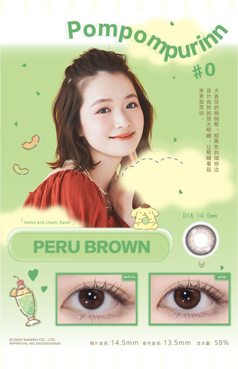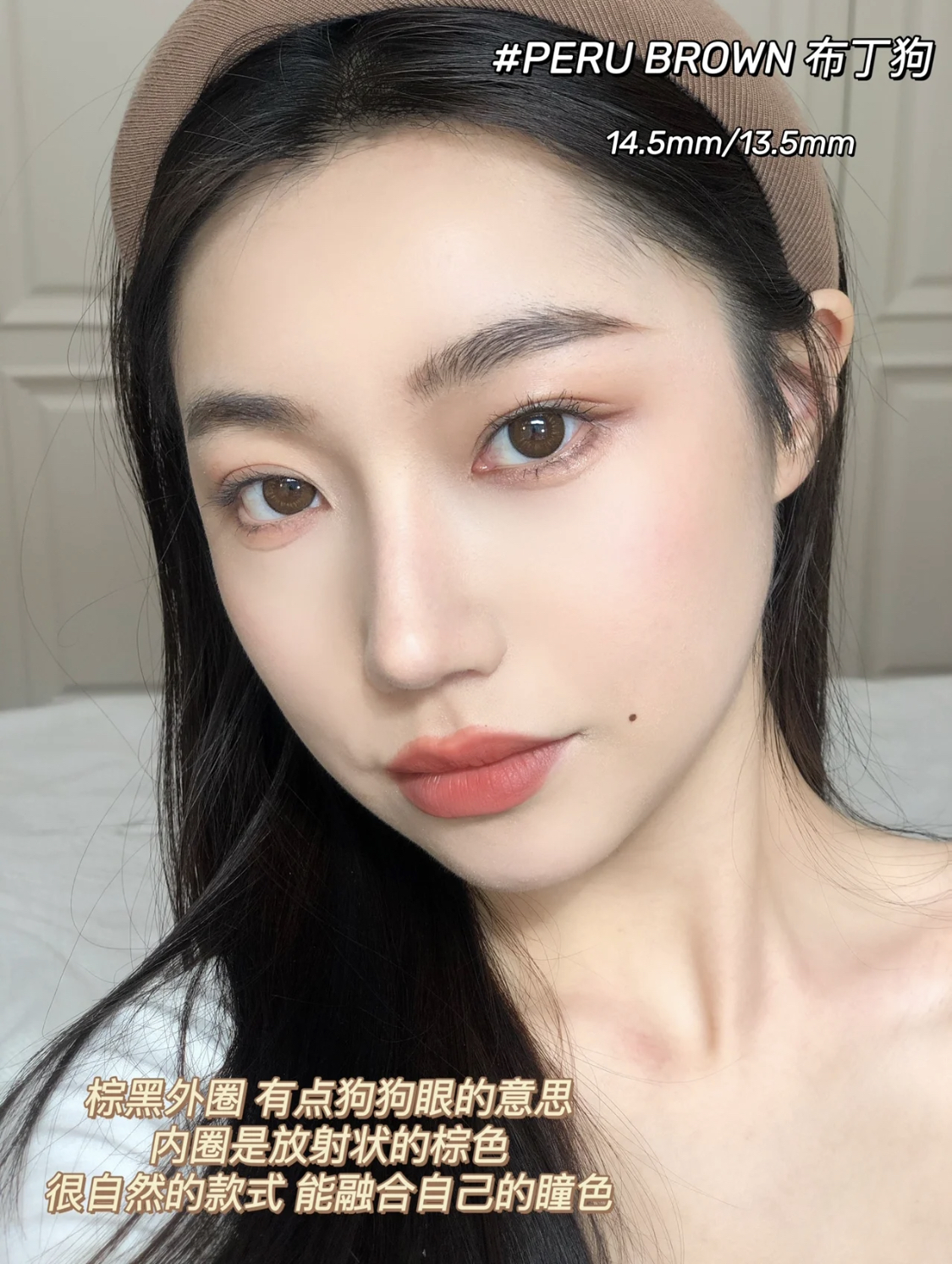 布丁狗Peru Brown,基础日常的棕色系,但内圈有很特别的放射状黄棕花纹,很有质感,能让眼珠像玻璃球一样清透,放大双眼效果非常棒!