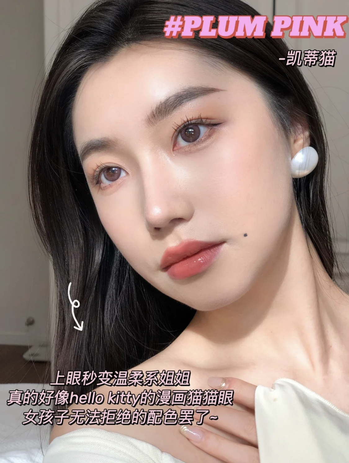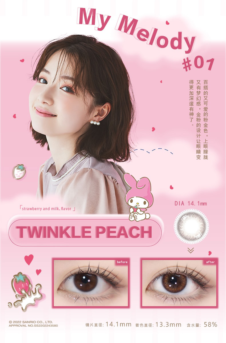 美乐蒂Twinkle Peach,金箔细闪的奶茶粉棕,很浪漫,上眼有朦胧感和清透感,适合软萌妹子!