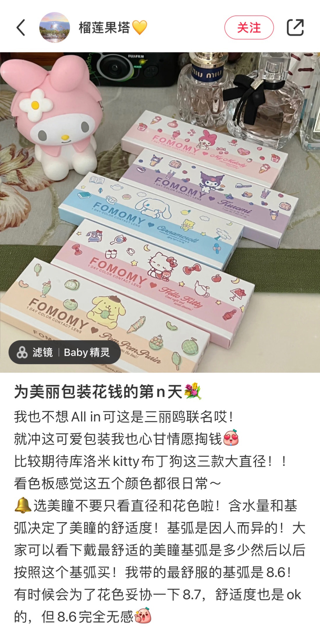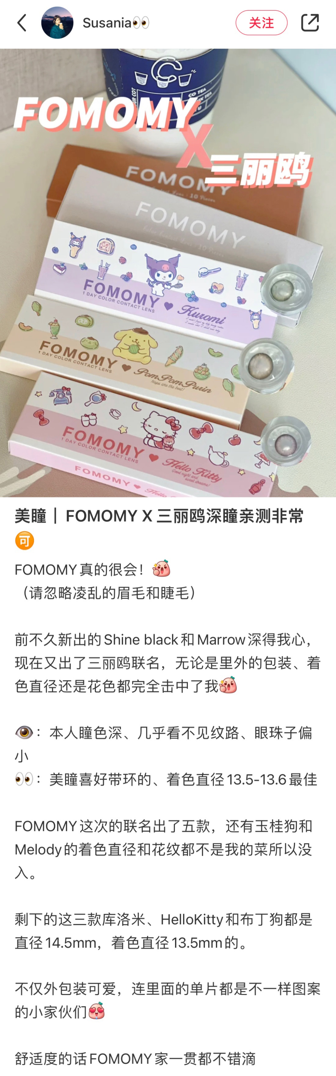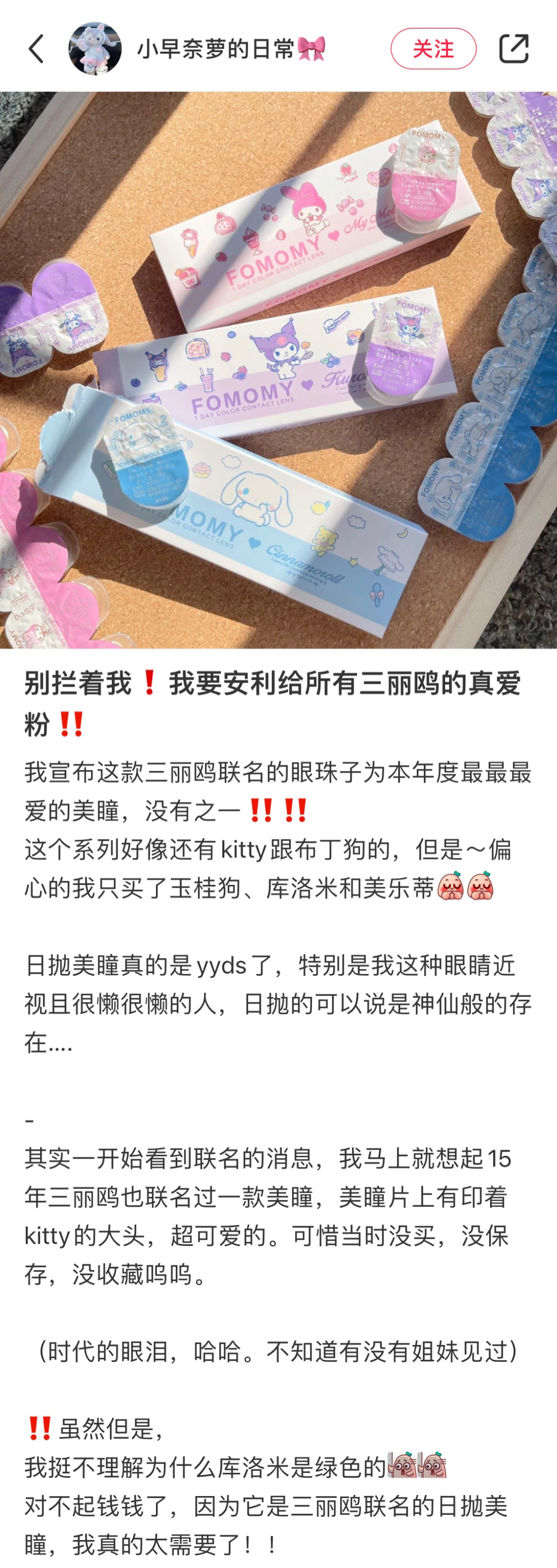 FOMOMY这次的三丽鸥联名真的是太会了!盒子都非常可爱,估计有很多人还会舍不得扔包装!度数是0-1000度,一盒是10片,如果两只眼度数不同就买两盒。对于新手来说这款日抛可能会有点难戴,因为真的太薄太软了,多练练吧!