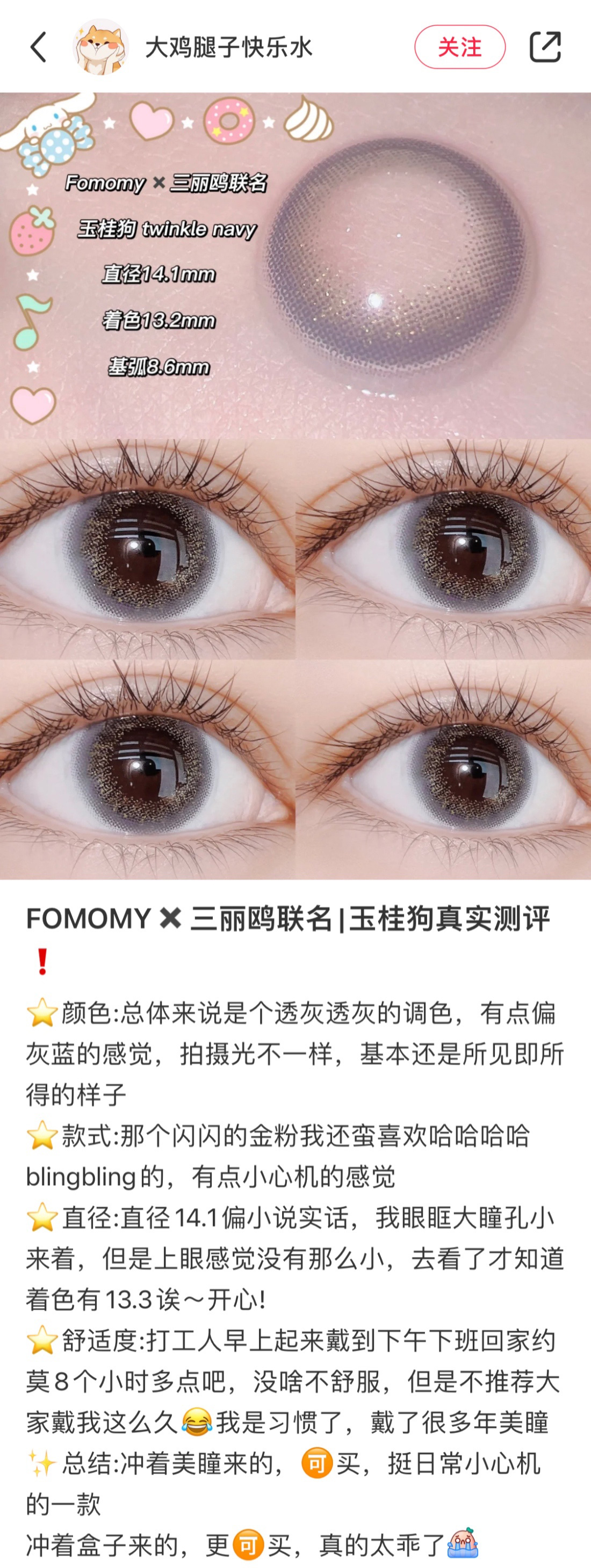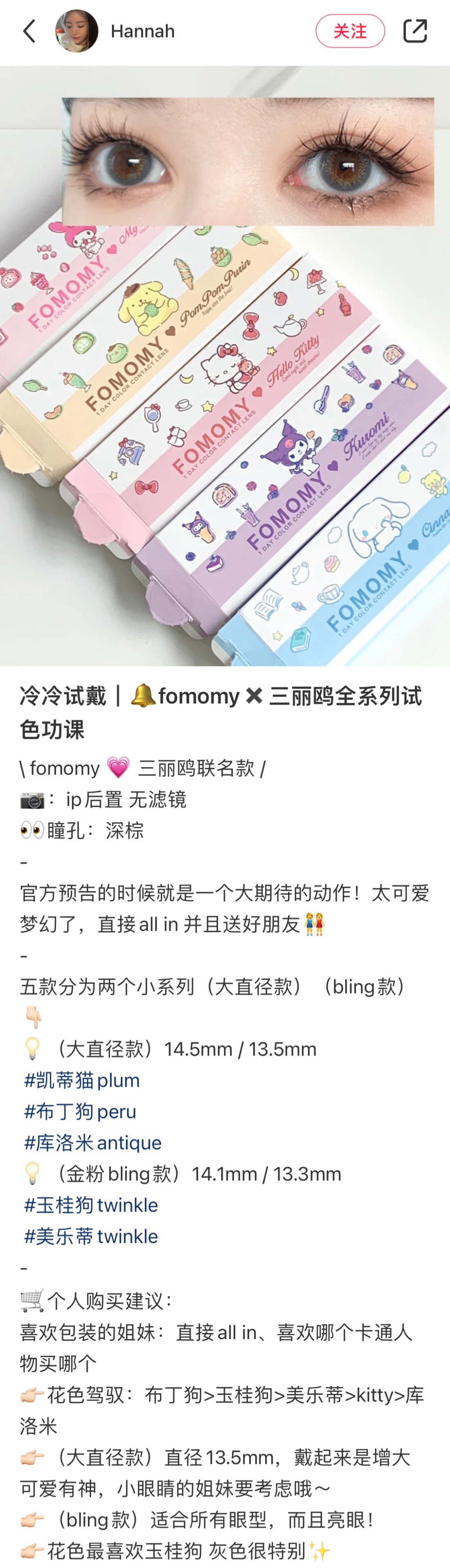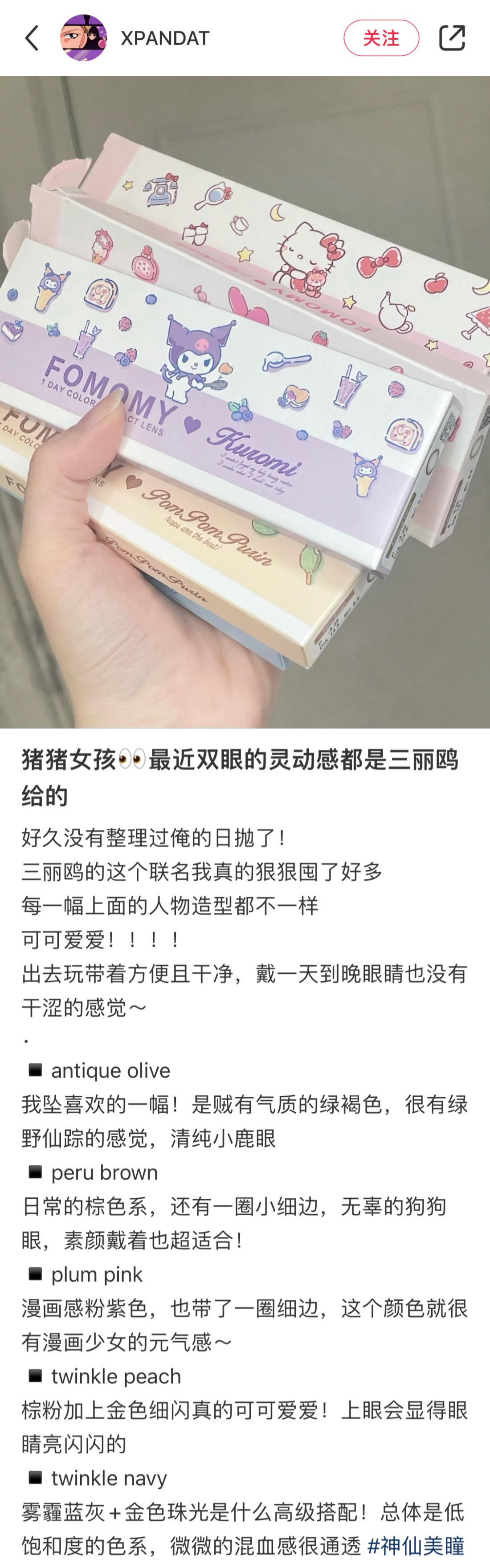 FOMOMY这次的三丽鸥联名真的是太会了!盒子都非常可爱,估计有很多人还会舍不得扔包装!度数是0-1000度,一盒是10片,如果两只眼度数不同就买两盒。对于新手来说这款日抛可能会有点难戴,因为真的太薄太软了,多练练吧!