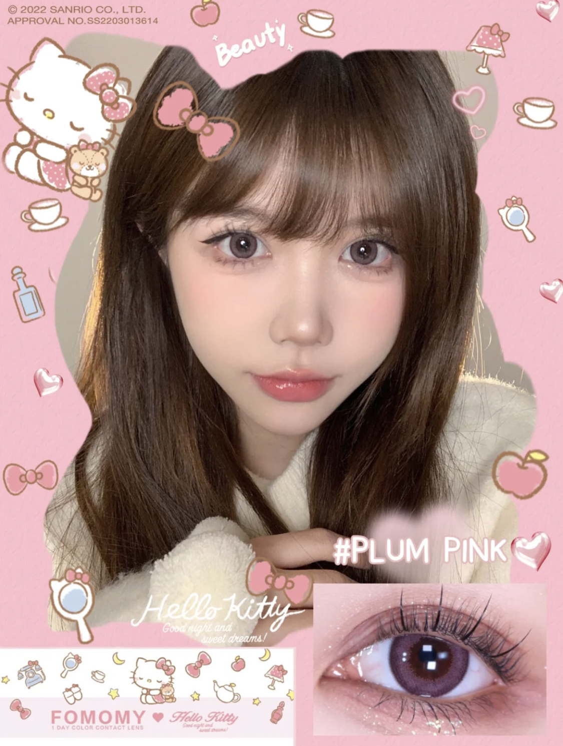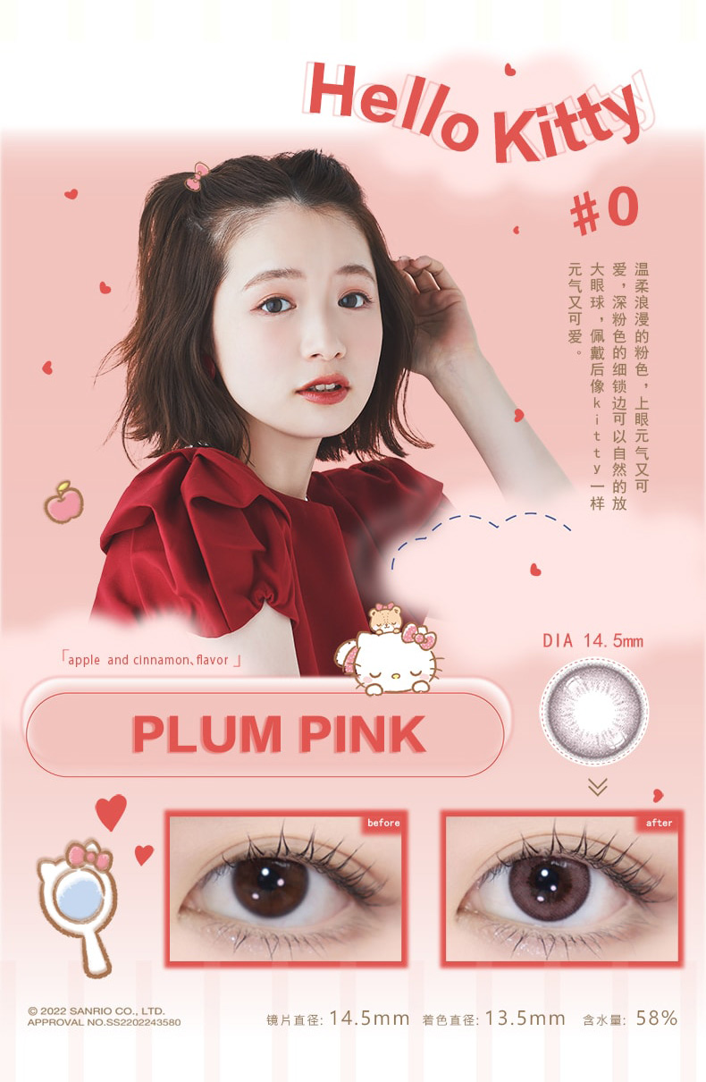 凯蒂猫Plum Pink,镜片内圈是晕开的粉紫色,外圈深紫色锁边,戴上能扩瞳的同时还可以让眼睛很有神,就像Hello Kitty的漫画猫猫眼,秒变温柔系小姐姐!