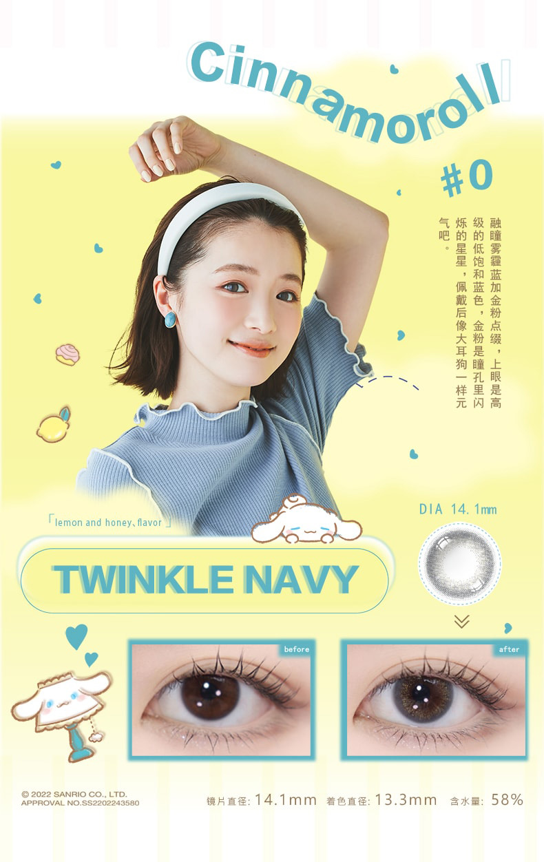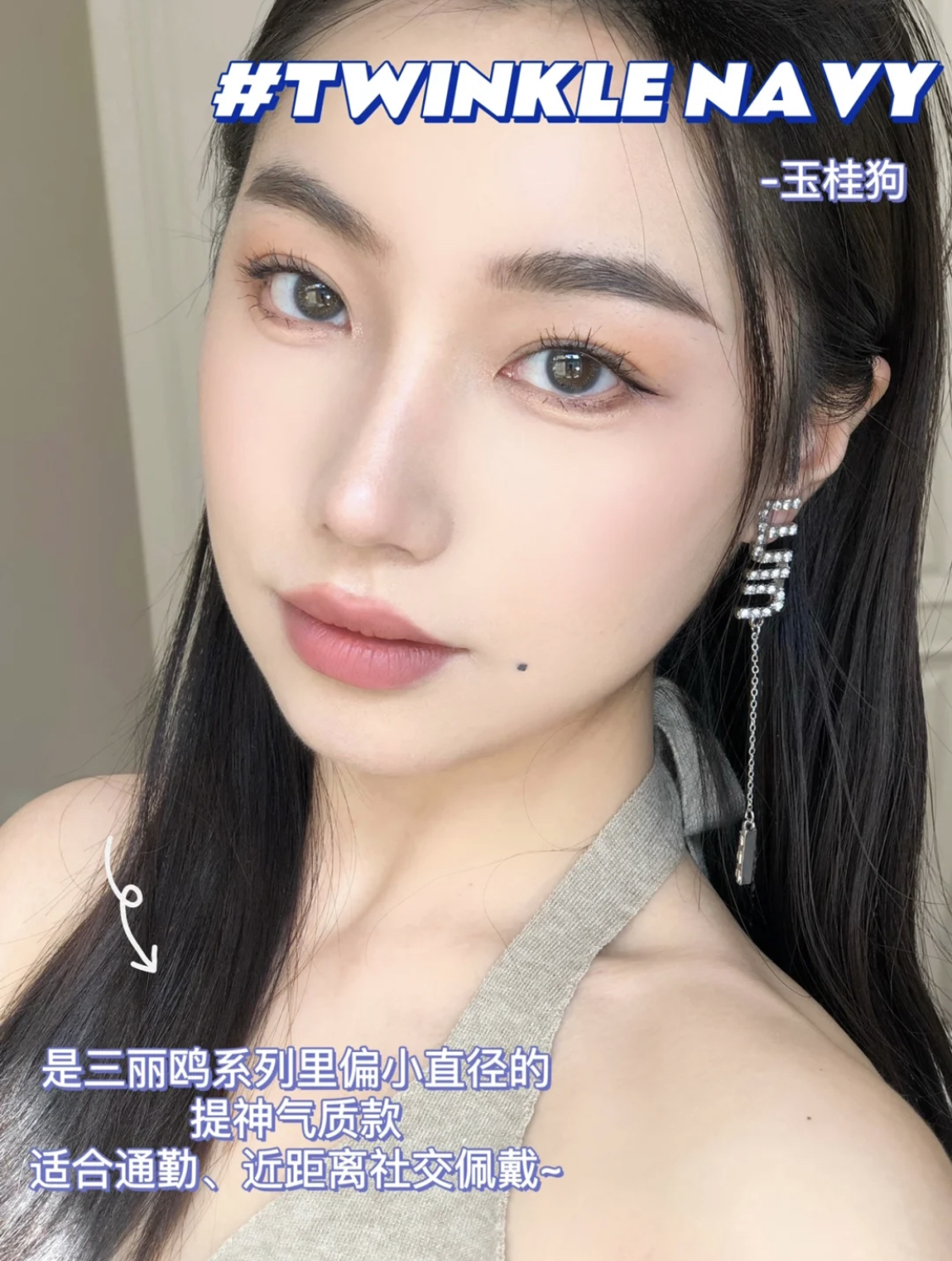 大耳狗Twinkle Navy,镜片是很高级的雾霾蓝,有一圈金粉微闪闪,眼睛有星星!高级显白,虽然是异色美瞳,但是近距离社交也很自然好看哦!