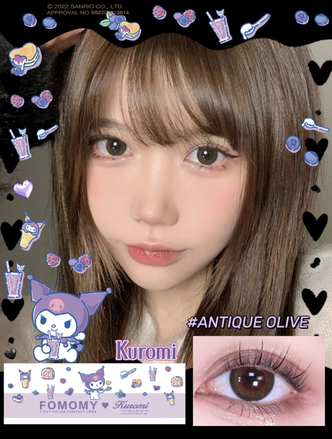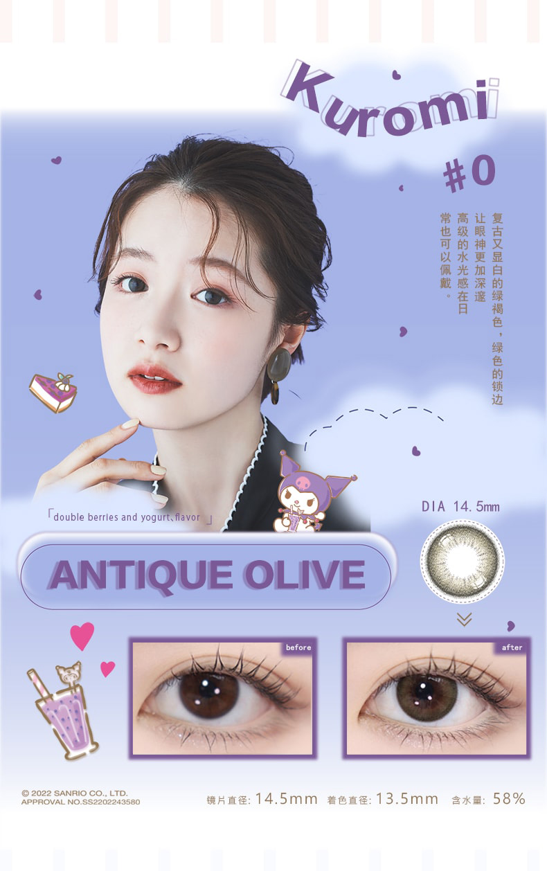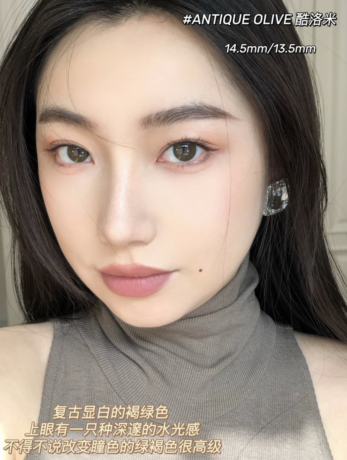 酷洛米Antique Olive,很清新的茶绿色,整体是低饱和的调调,深邃又显白!是一种介于微混血和自然的颜色,戴上后水汪汪,惹人心动!