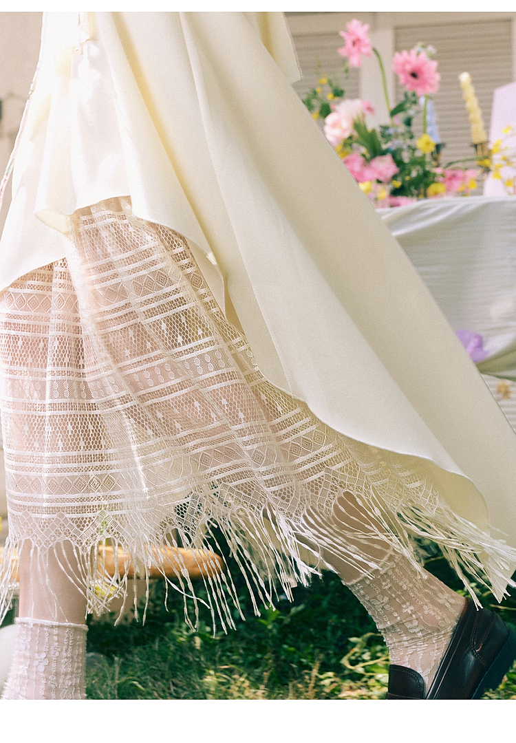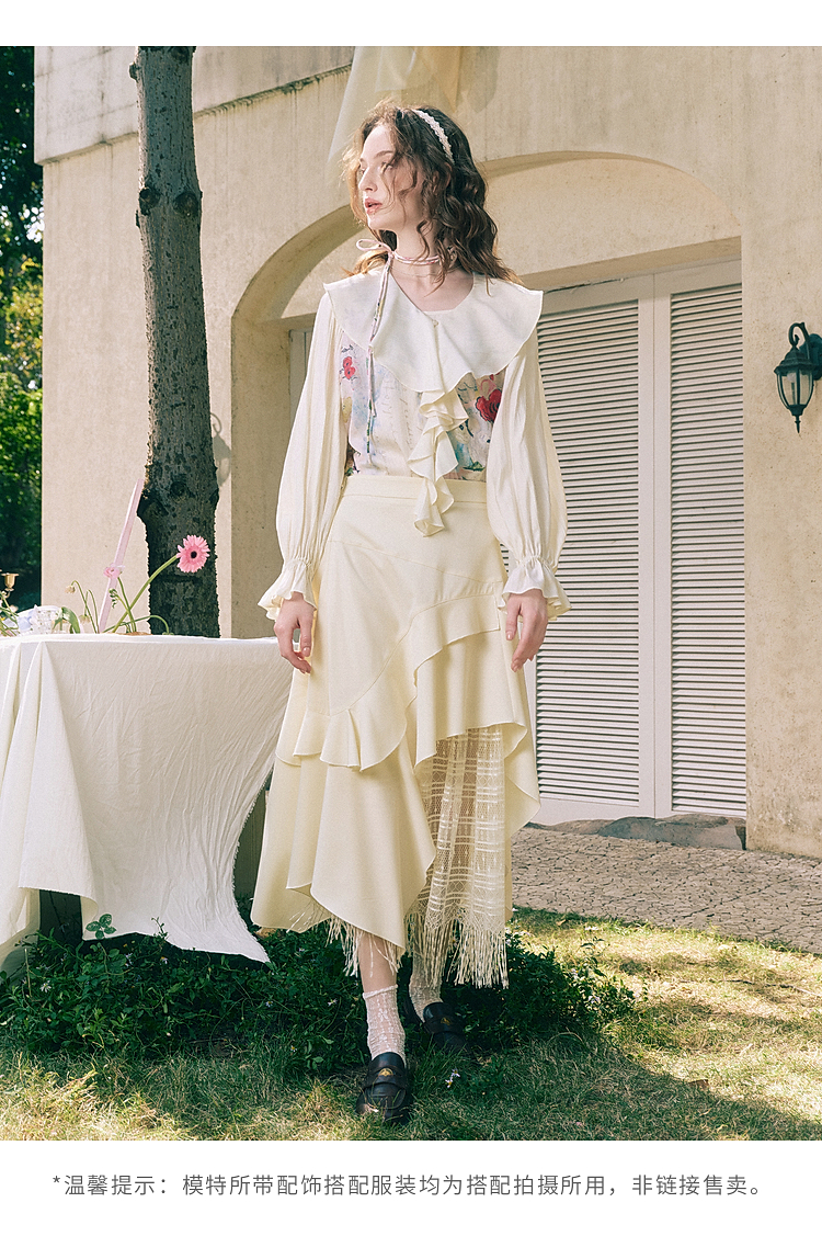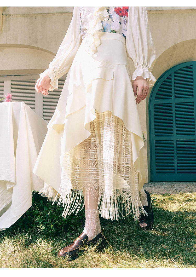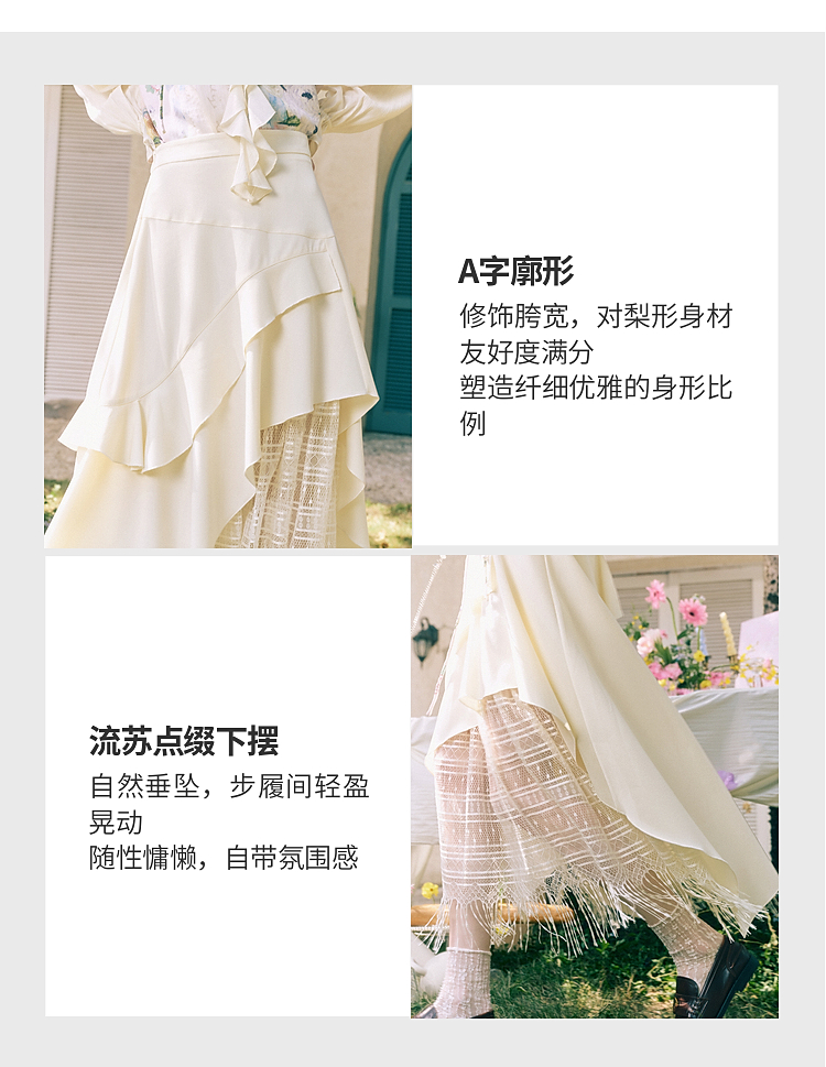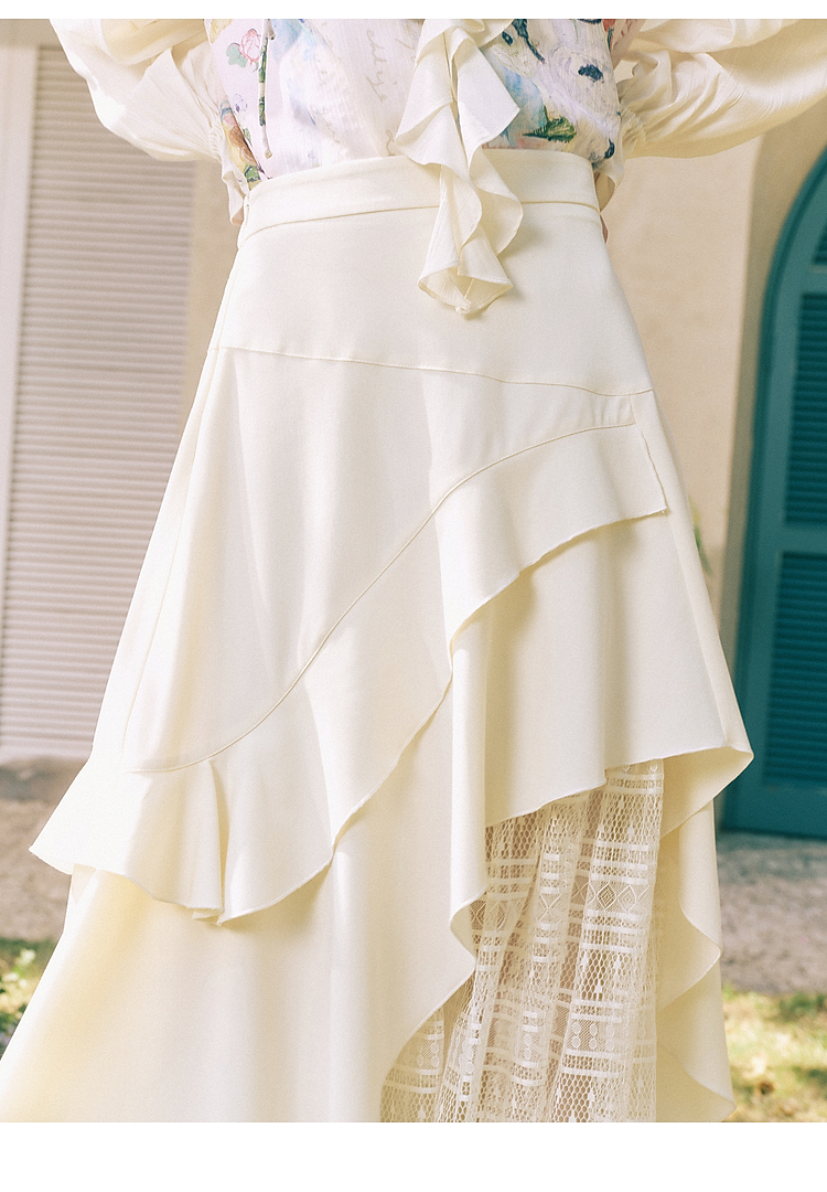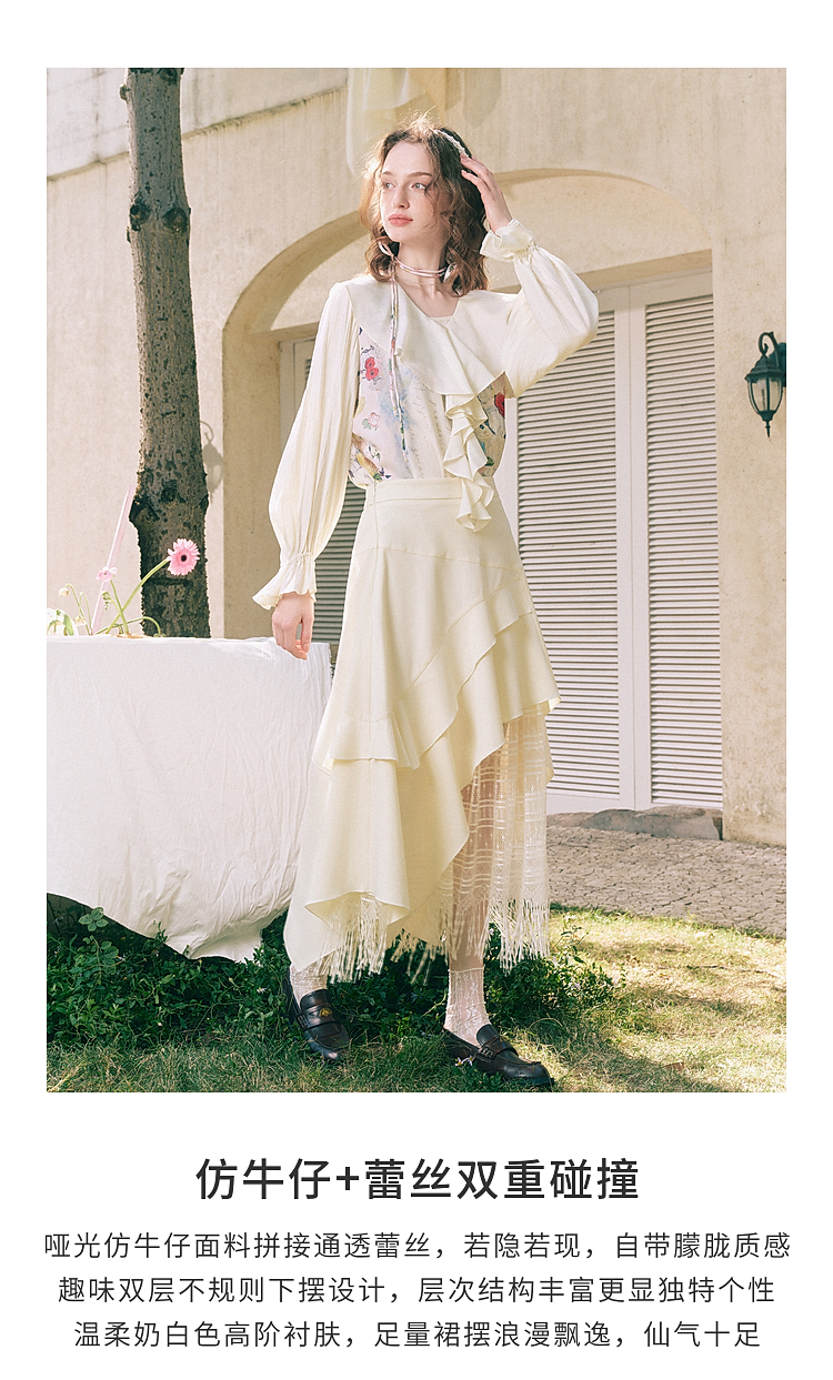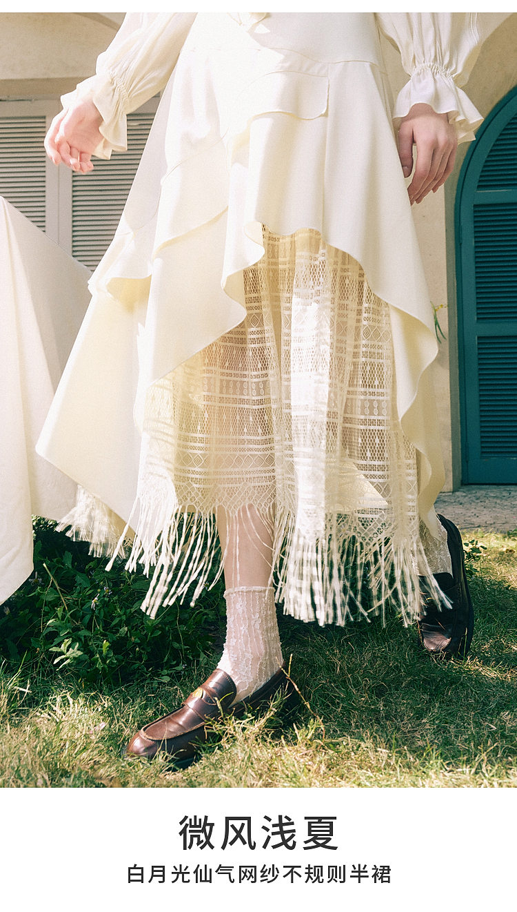 两三事微风浅夏2026春季新款层层荷叶边蕾丝拼接不规则半身裙长裙