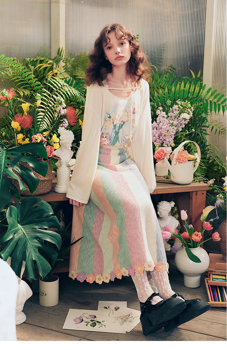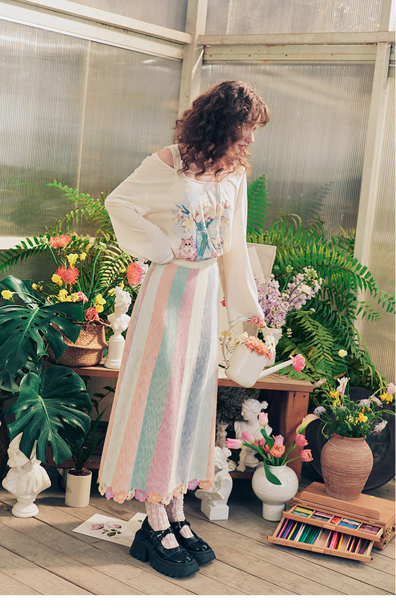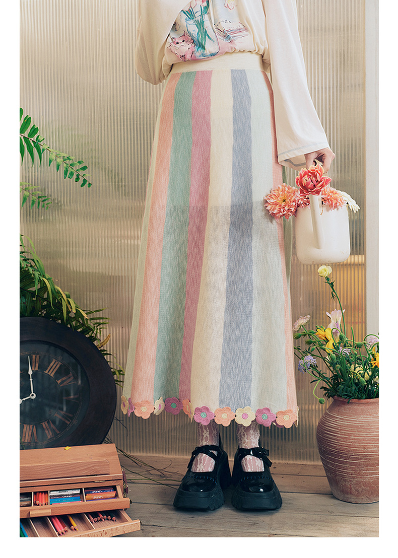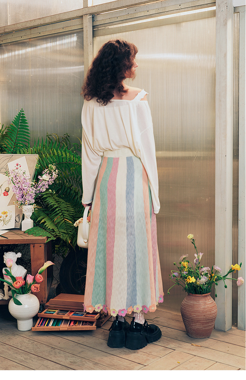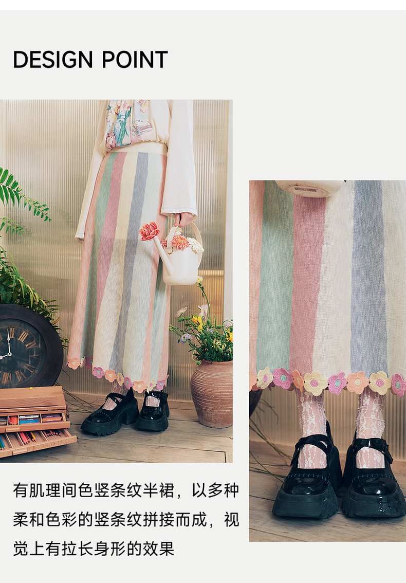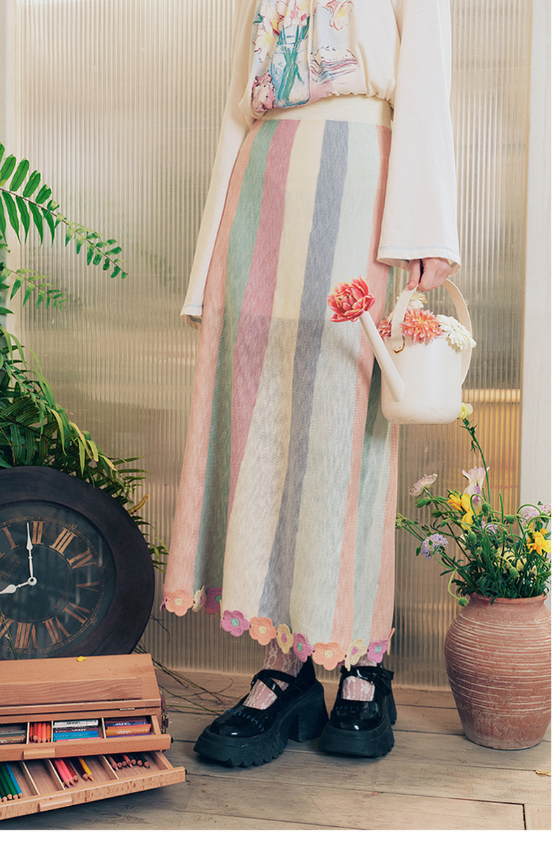 两三事 霓虹花轨 2025夏季新款立体手钩花裙摆拼色条纹半身裙长裙