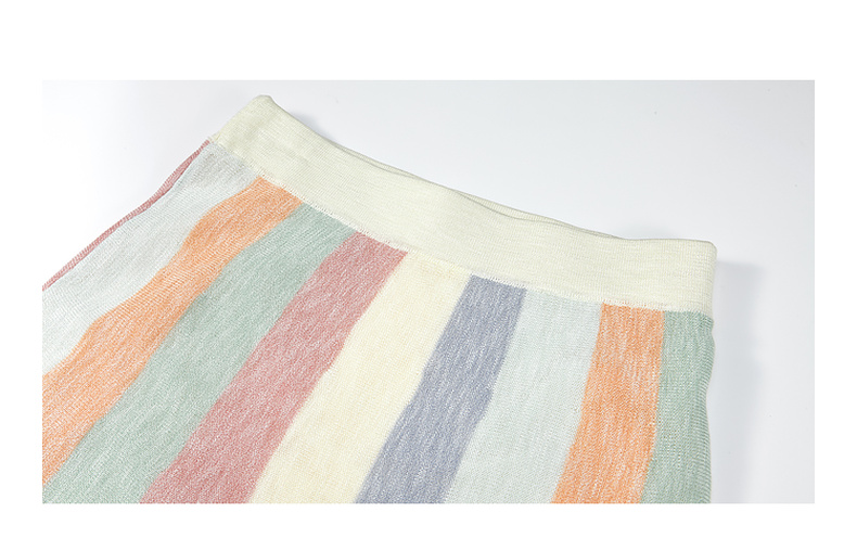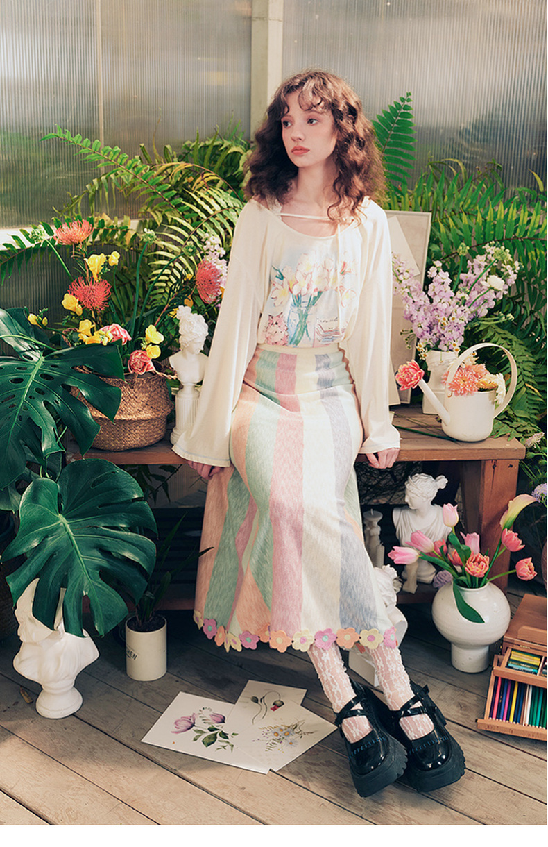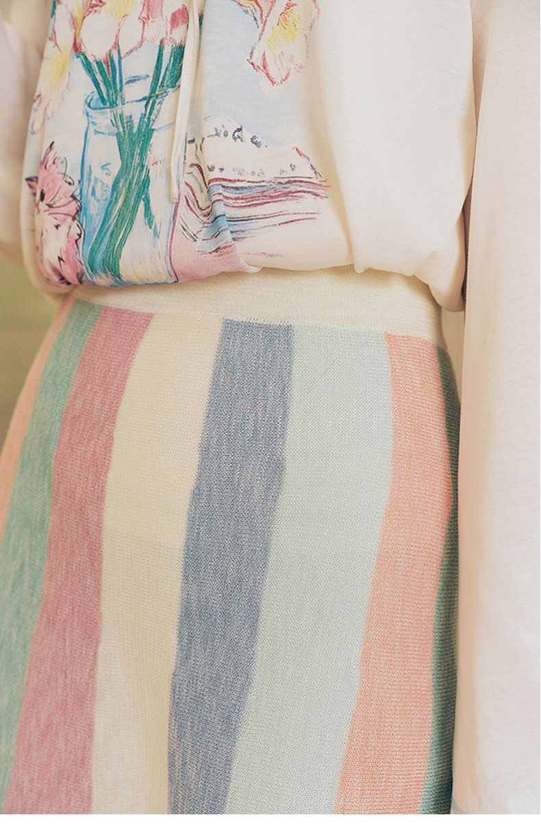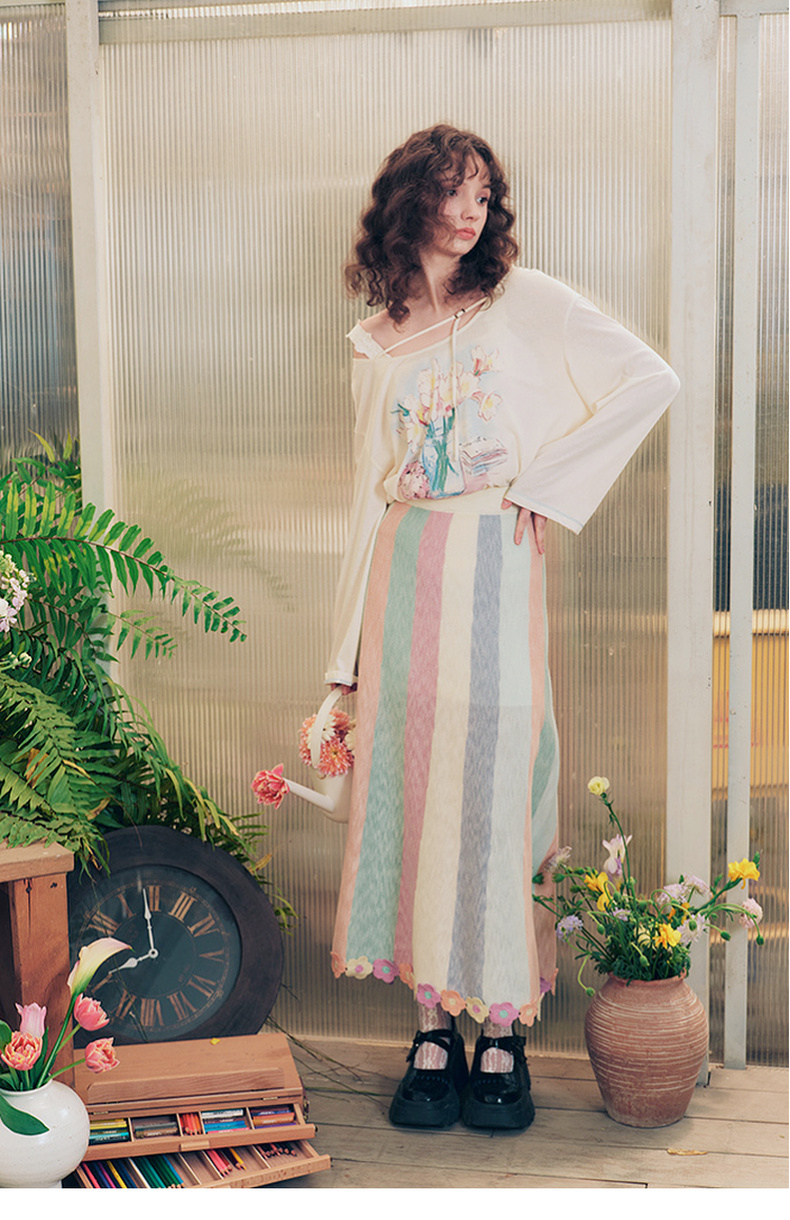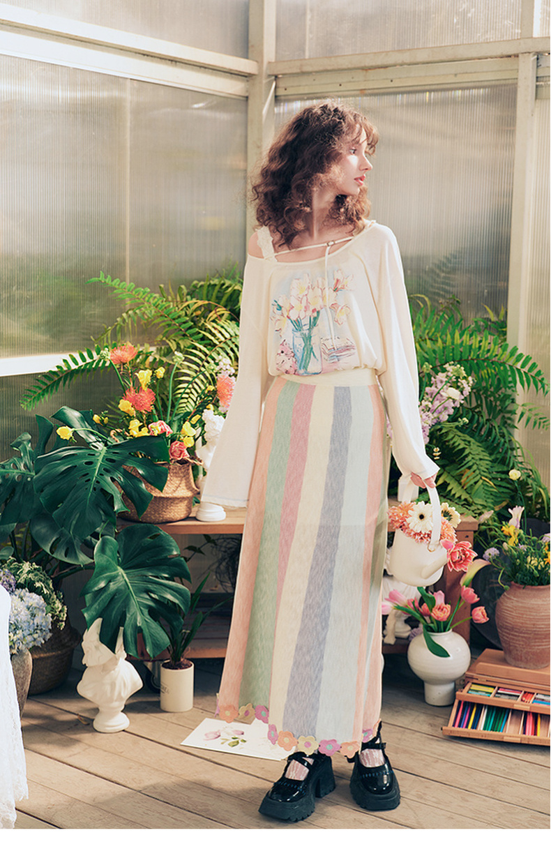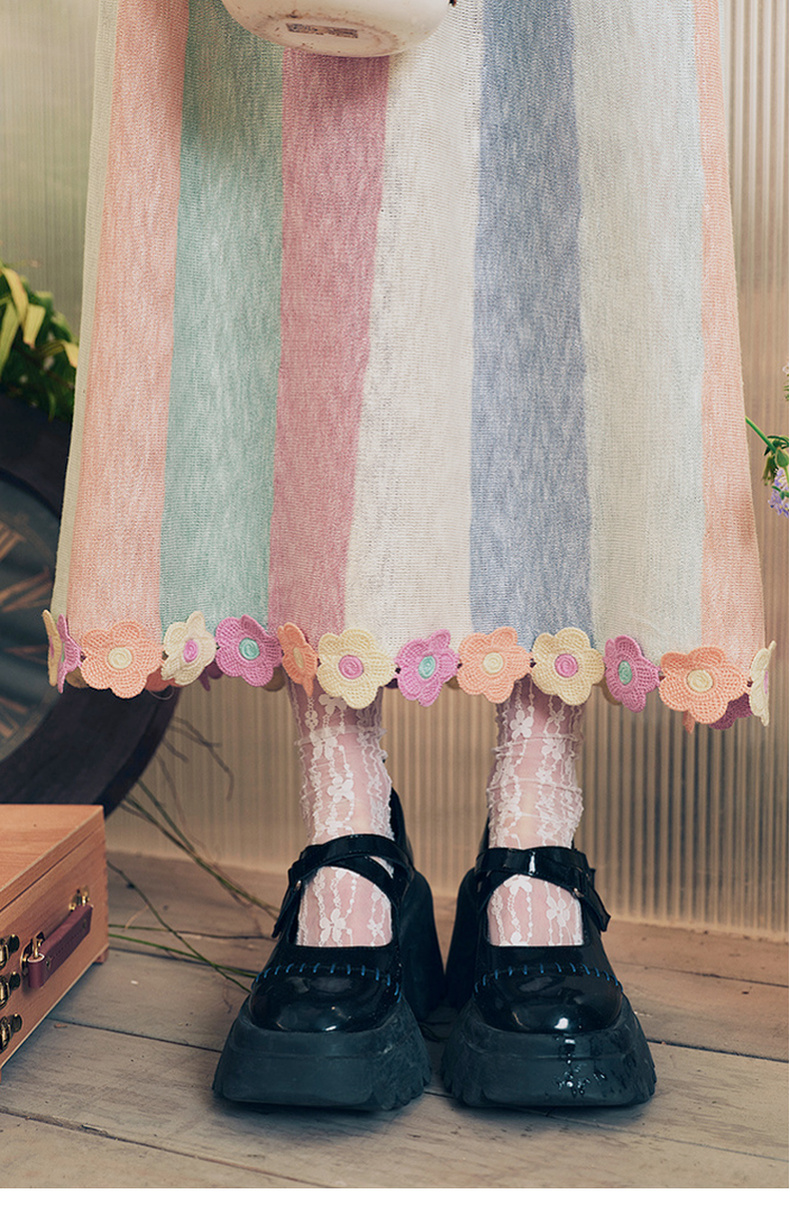 两三事 霓虹花轨 2025夏季新款立体手钩花裙摆拼色条纹半身裙长裙