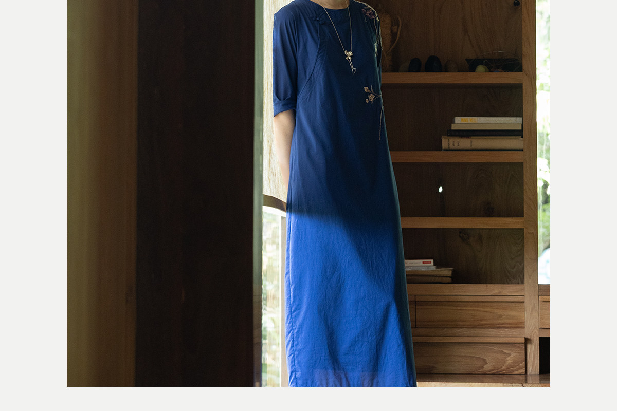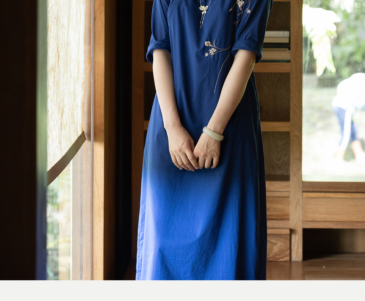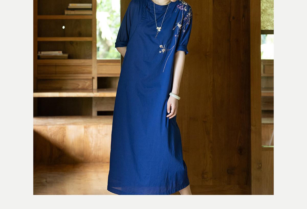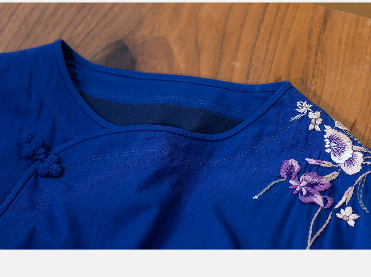 牧衣游原创 100支纯棉手工刺绣旗袍新款宽松蓝色新中式长裙 灿漫