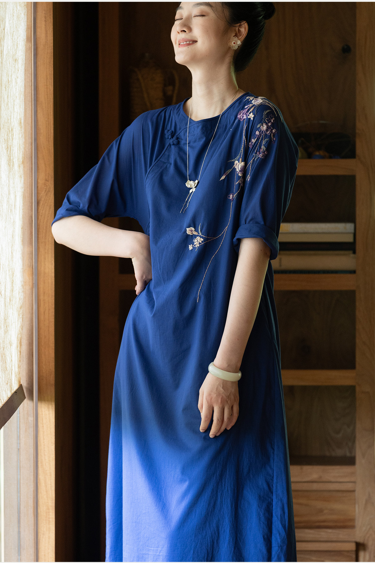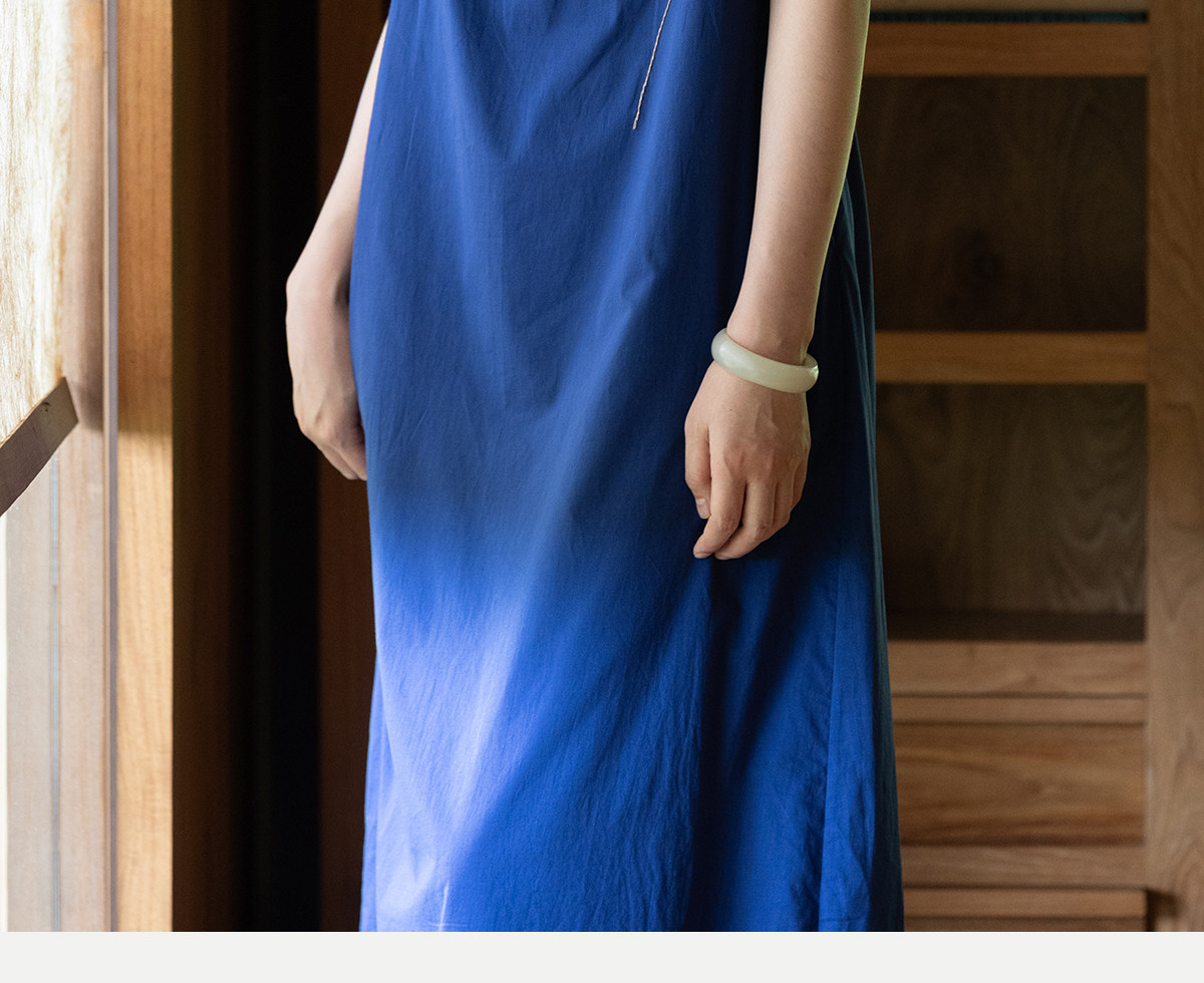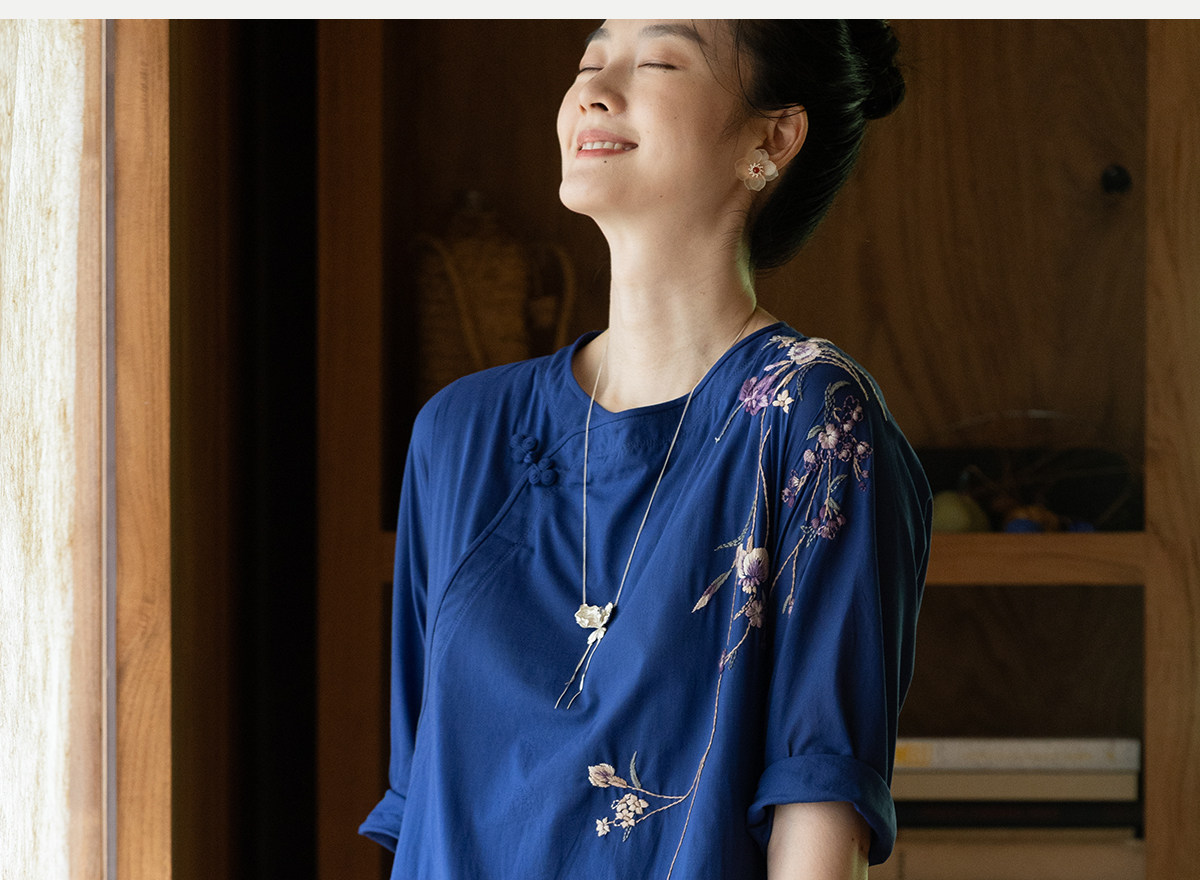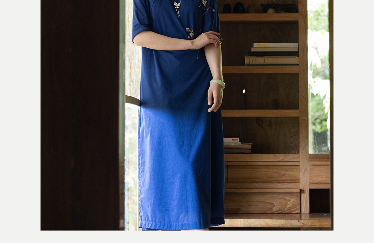 牧衣游原创 100支纯棉手工刺绣旗袍新款宽松蓝色新中式长裙 灿漫