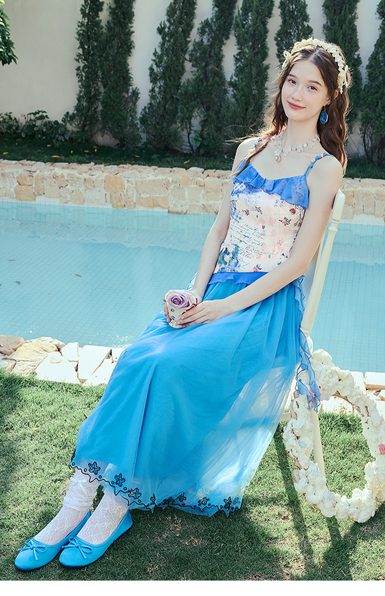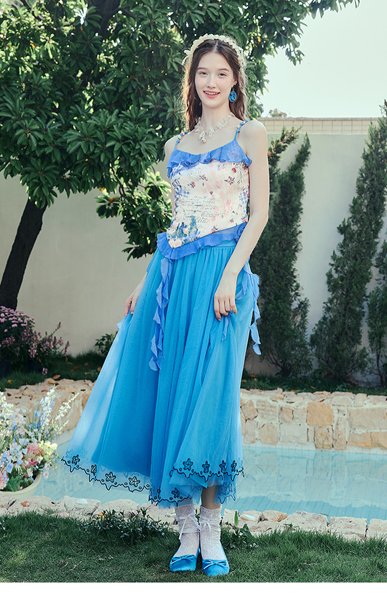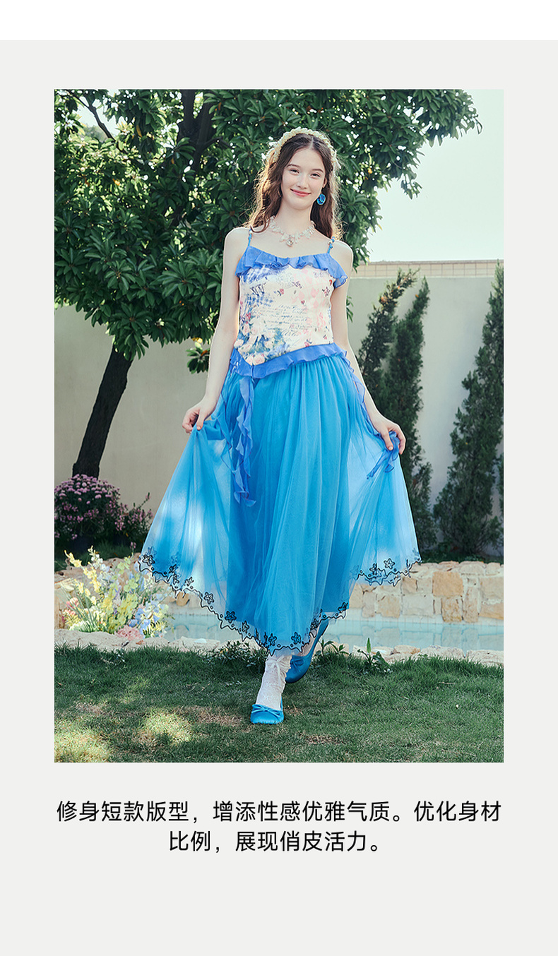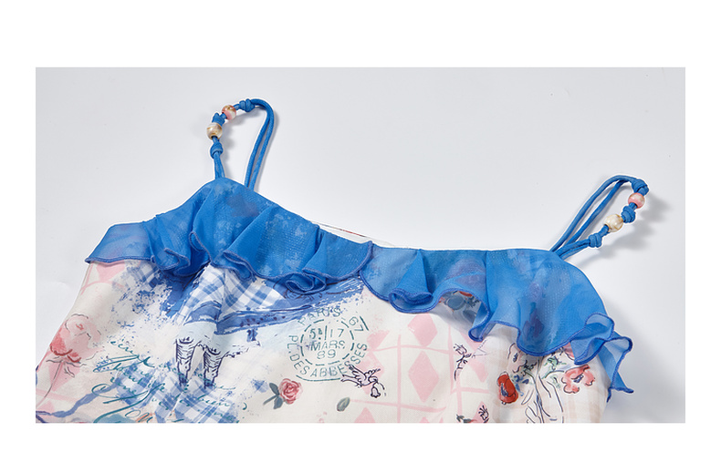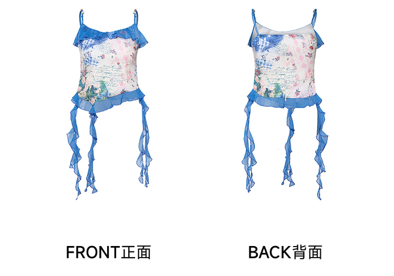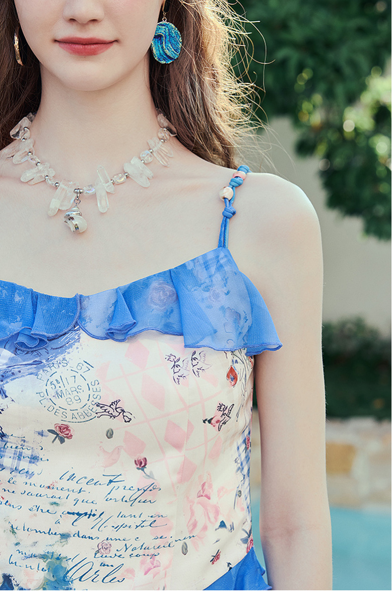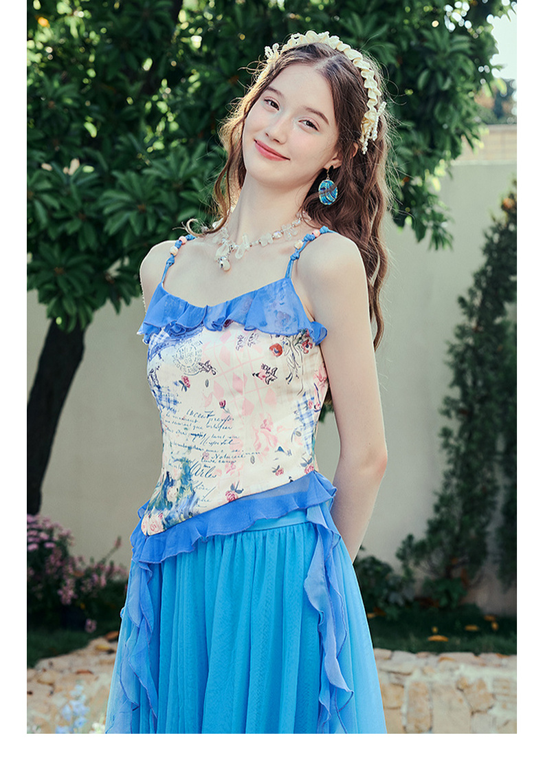 两三事 人鱼梦绘 2025夏季新款甜美荷叶边拼接印花吊带衫女