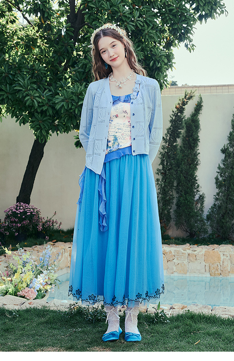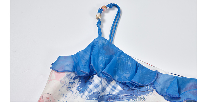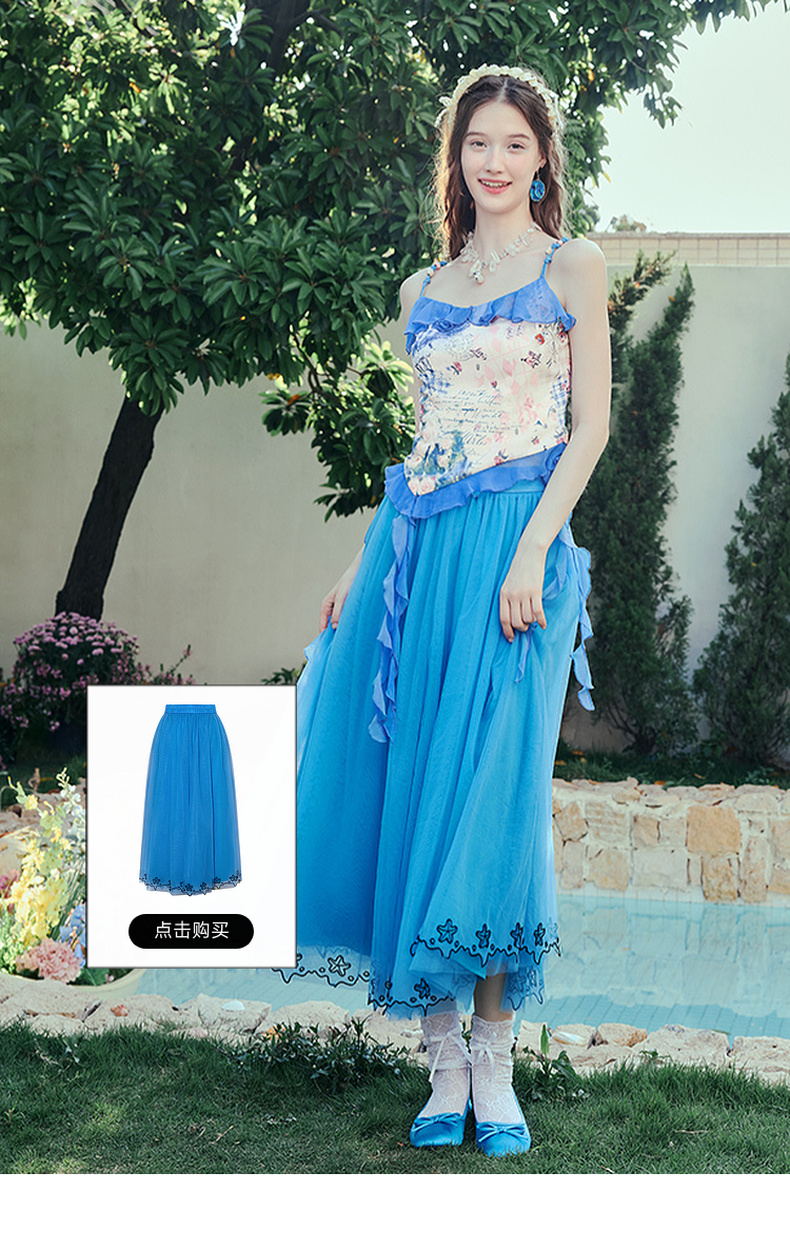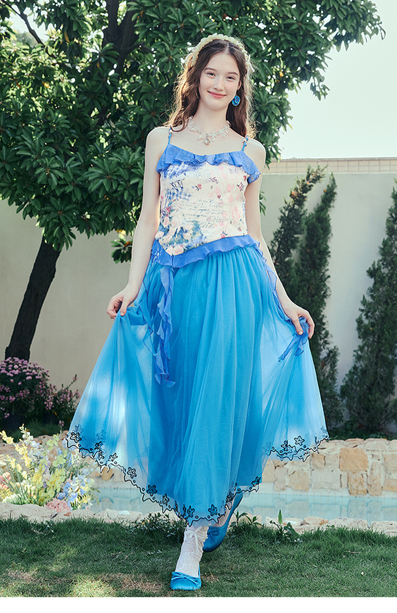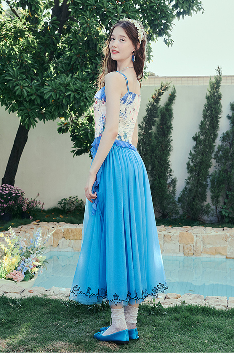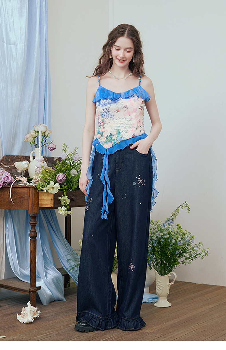 两三事 人鱼梦绘 2025夏季新款甜美荷叶边拼接印花吊带衫女