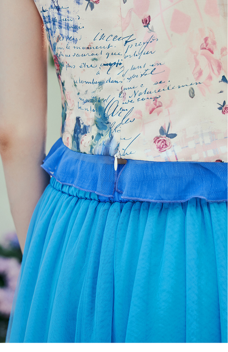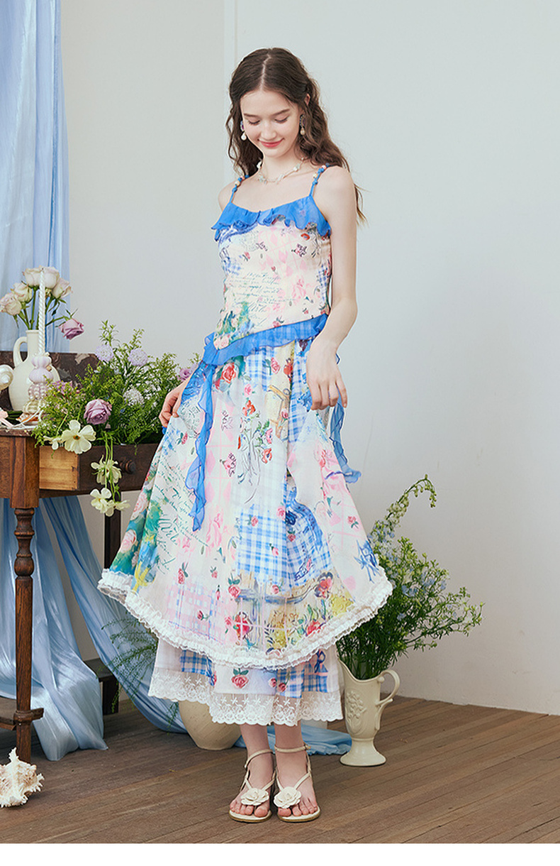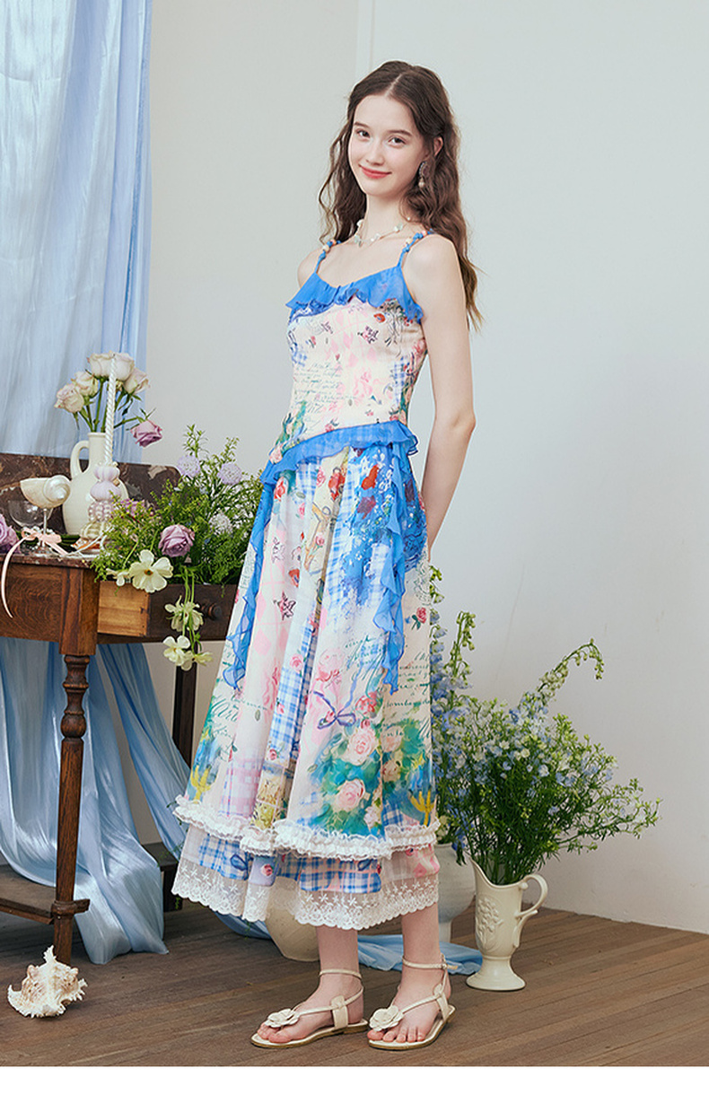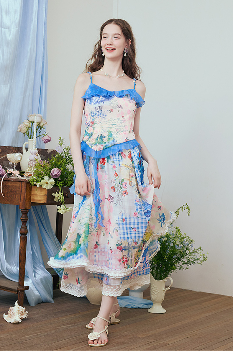 两三事 星隙独舞 2025夏季新款复古印花布拼接假两件吊带裙连衣裙