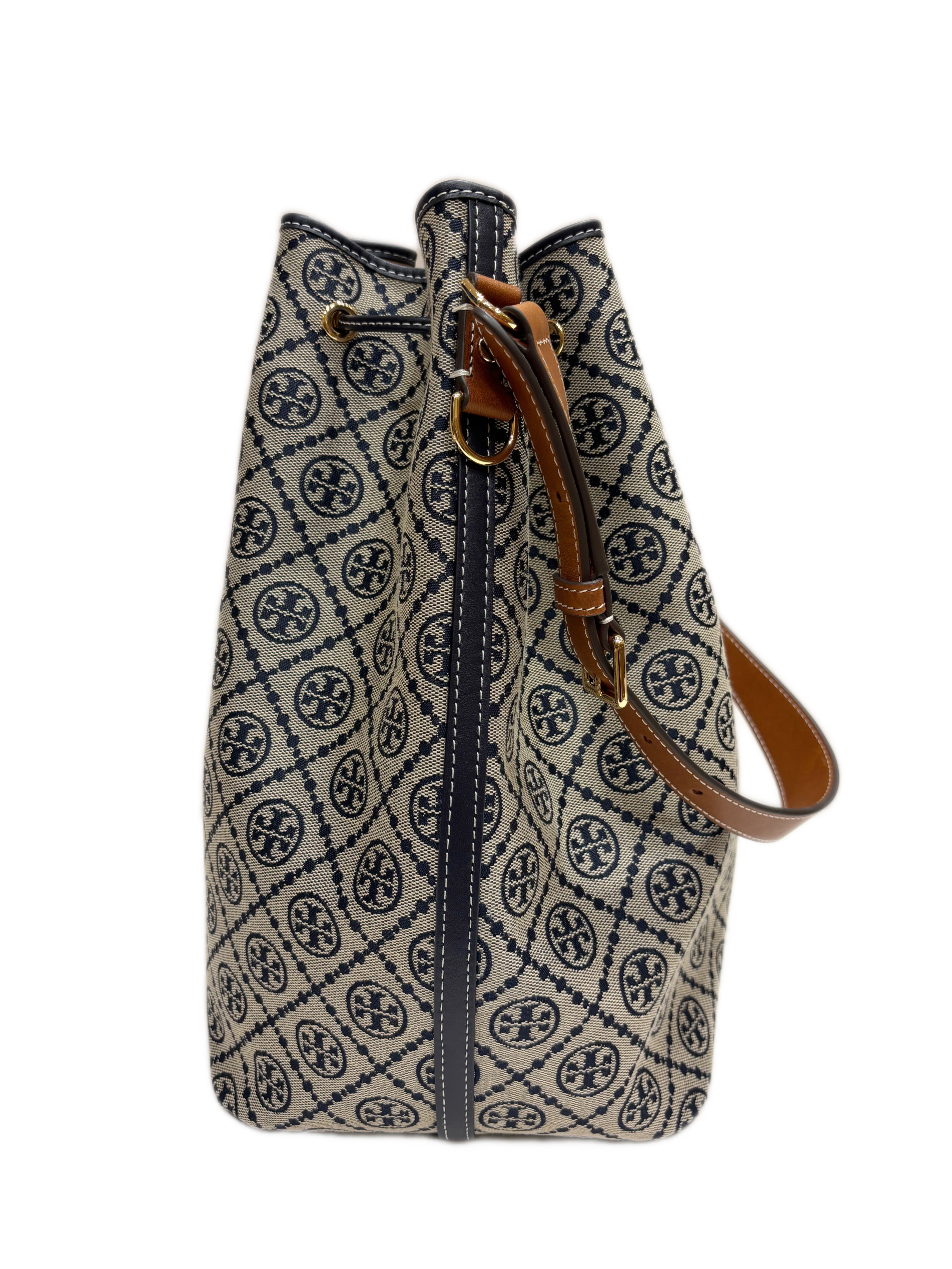 TORYBURCH汤丽柏琦官方旗舰店TMONOGRAM斜挎水桶包 经典TMonogram图案,融合提花织物。该系列魅力隽永,风格独具。这款水桶包采用细腻皮革饰边,配有顶部提柄和可拆卸斜背带。可通过金属双TLogo按扣调节抽绳长度。按压按扣可松开抽绳,停止按压即会锁上。每个细节均经过精心设计,尤其注重功能性与多样性的结合。