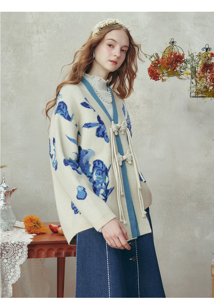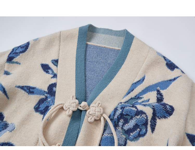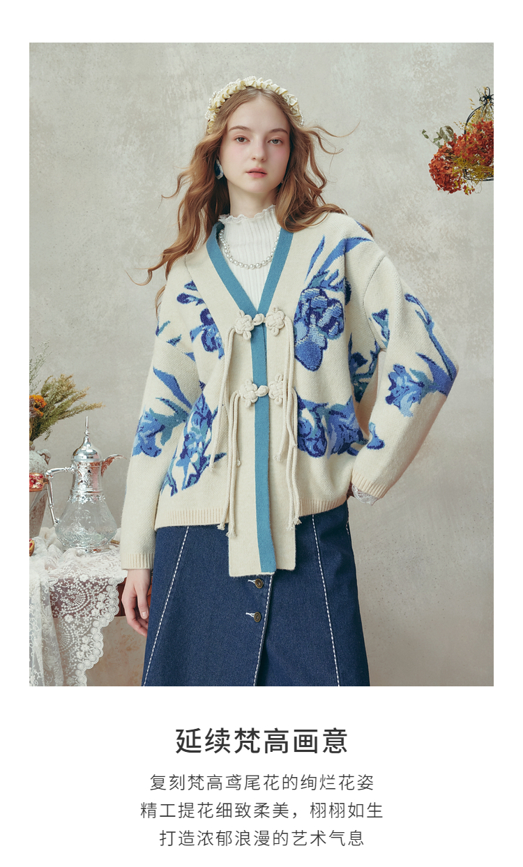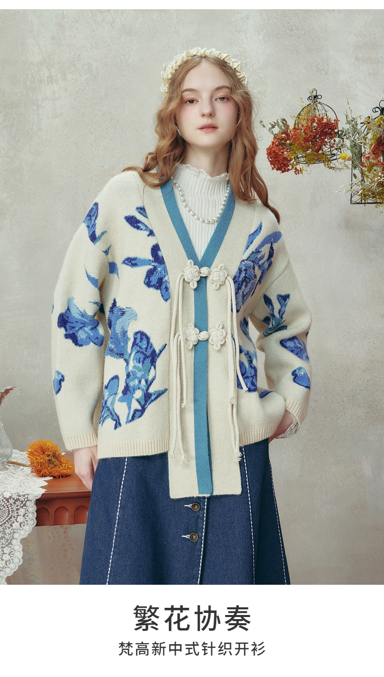 两三事梵高文艺繁花协奏2025冬季新款新中式提花绣盘扣毛衣开衫女