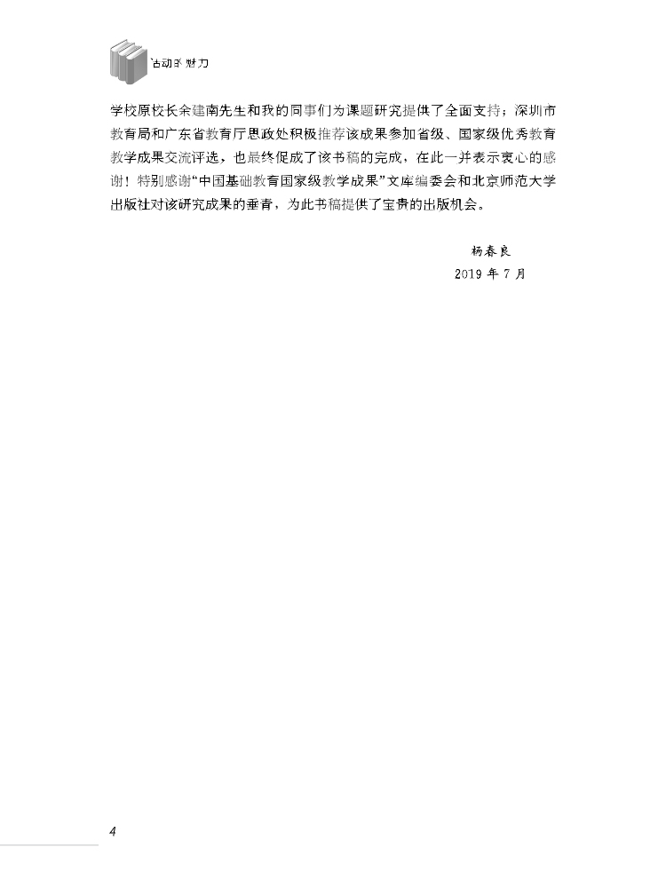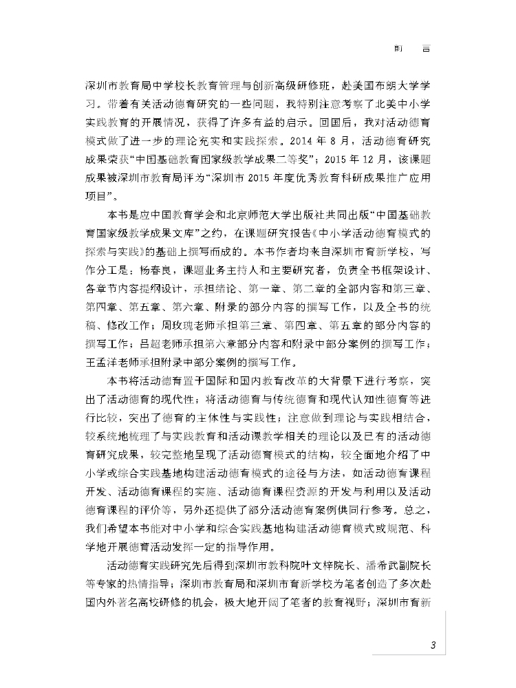 本书是2014年国家级教学成果奖(基教类)二等奖获奖成果。活动德育作为一种现代体验式道德教育模式既克服了传统道德教育“灌输”和“专制”的弊端,也弥补了现代认知发展道德教育脱离生活、缺乏实践的缺陷,其主体性、情境性、体验性、开放性、生成性和反思性等特点既反映了儿童道德成长的规律,也契合了当代世界学校道德教育改革发展的潮流。本书较完整地建立了“活动德育”的理论体系,对活动德育模式框架、活动德育课程开发、活动德育课程实施、活动德育课程评价以及校内外活动德育资源的整合利用等均进行了系统的阐释,同时,作者结合自己多年主持活动德育实践研究,给出了6个典型的活动德育教学案例,对中小学校和校外综合实践基地等校外教育机构策划、实施活动德育具有较高的参考价值。