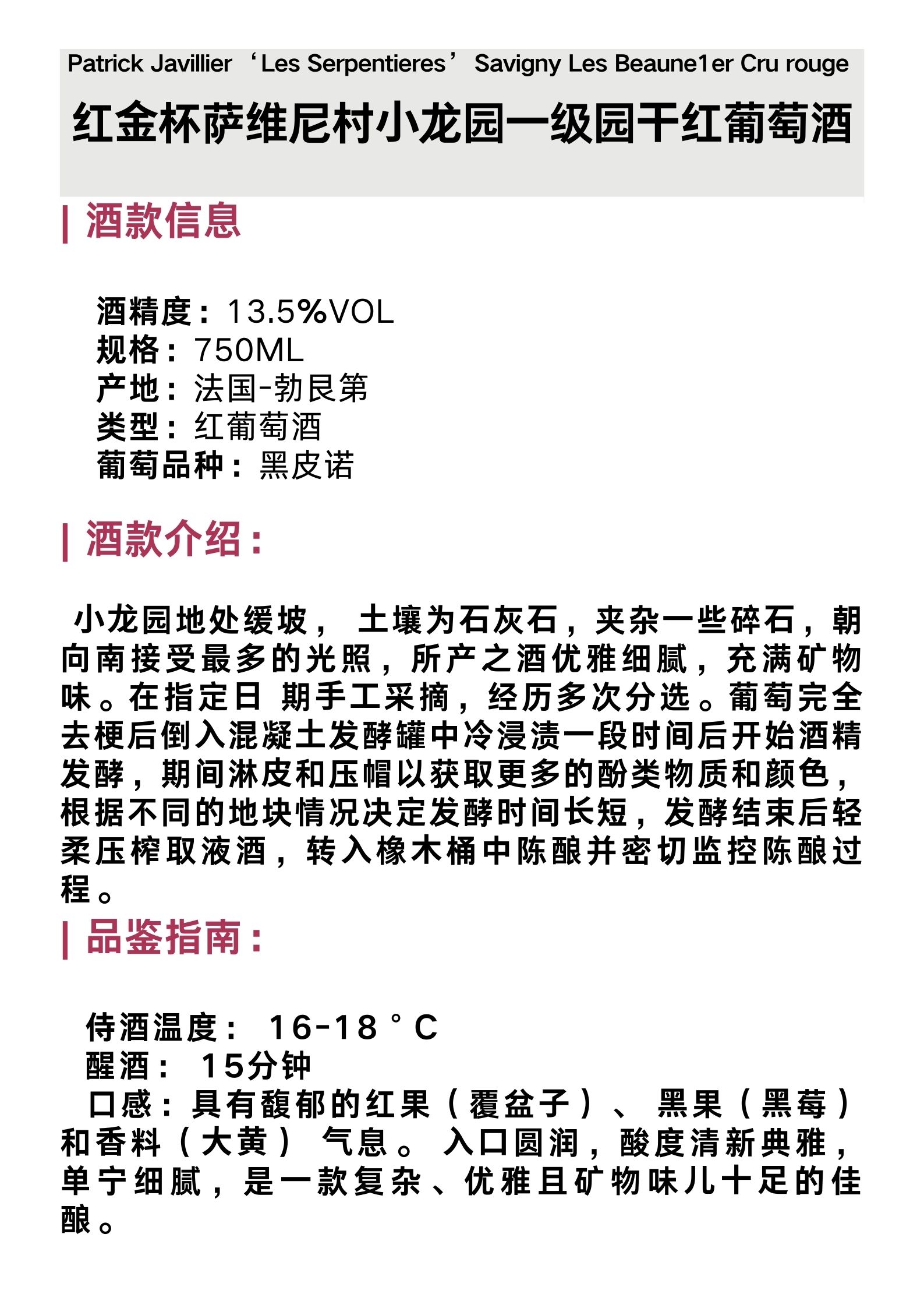 红金杯萨维尼村⼩龙园⼀级园⼲红葡萄酒 Patrick Javillier ‘Les Serpentieres’ Savigny Les Beaune 1er Cru rouge