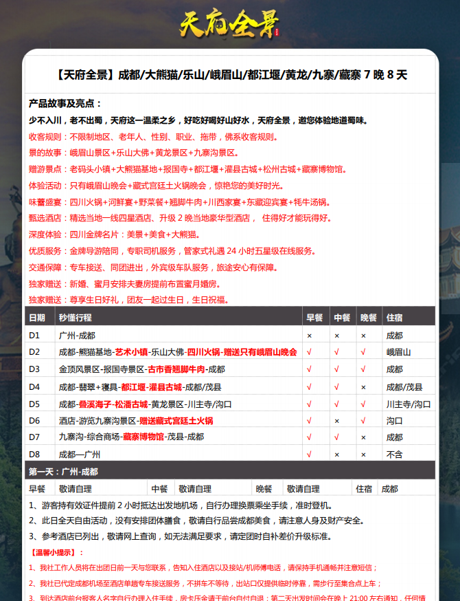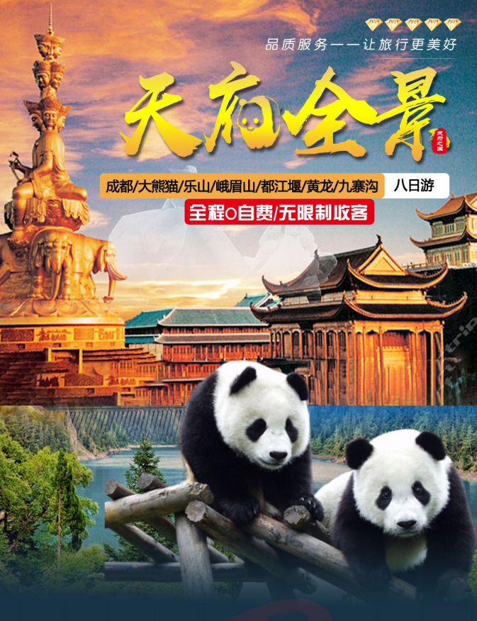 【天府全景】成都/大熊猫/乐山/峨眉山/都江堰/黄龙/九寨/藏寨7晚8天