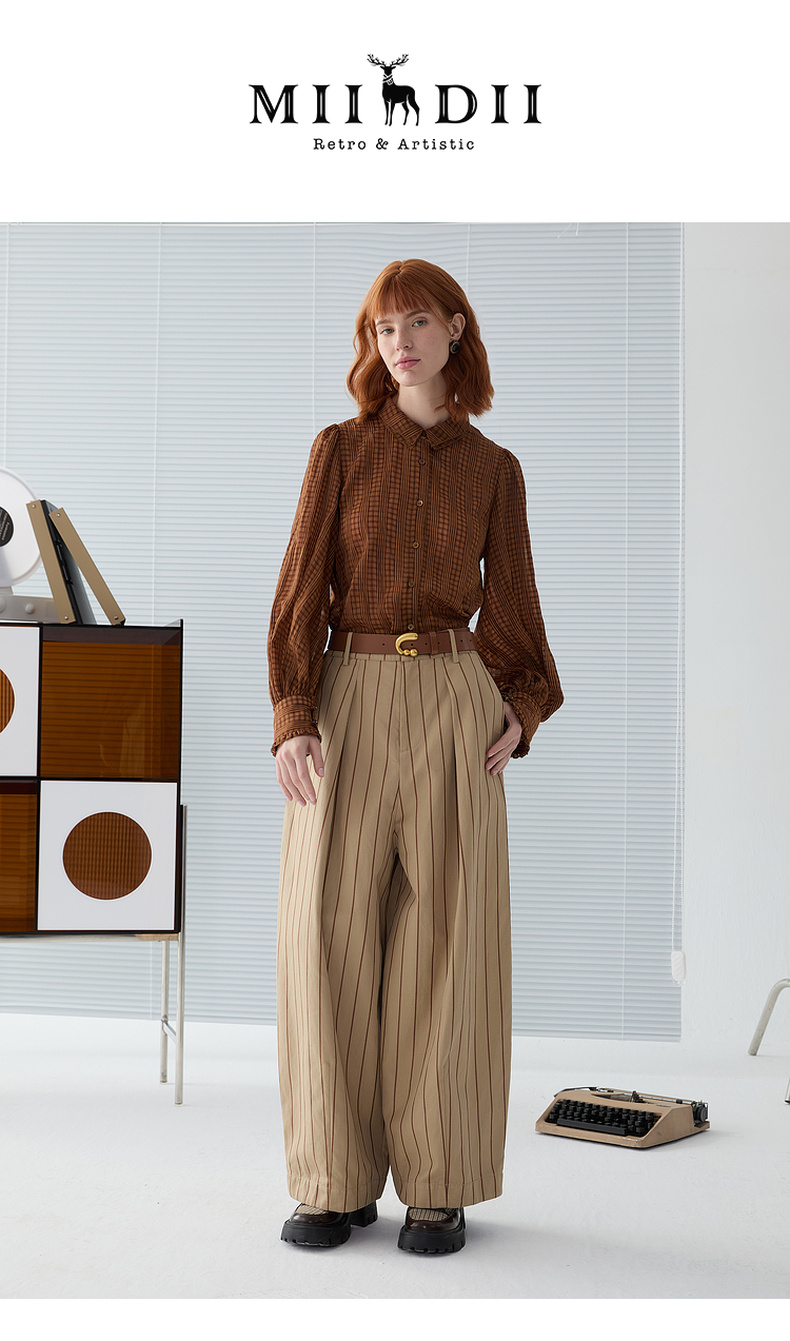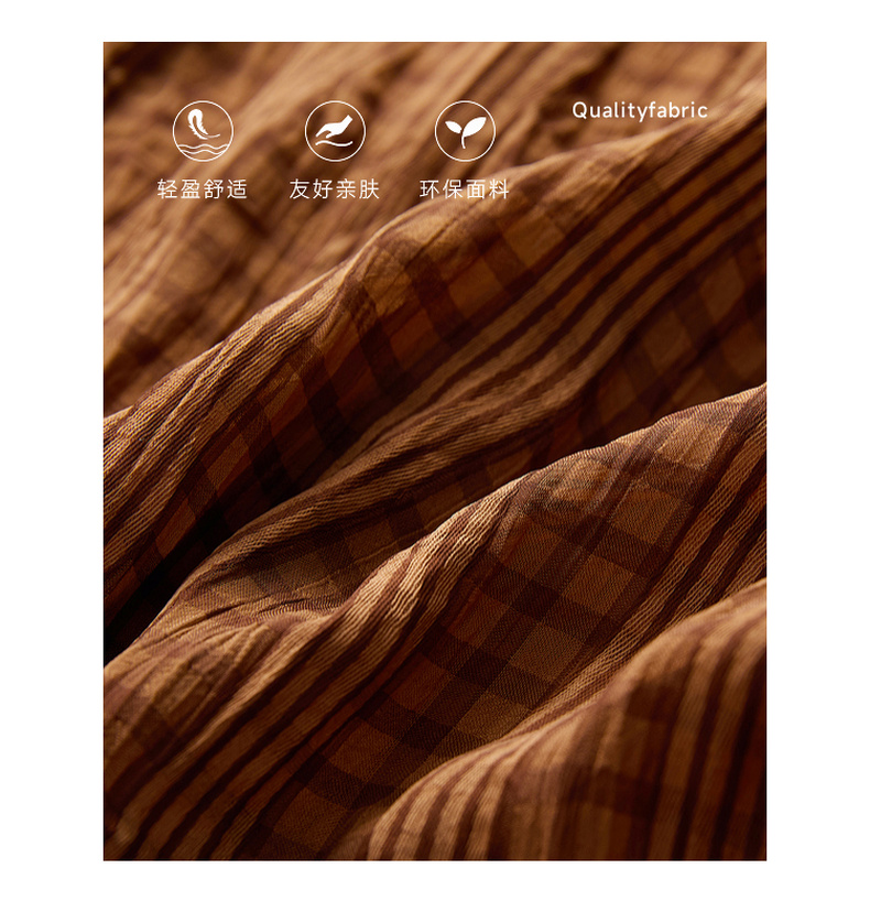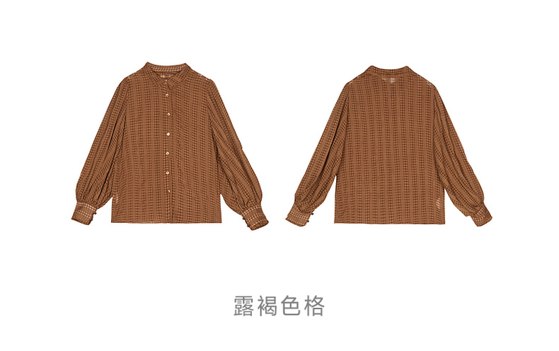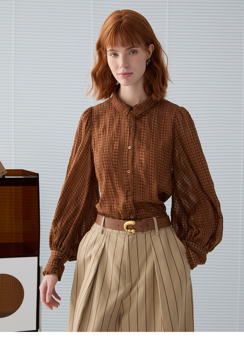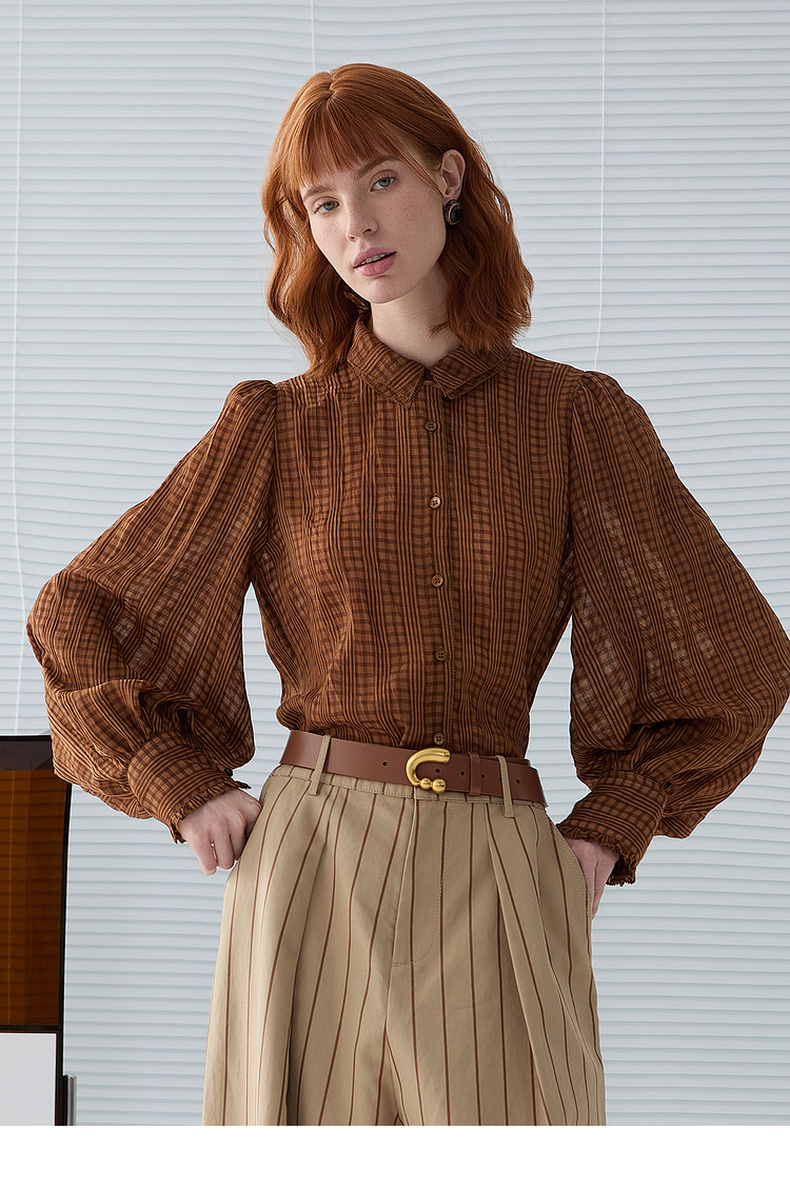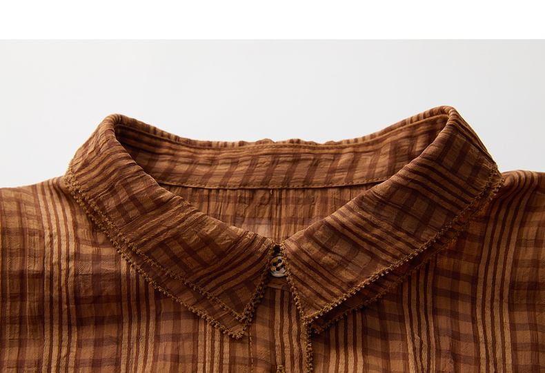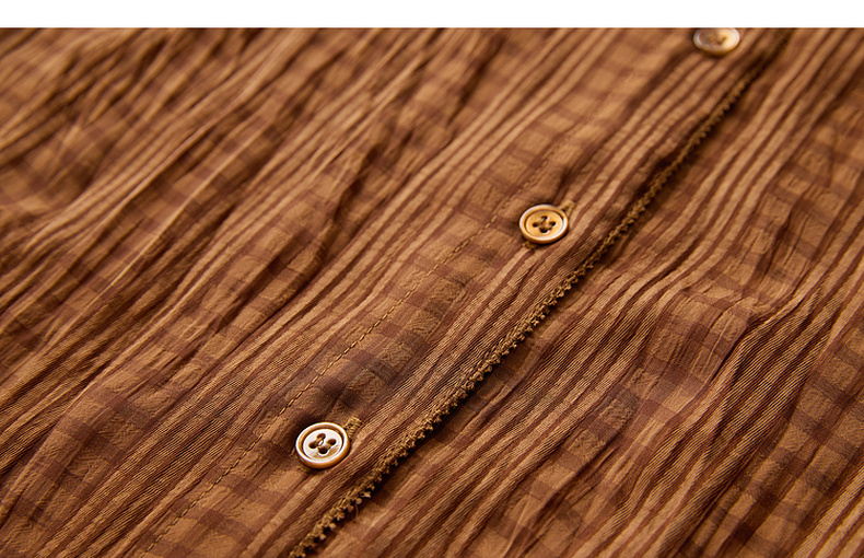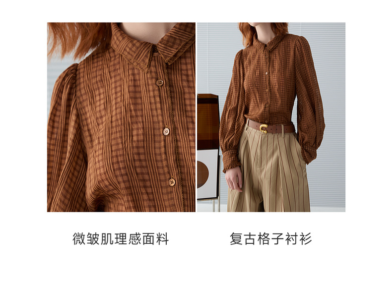 谜底格纹衬衫长袖女2025春季新品复古风微皱肌理感衬衣251MC0109