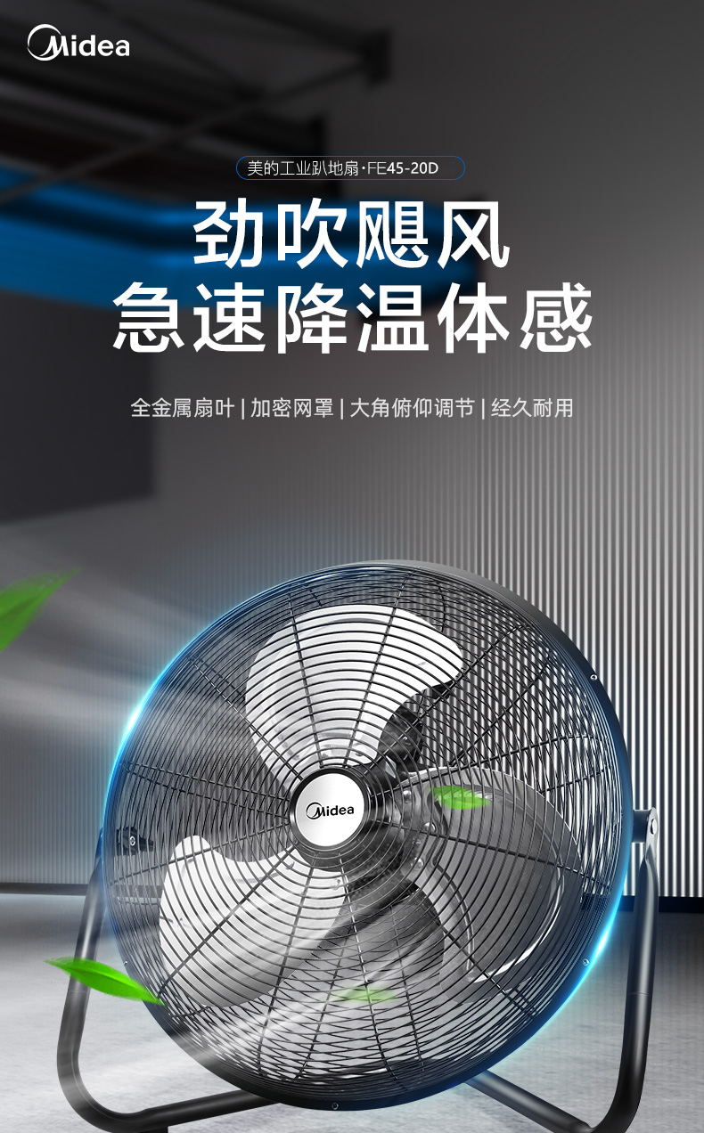美的 Midea FE45-20D工业电风扇趴地扇强力大功率爬地扇金属扇铝叶上下手动摇头车间餐厅工厂食堂(线下同款)