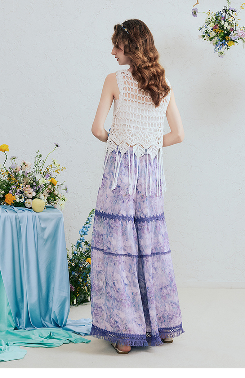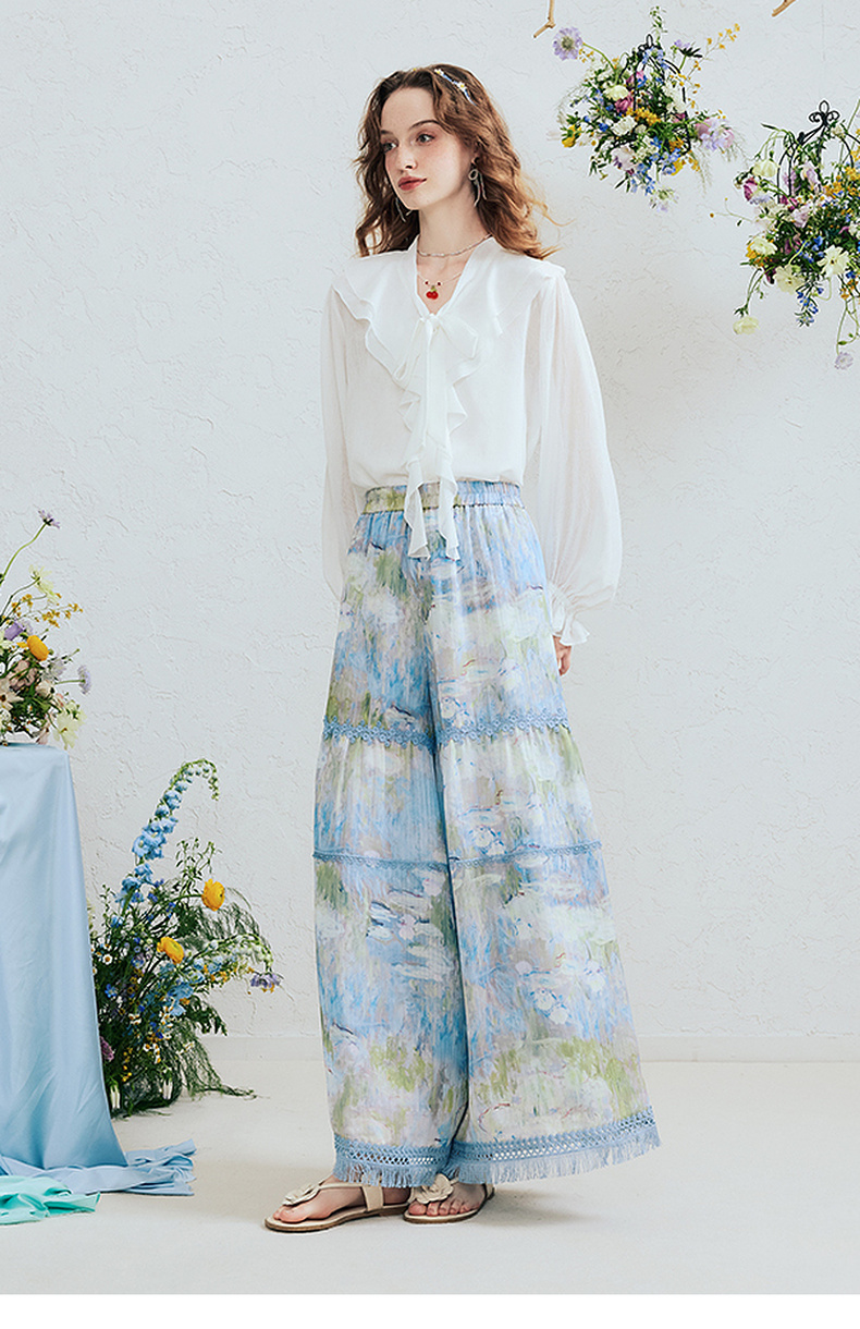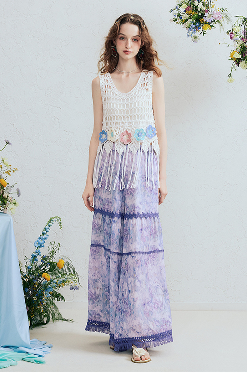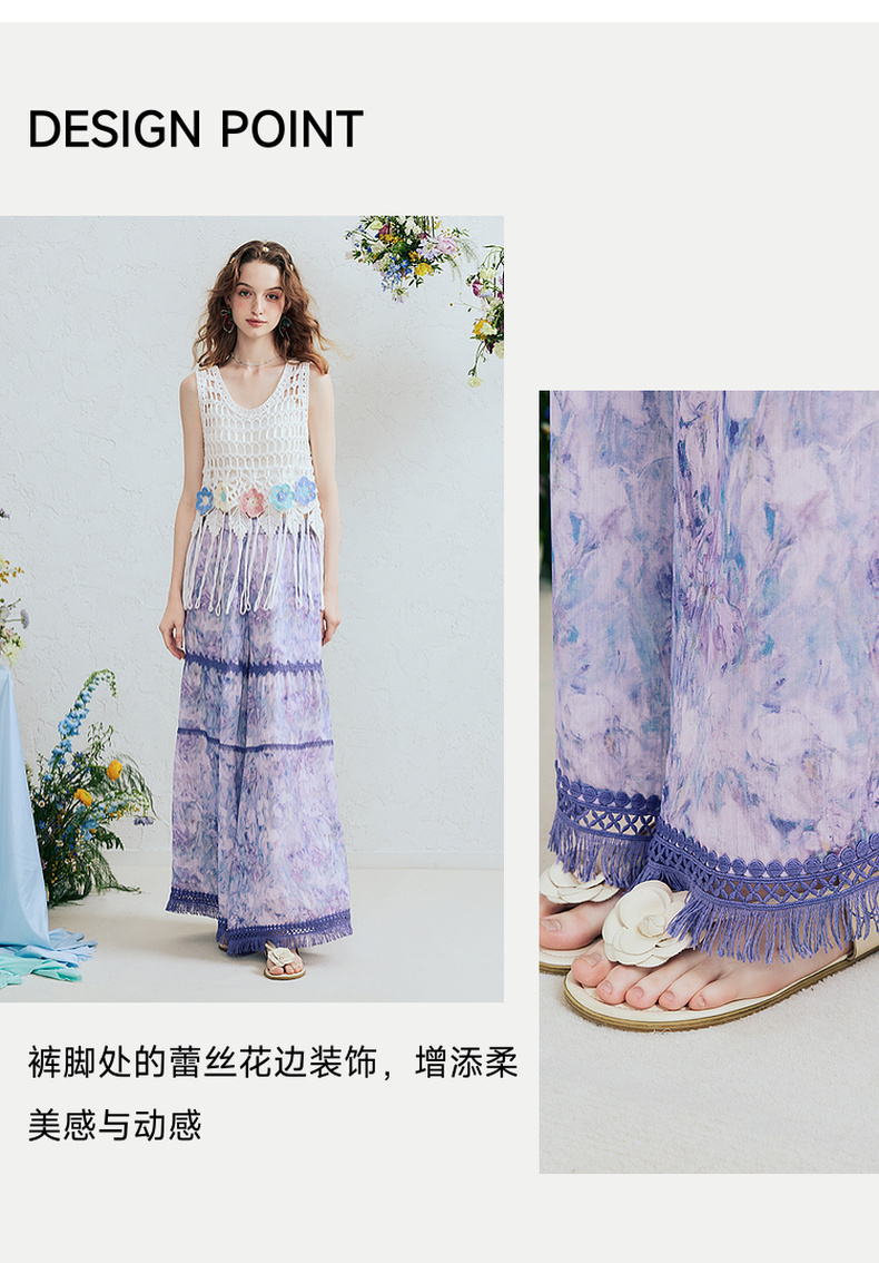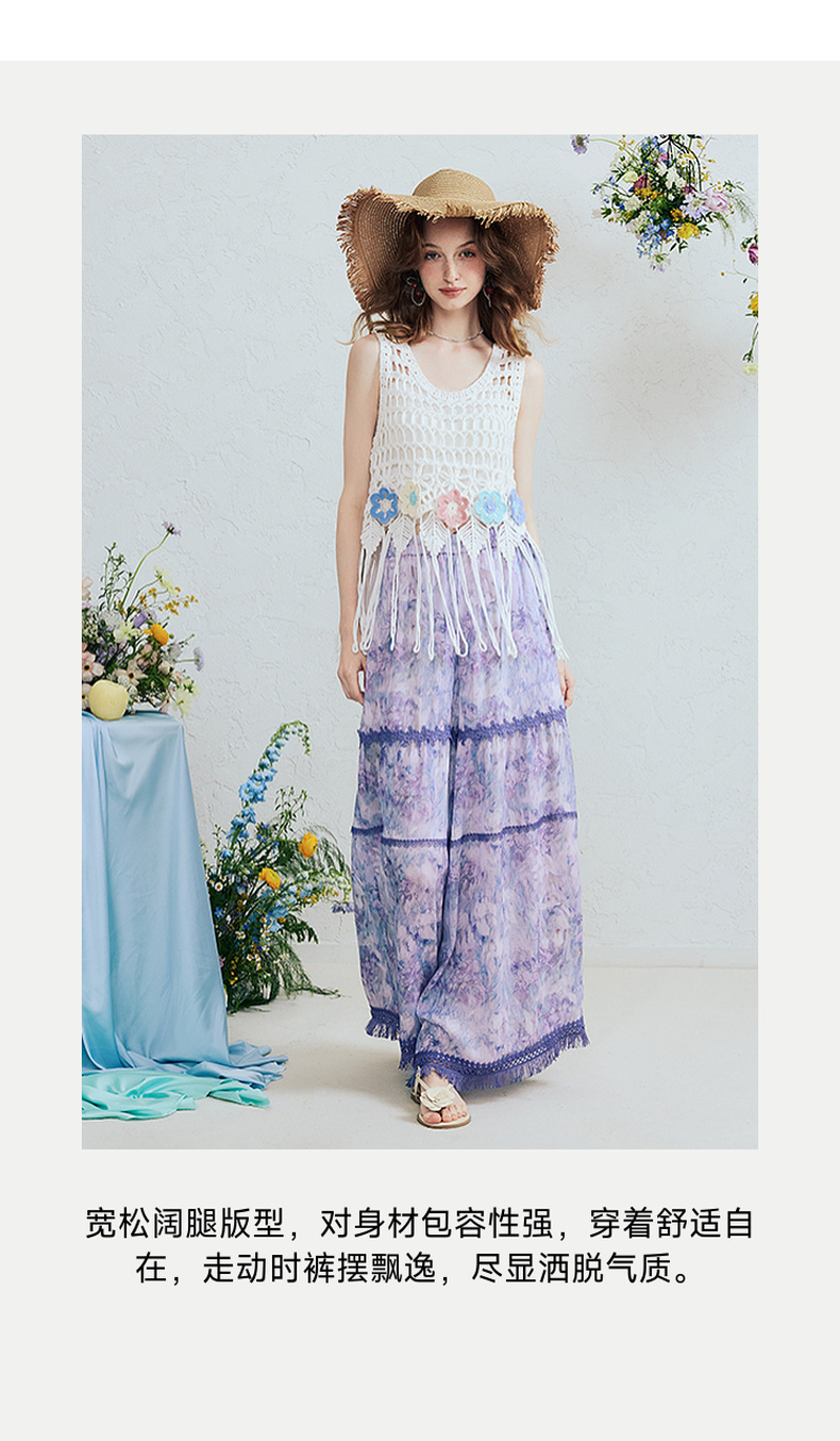 两三事 雾眠洄游 2025夏季新款小清新流苏裤脚口印花阔腿休闲裤女