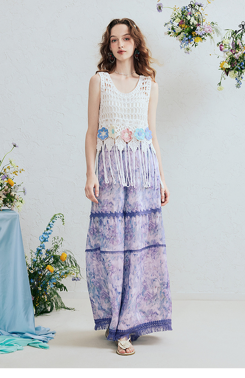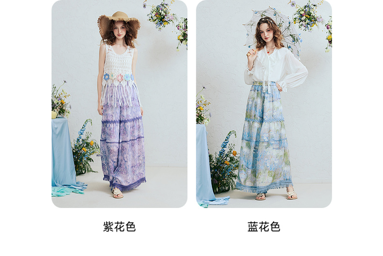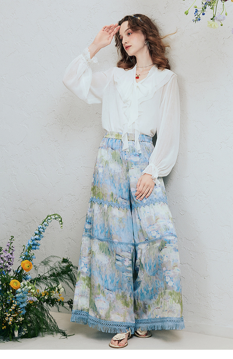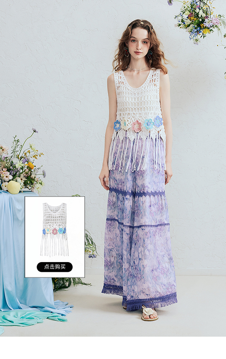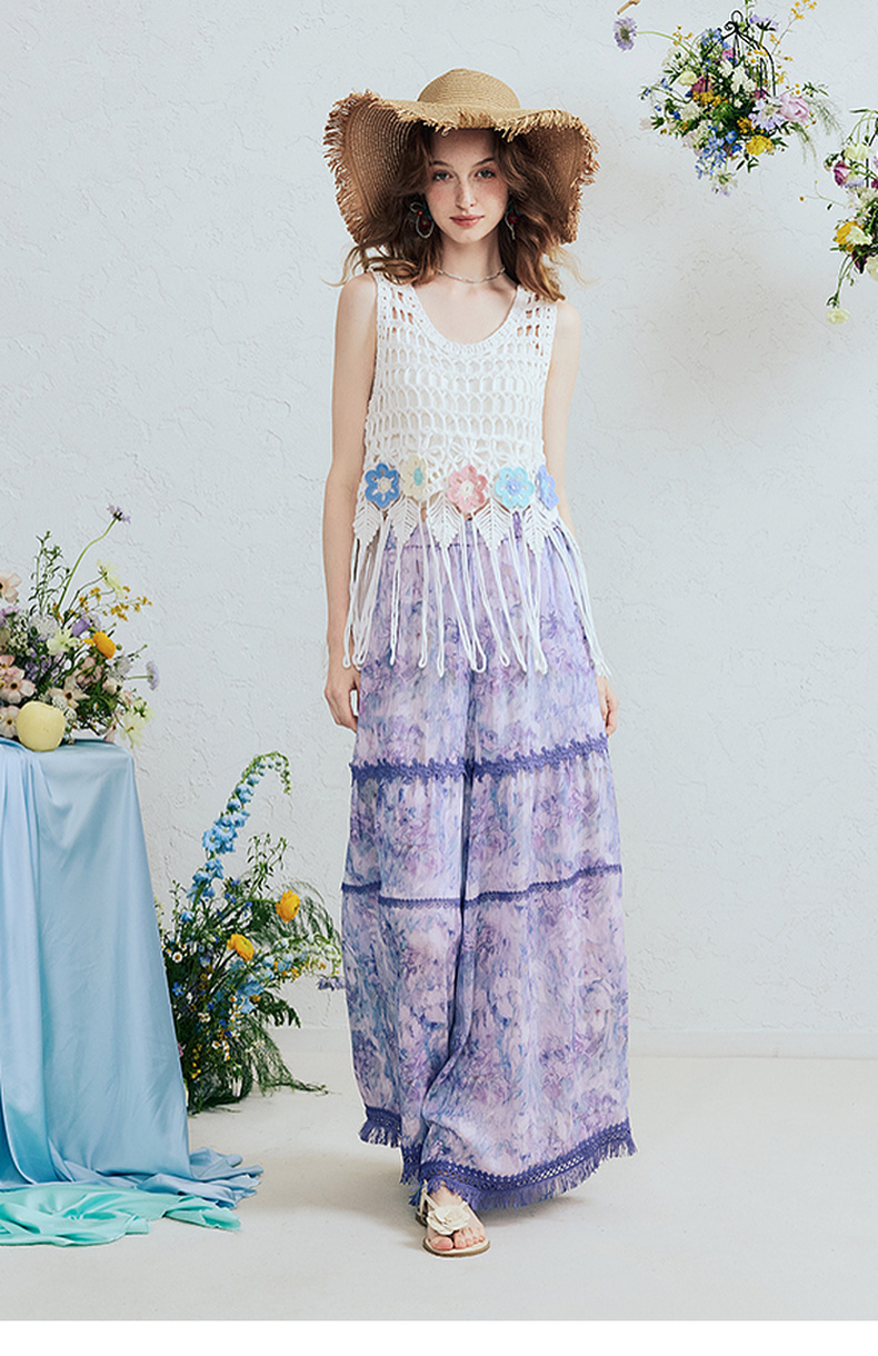 两三事 雾眠洄游 2025夏季新款小清新流苏裤脚口印花阔腿休闲裤女