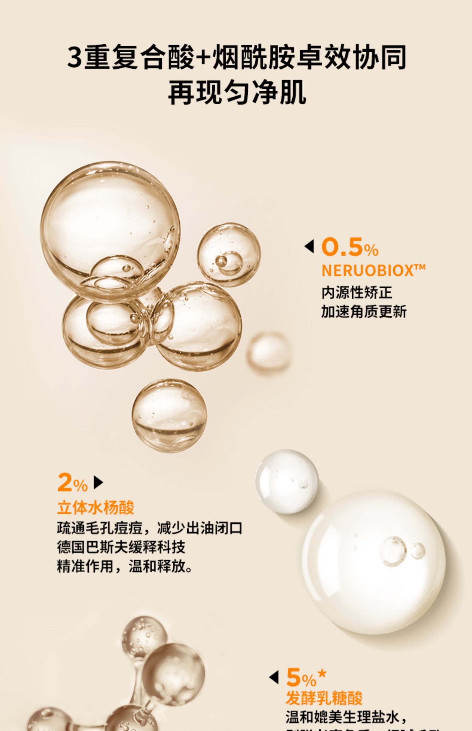进阶式焕肤,降低水杨酸浓度,提高烟酰胺浓度,源头抑制黑色素,带给肌肤10倍焕白力,迅速提亮肤色。发酵乳糖酸,剥离老废角质,细腻毛孔。