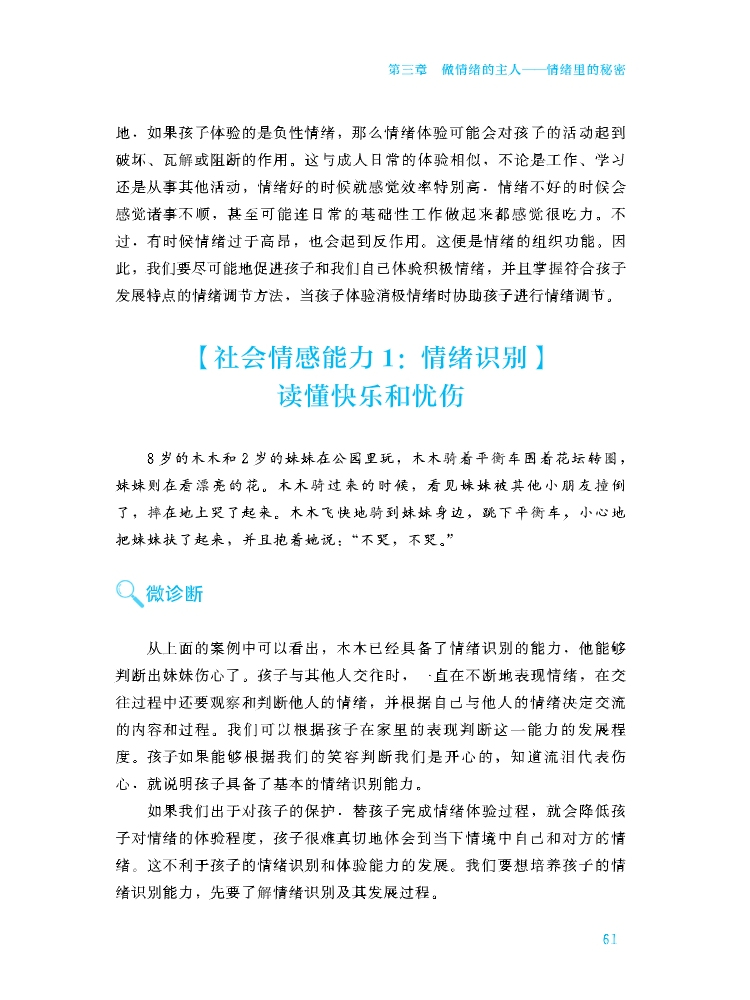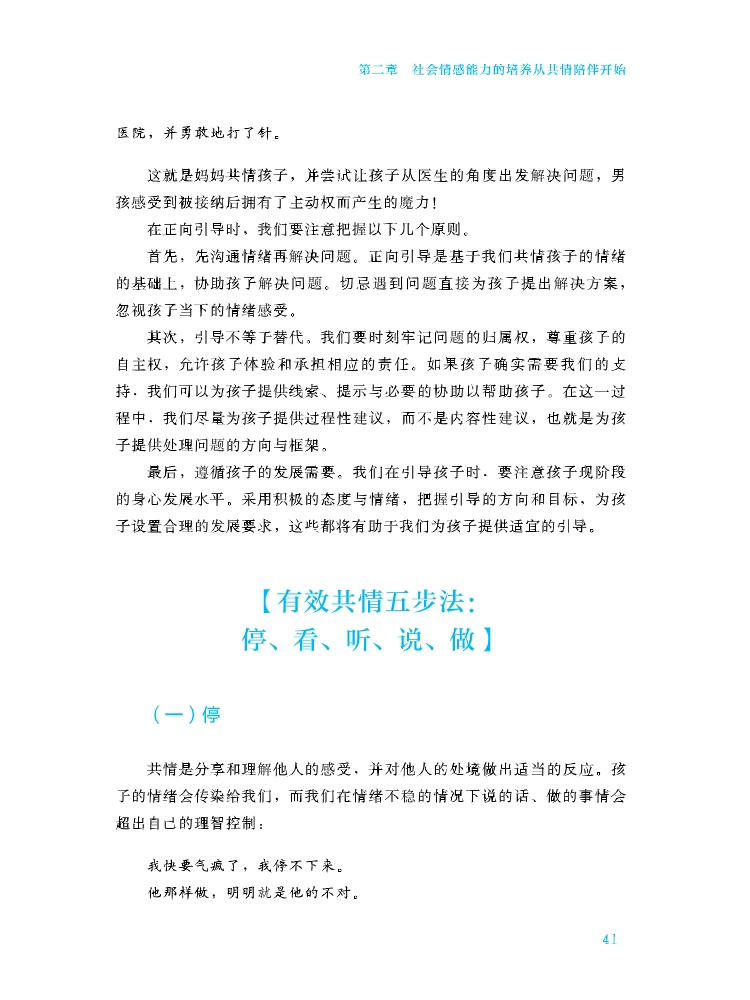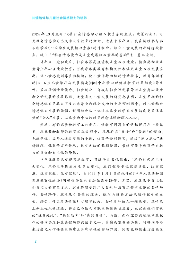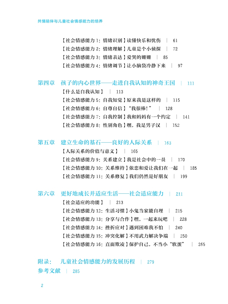 作者基于人本心理咨询理念,建构出人本主义理念中真诚、尊重(无条件积极关注)、共情三个核心条件在儿童教育实践中的应用策略,即通过提升教师和父母的共情陪伴能力来发展儿童关键经验,已得到了较为广泛的实践检验。本书提出了以情绪为核心的儿童16项关键经验,并进一步提炼为情绪管理能力(包括情绪识别、情绪理解、情绪表达和情绪调节)、自我认知能力(包括自我知觉、自尊自信、自我控制和性别角色)、人际沟通能力(包括亲子依恋、师幼关系和同伴关系)和社会适应能力(包括生活习惯、挫折应对、合作分享、冲突化解和直面欺凌)四个维度。在此基础上,阐述如何运用“停、看、听、说、做”的共情陪伴“三环五步法”促进这些儿童关键经验的习得。儿童关键经验的自我认知、情绪管理、人际沟通、社会适应是中国学生发展核心素养的关键组成部分。