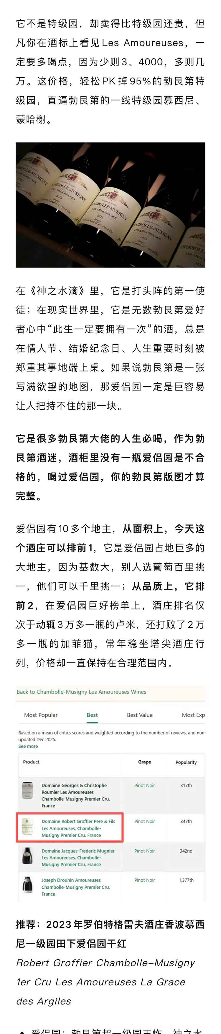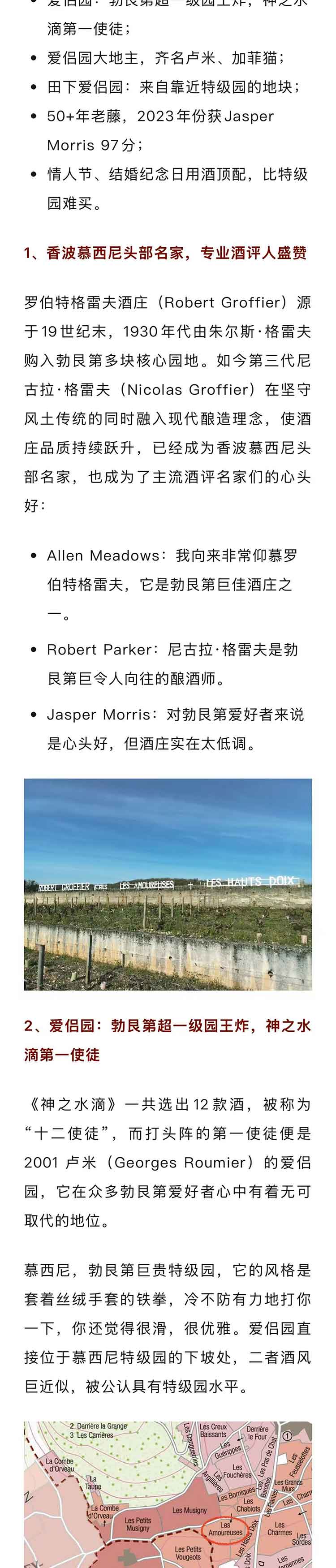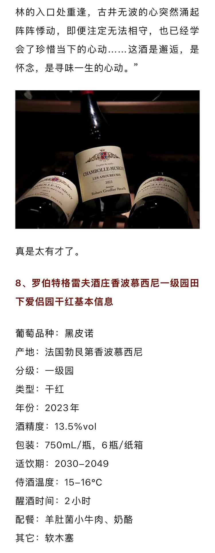 【JM 97分】法国勃艮第2023年罗伯特格雷夫酒庄香波慕西尼一级园田下爱侣园黑皮诺干红