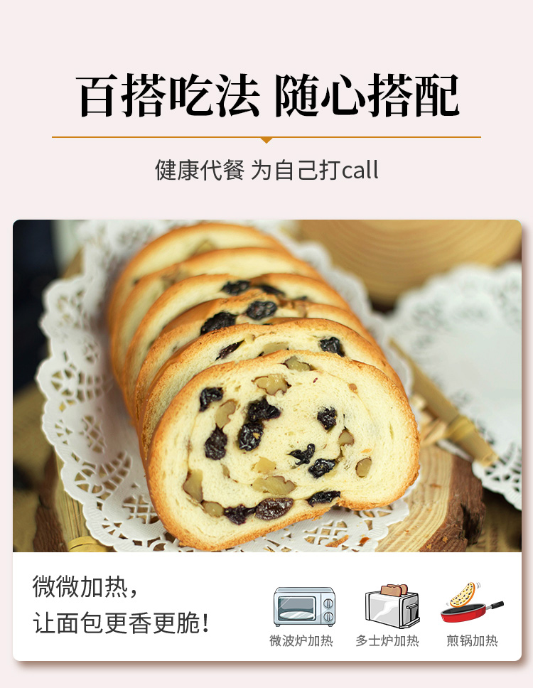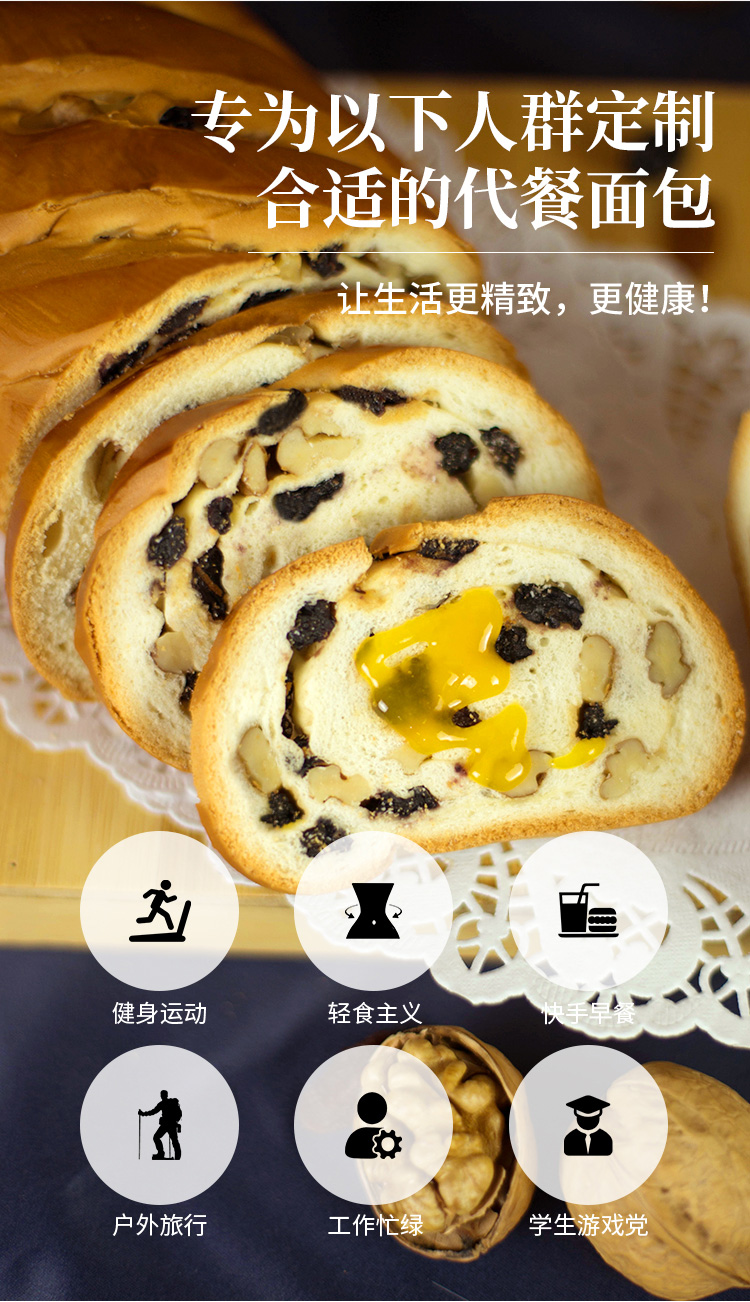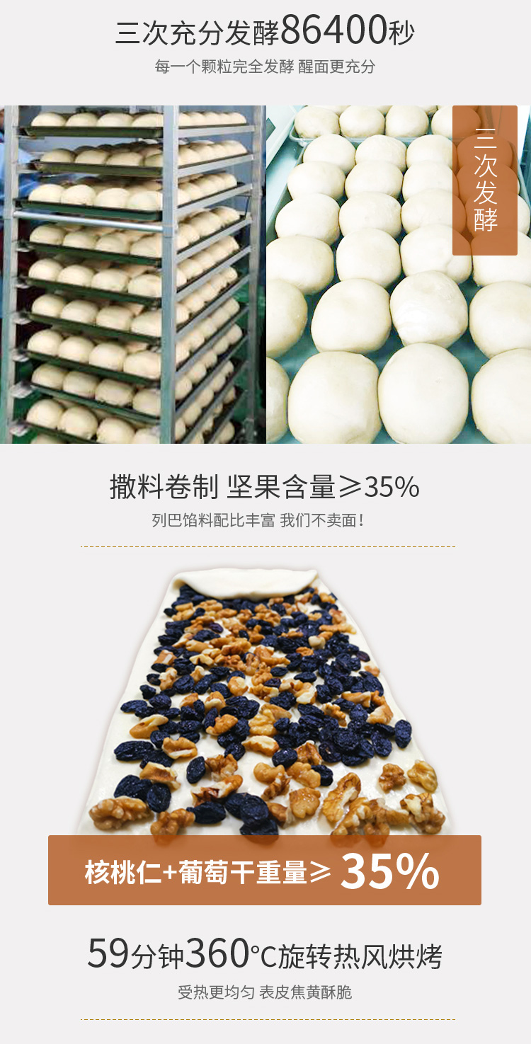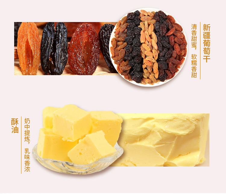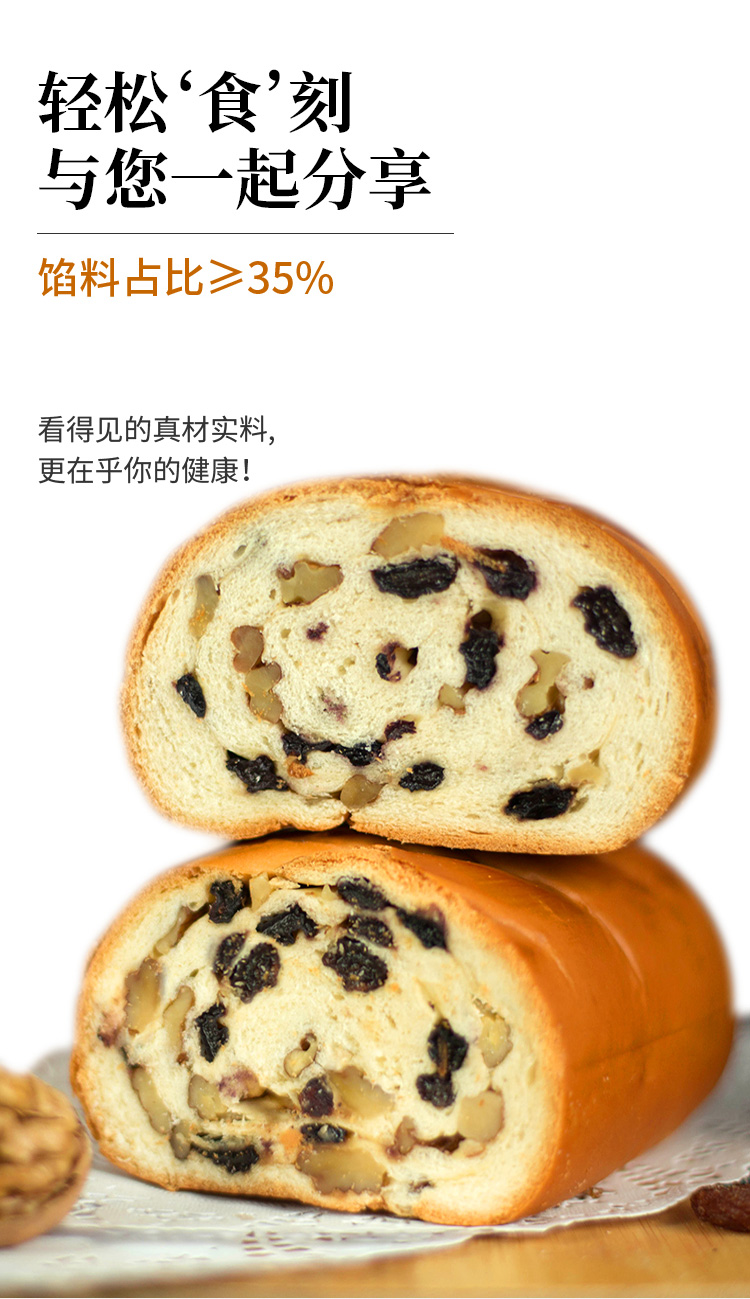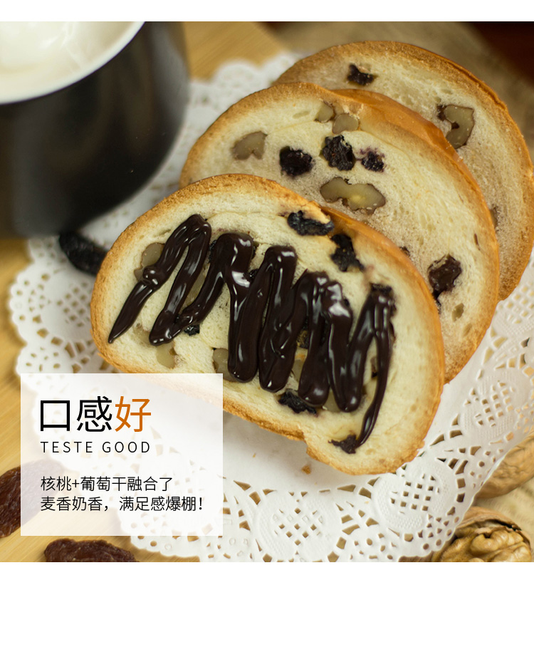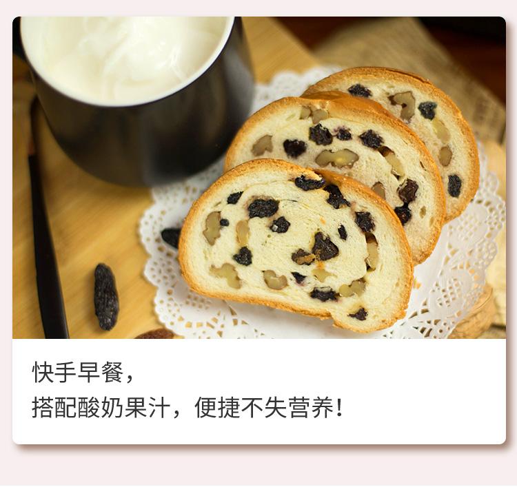 【配料】小麦粉、葡萄干、纯牛奶、核桃仁、白砂糖、鸡蛋、黄油、全脂乳粉、食用盐、酵母、乳清发酵物(乳清粉、酵母加工制品)
