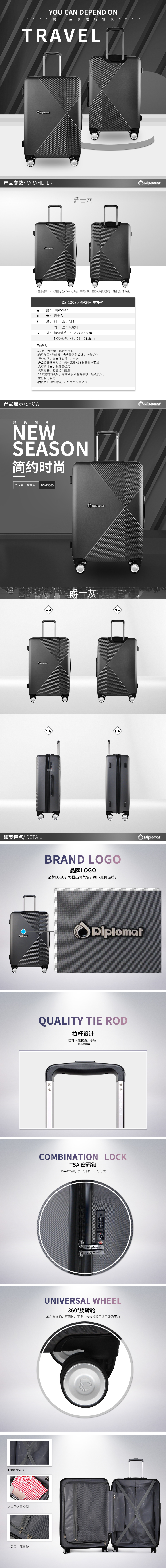 Diplomat外交官爵士灰万向轮行李箱 拉杆箱DS-13080 黑色 26英寸