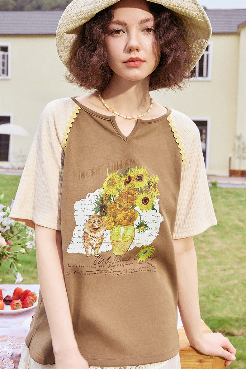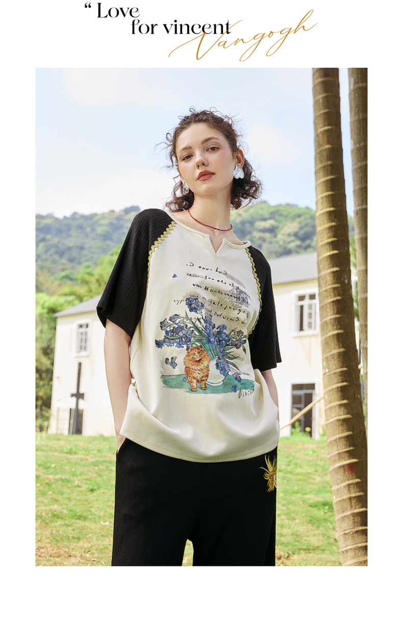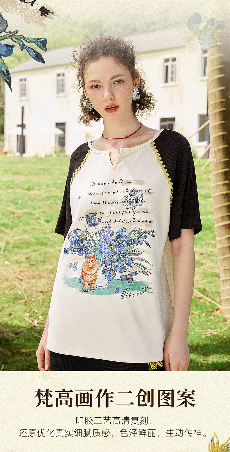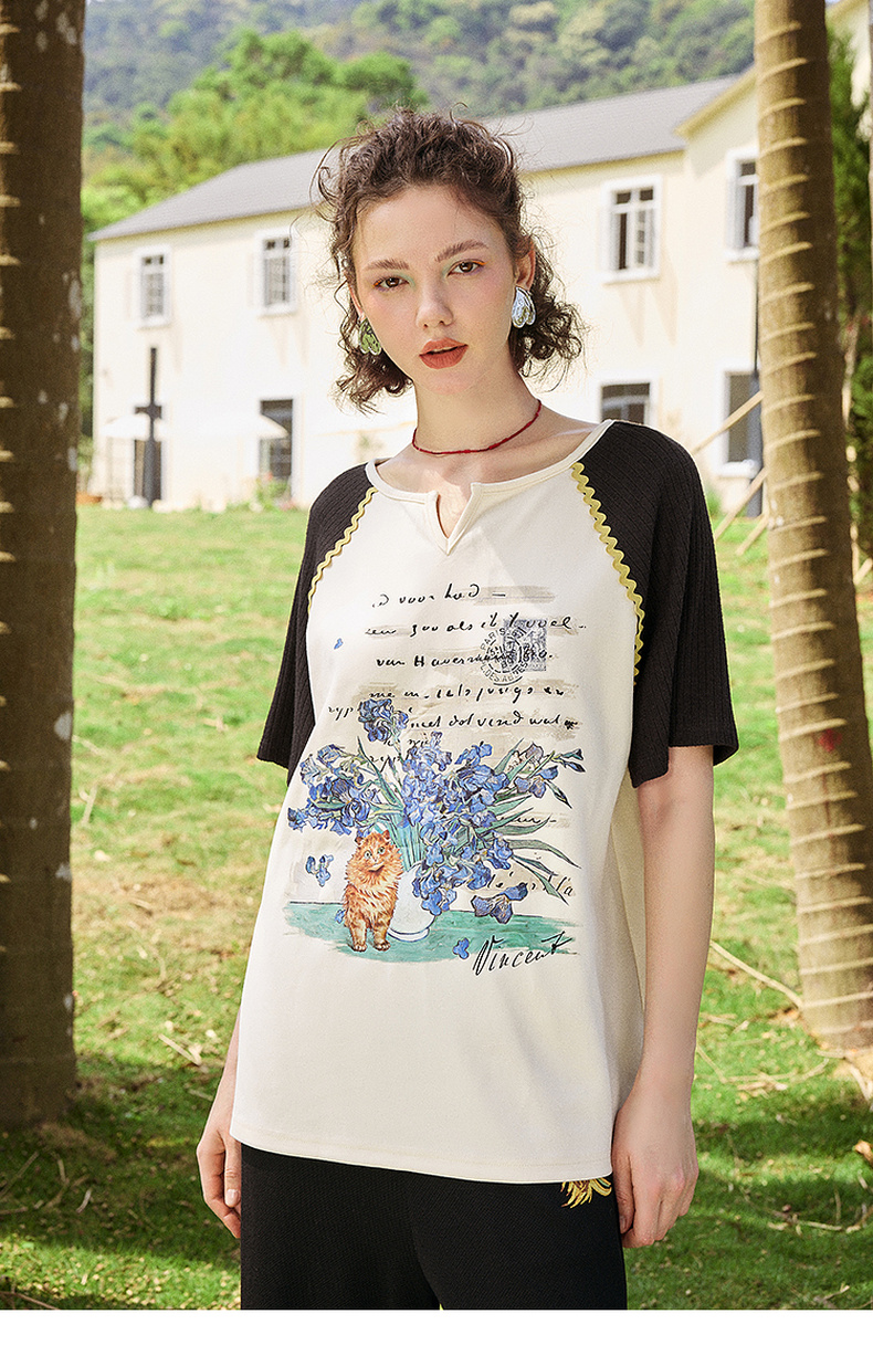 两三事梵高文艺夏风微凉2024夏季新款休闲印花拼色短袖t恤女宽松