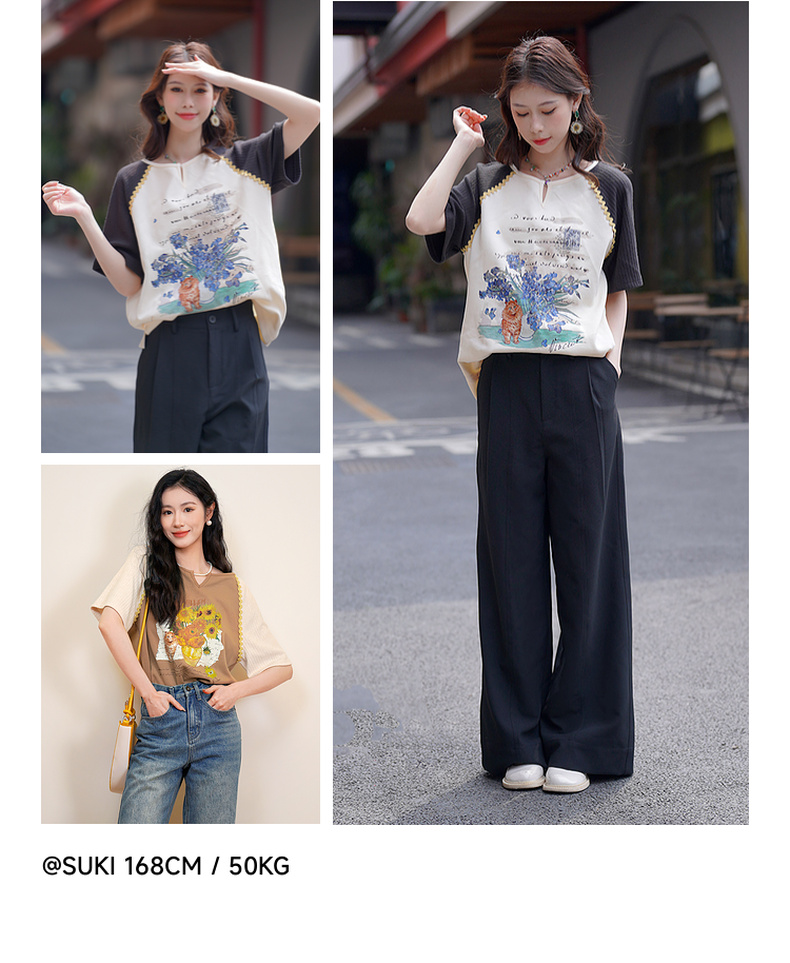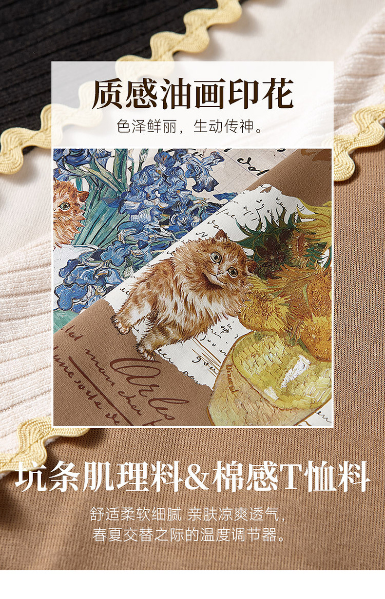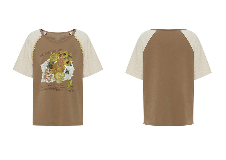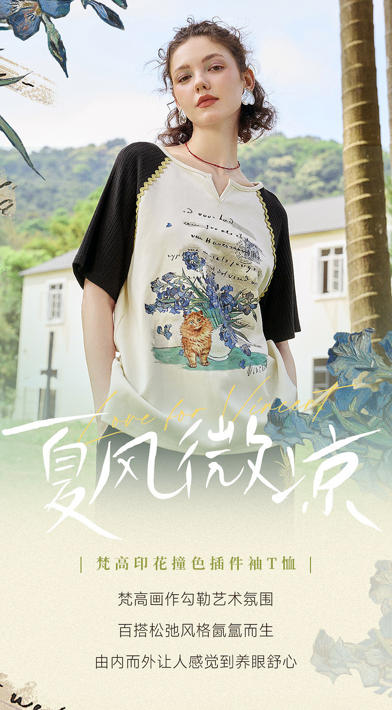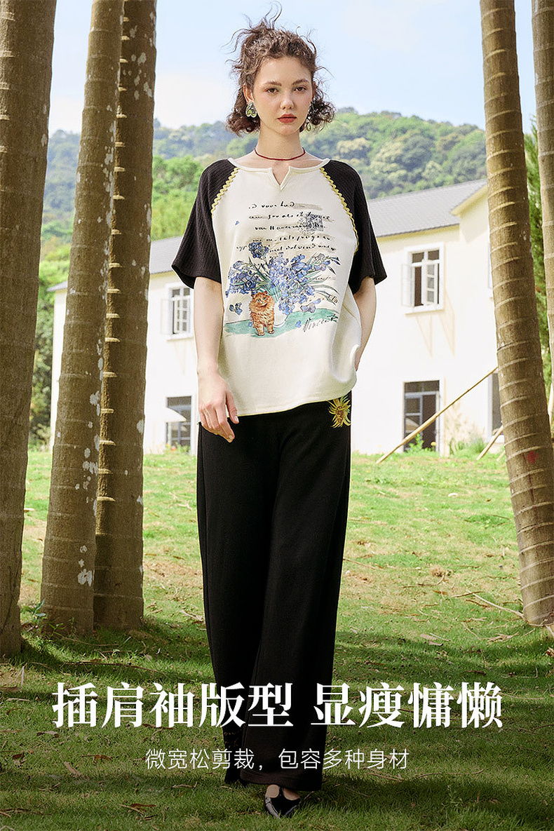 两三事梵高文艺夏风微凉2024夏季新款休闲印花拼色短袖t恤女宽松