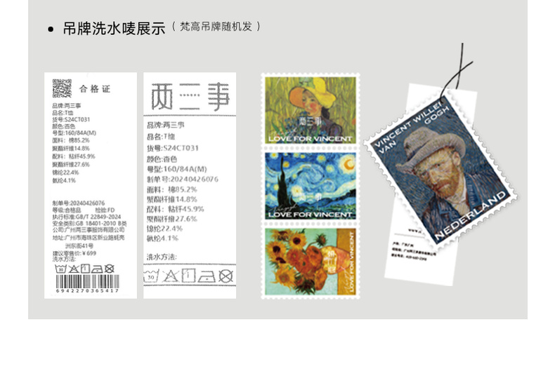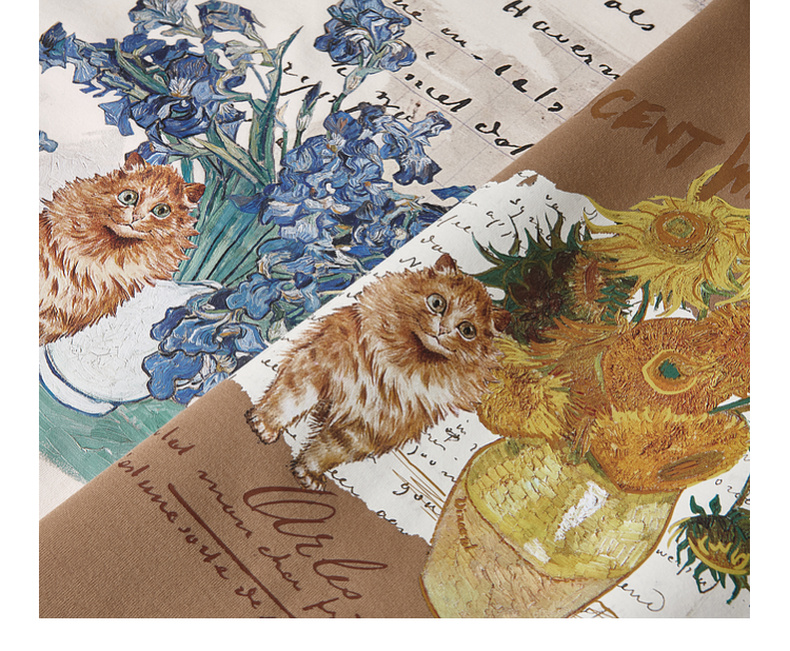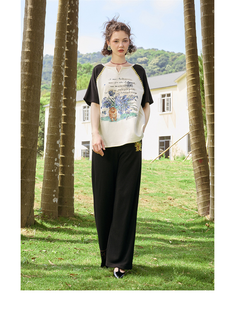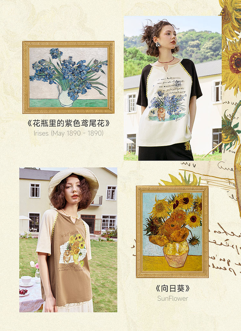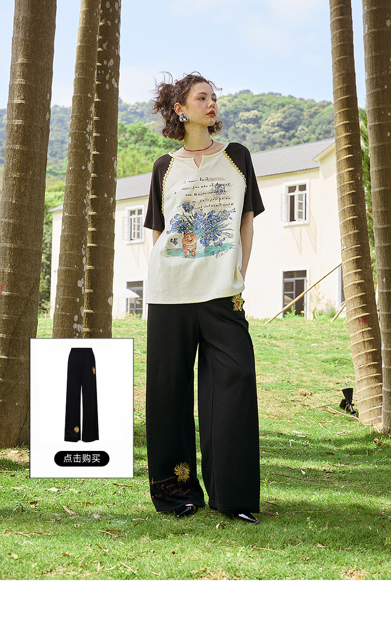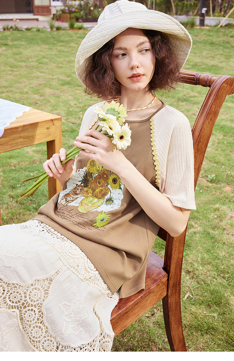 两三事梵高文艺夏风微凉2024夏季新款休闲印花拼色短袖t恤女宽松