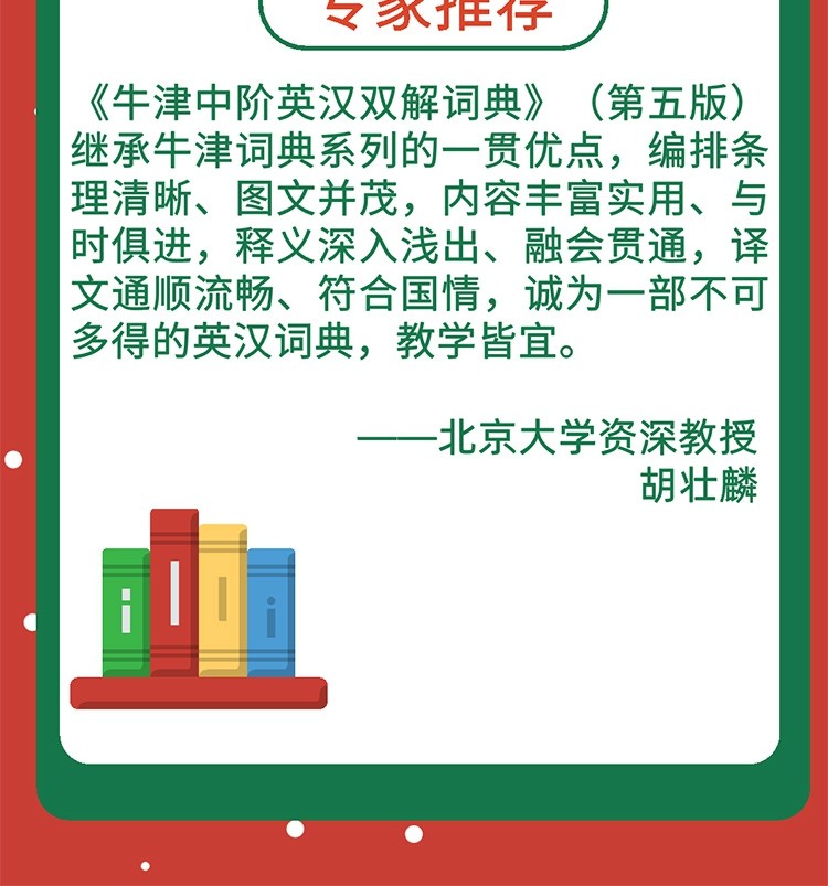 《牛津中阶英汉双解词典(第5版)》继承牛津词典系列的一贯优点,编排条理清晰、图文并茂,内容丰富实用、与时俱进,释义深入浅出、融会贯通,译文通顺流畅、符合国情,诚为一部不可多得的英汉词典,教学皆宜。