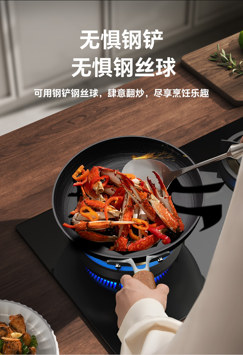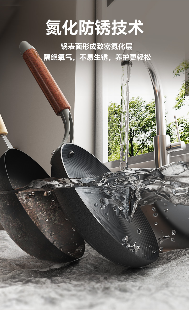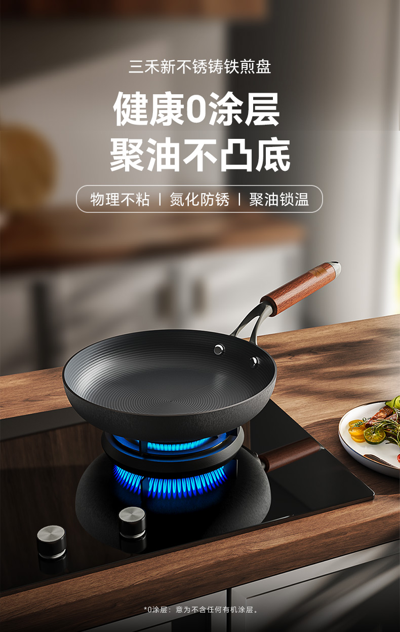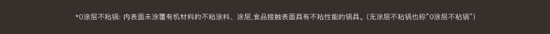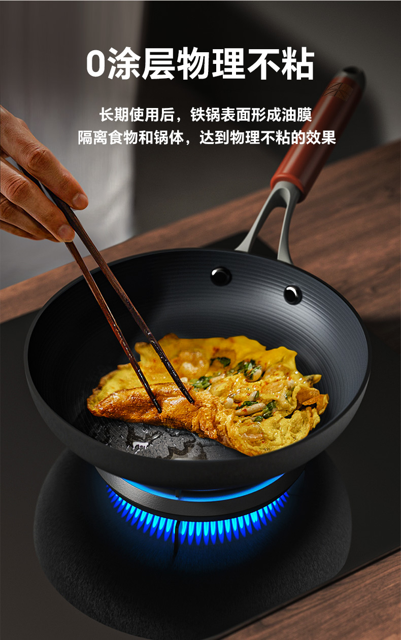 注意:非不粘锅,0涂层长期使用可达到物理不粘