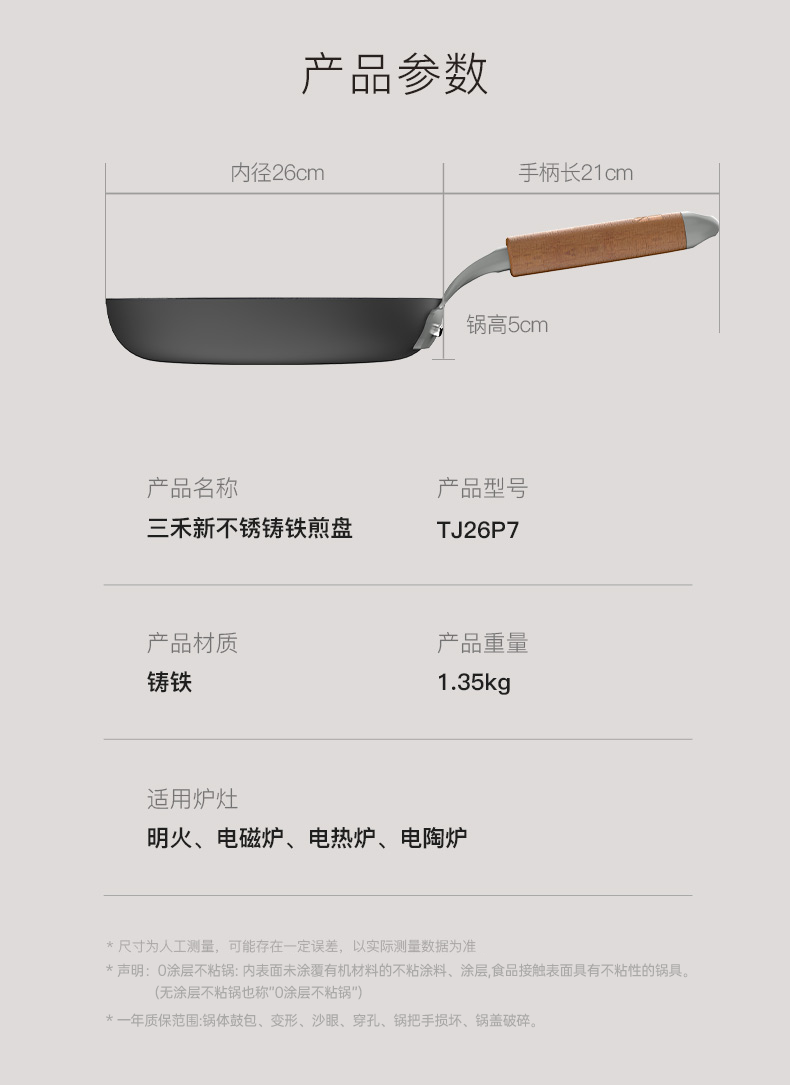 三禾0涂层铸铁煎盘平底煎锅26cm