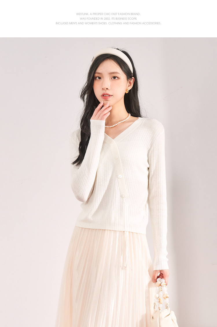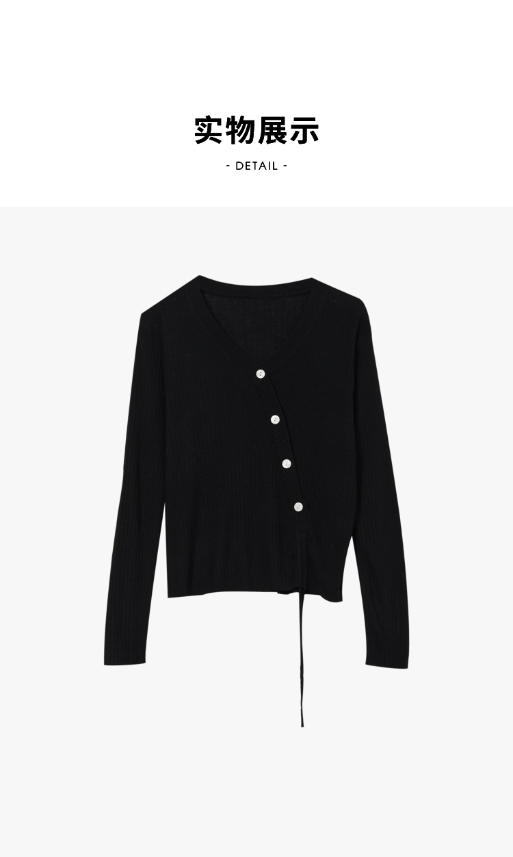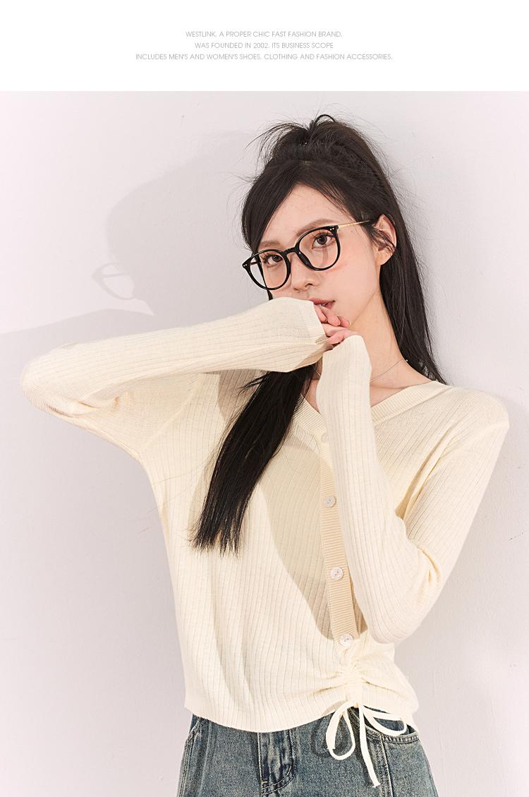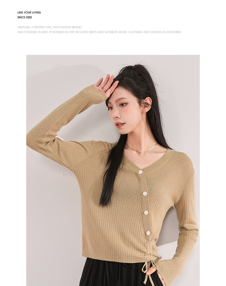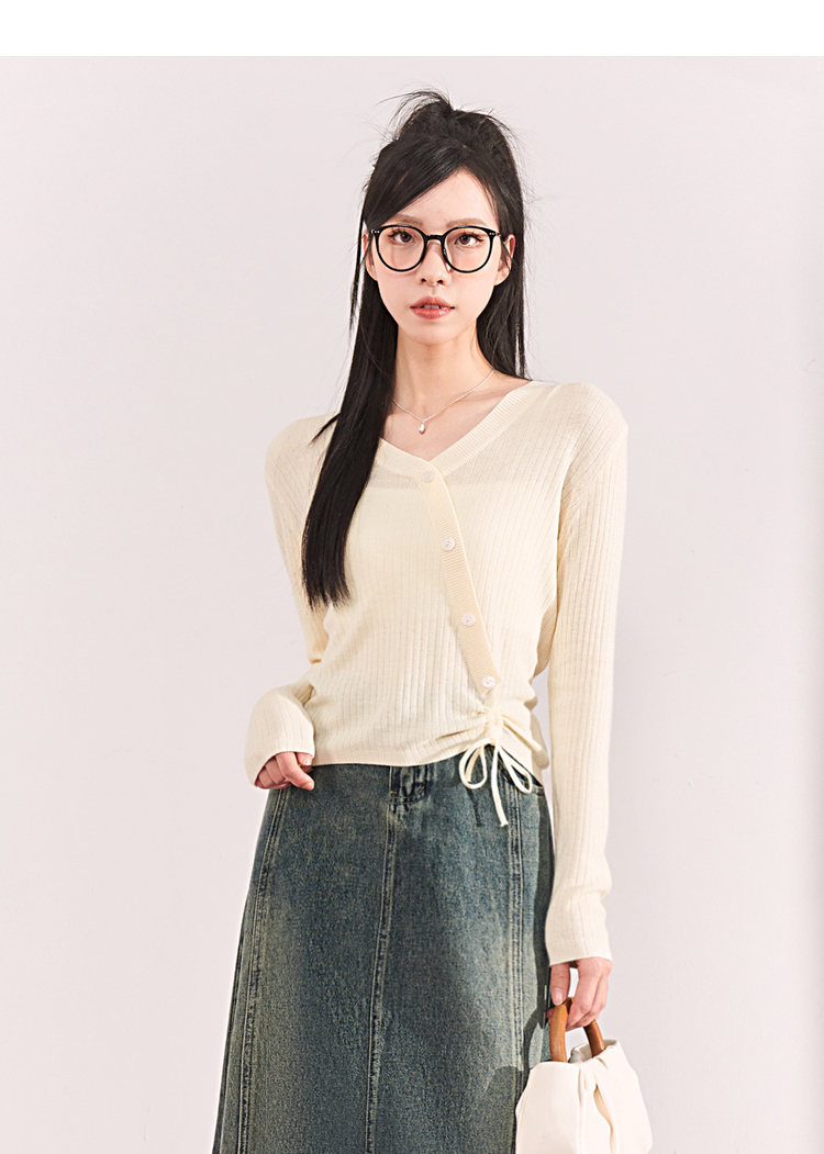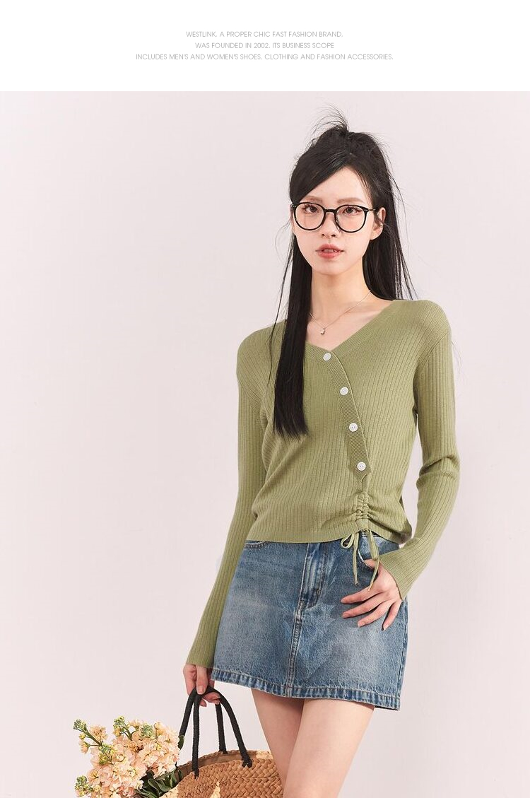 西遇薄款针织衫女2023春夏新款不规则设计感短款收腰V领长袖上衣10030918