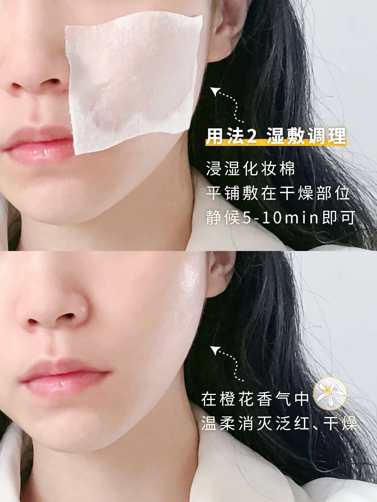 步骤:柔肤水浸湿化妆棉,平铺敷在干燥部位,静候5-10min即可。建议一周2-3次。