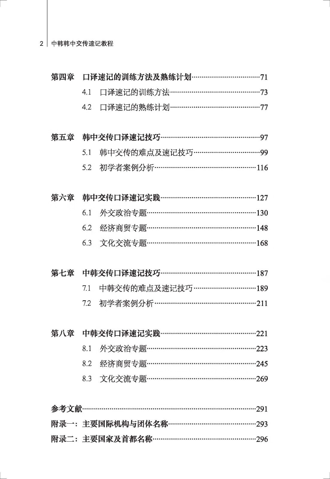 《中韩韩中交传速记教程》是一本以中韩、韩中口译为主要内容,综合交传理论、速记技巧以及丰富实例的教材。全书从理论到实践分为八个章节,兼具专业性、方法性和实用性,可作为韩语翻译类的专业教材或自学教程。本书内容包含三个部分:1. 根据交替传译的基本特征制定口译的评价标准,分析速记与口译质量的关系,具体介绍速记的要领和训练方法,制定阶段性练习计划。2. 分别介绍韩中、中韩交传的难点及速记技巧,分析初学者的口译特征及主要问题。3. 通过外交政治、经济贸易及文化交流三个领域的讲话稿,介绍韩中、中韩交传中“听”“记”“译”三个阶段的具体处理方法和技巧,并做具体分析与点评。此外书后还附有“国际机构与团体名称”“国家及首都名称”两大实用附录,供学习者参考。